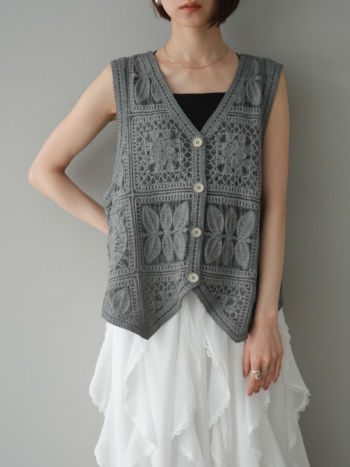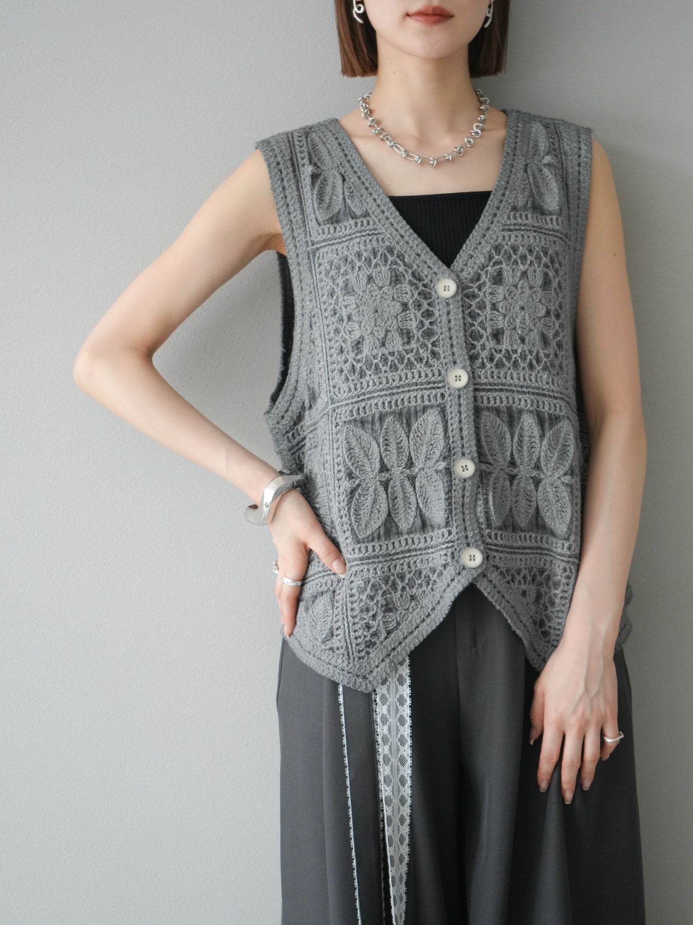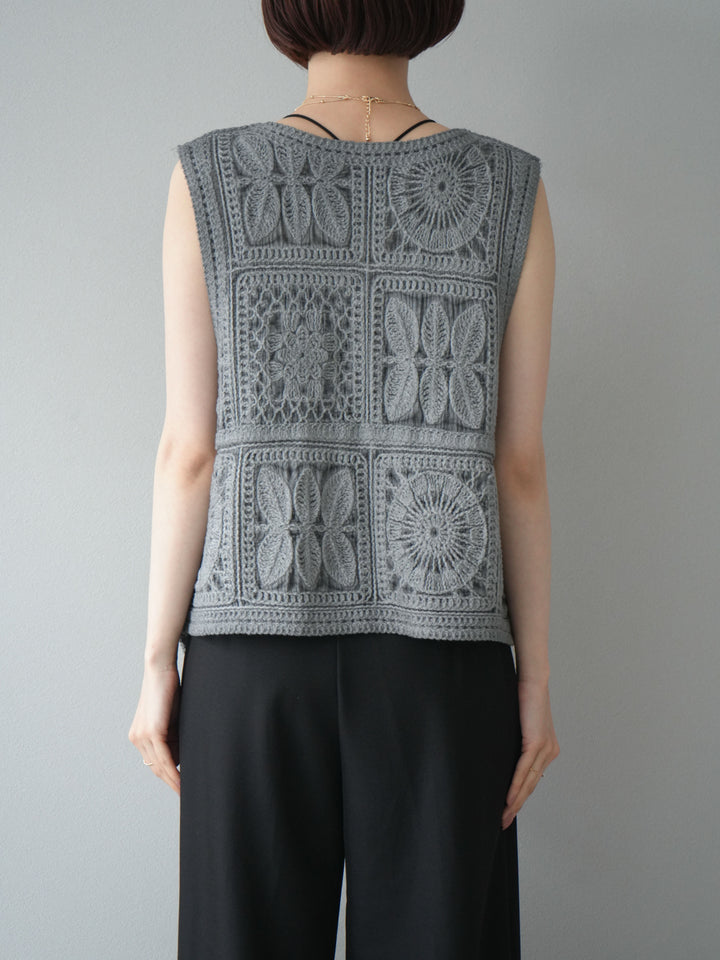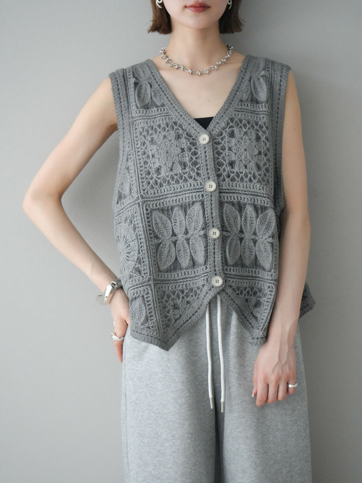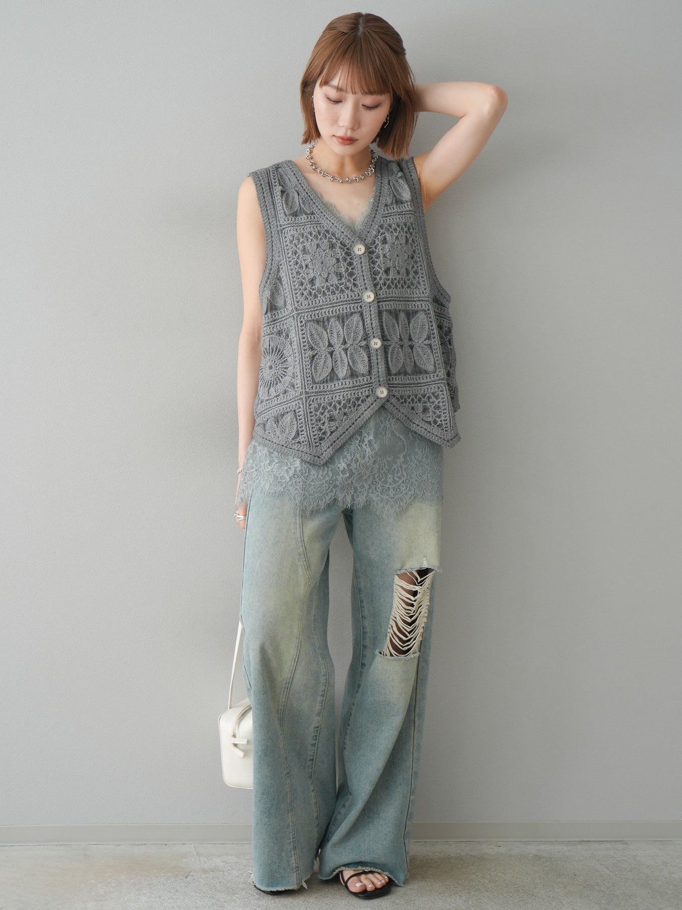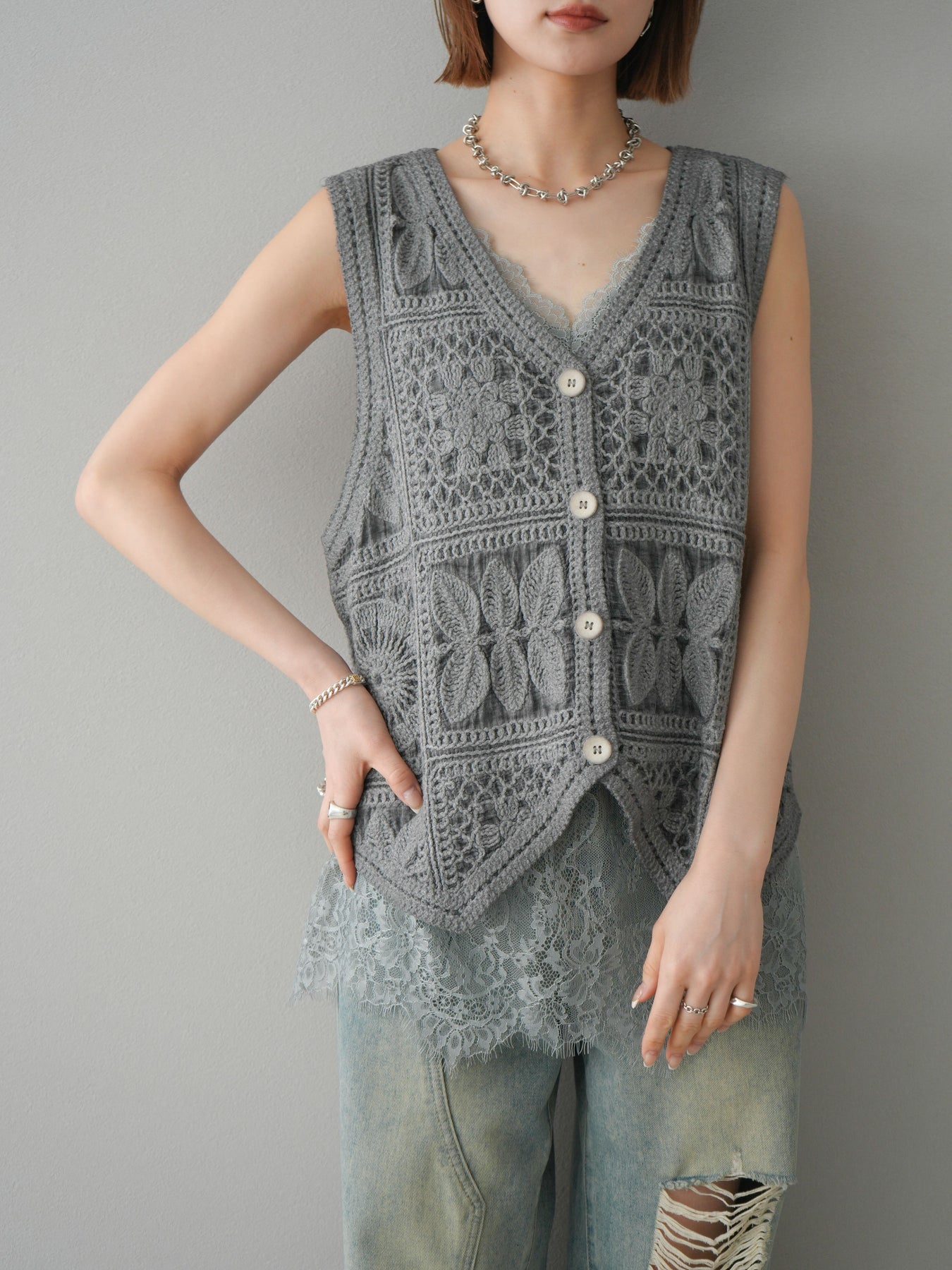 トレンドのクロシェ編みを取り入れたジレが登場。繊細な編み模様が魅力で、ナチュラルながらも程よく個性を演出します。フロントのボタンデザインがアクセントになり、開けても閉めても着こなしを楽しめるのがポイント。シンプルなインナーとレイヤードするだけで、こなれたスタイリングが完成。ワンピースやTシャツとの相性も抜群で、幅広いコーディネートに活躍するアイテムです。 ※ボトムス、キャミソール(インナー)以外の商品は一律でインナーは付属していません