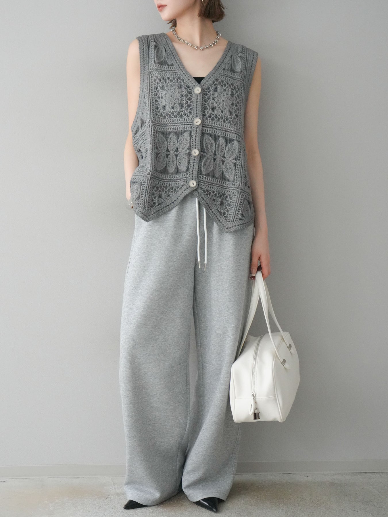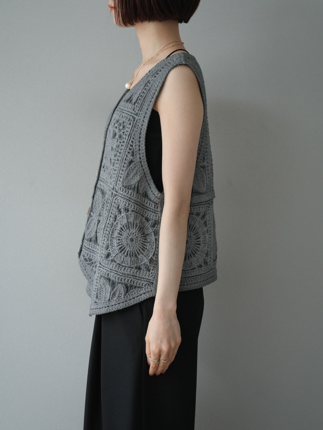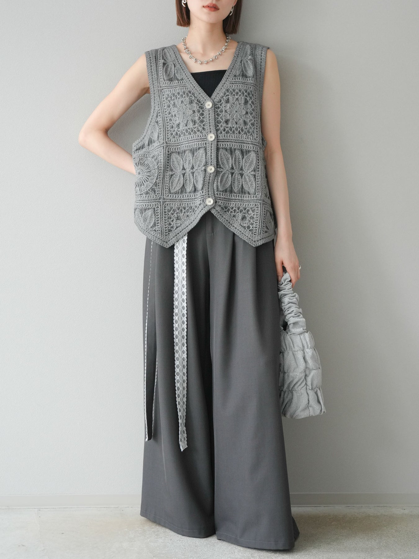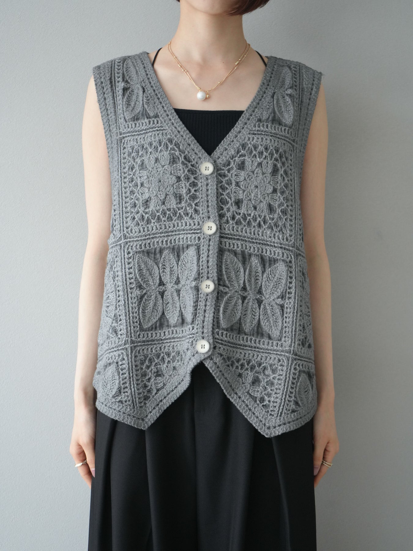 トレンドのクロシェ編みを取り入れたジレが登場。繊細な編み模様が魅力で、ナチュラルながらも程よく個性を演出します。フロントのボタンデザインがアクセントになり、開けても閉めても着こなしを楽しめるのがポイント。シンプルなインナーとレイヤードするだけで、こなれたスタイリングが完成。ワンピースやTシャツとの相性も抜群で、幅広いコーディネートに活躍するアイテムです。 ※ボトムス、キャミソール(インナー)以外の商品は一律でインナーは付属していません