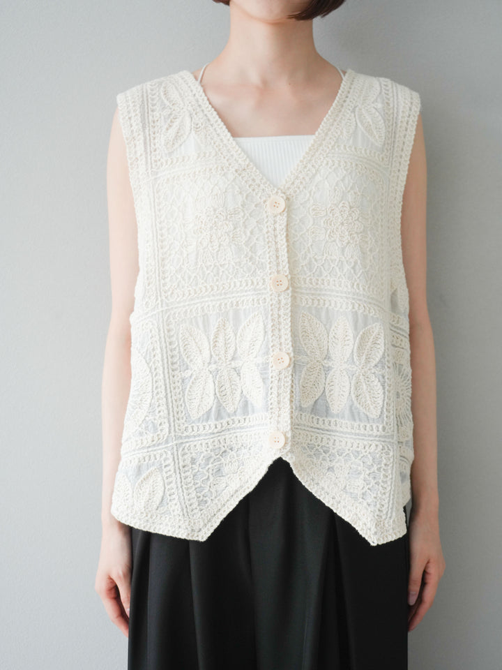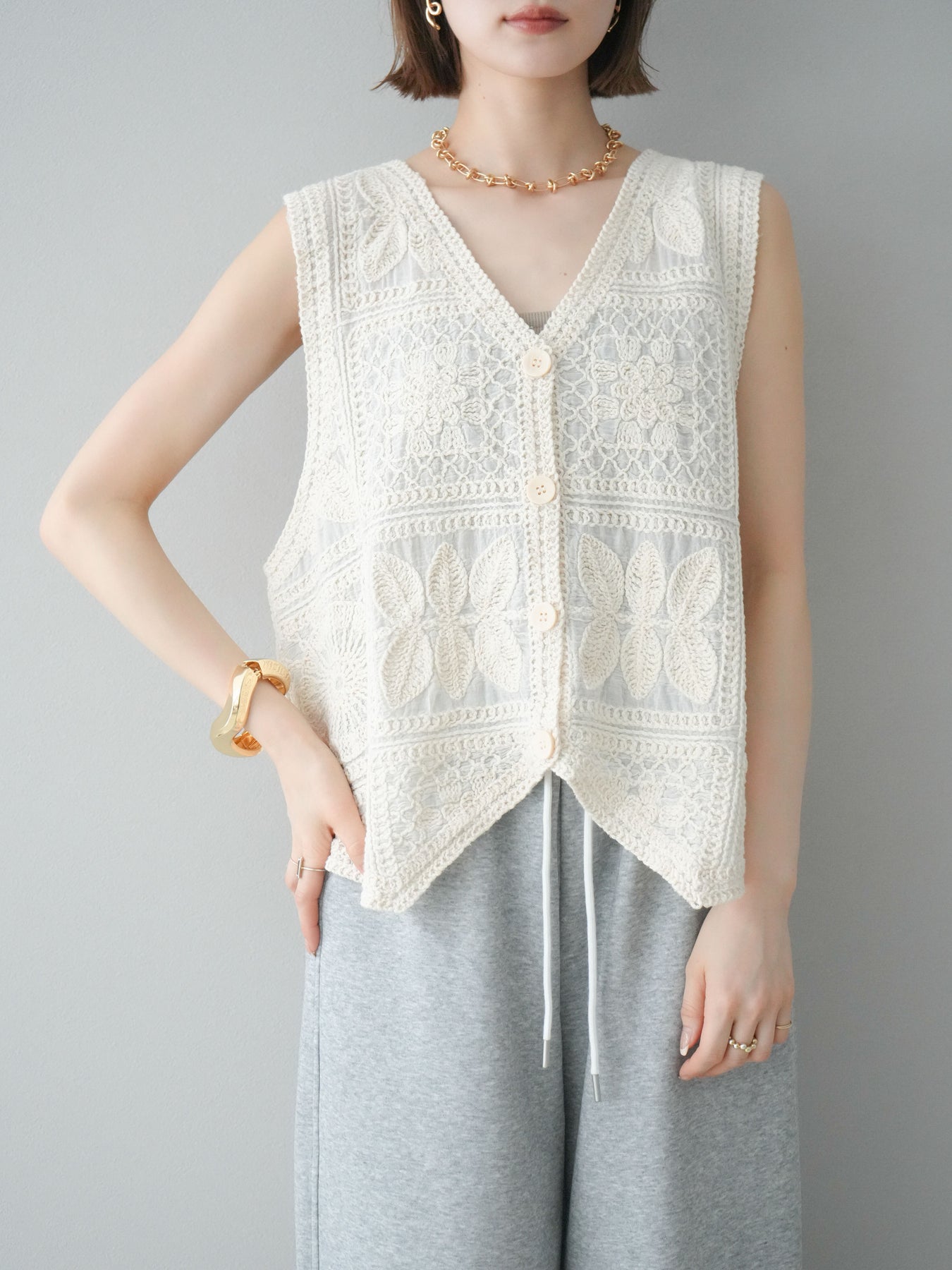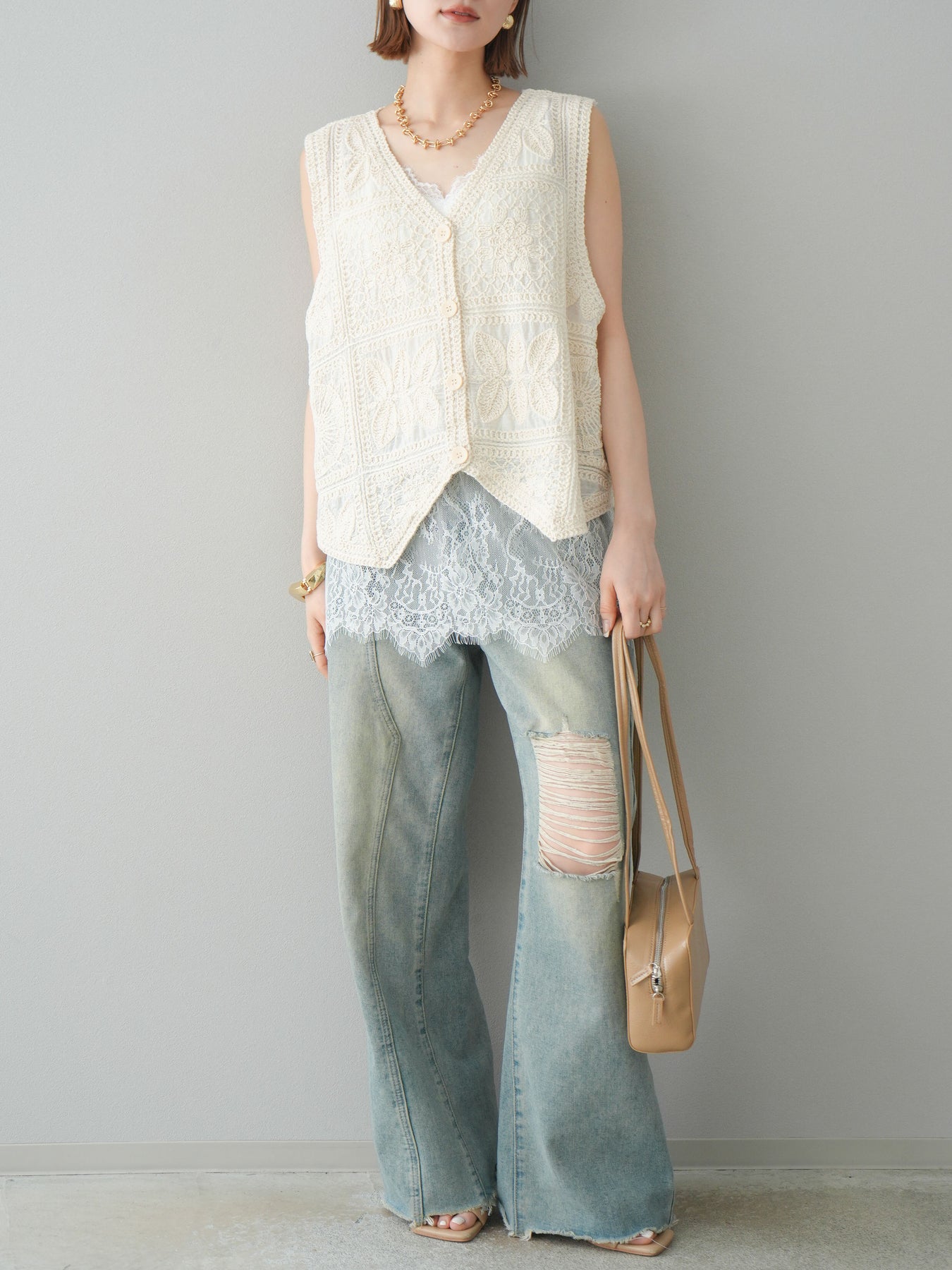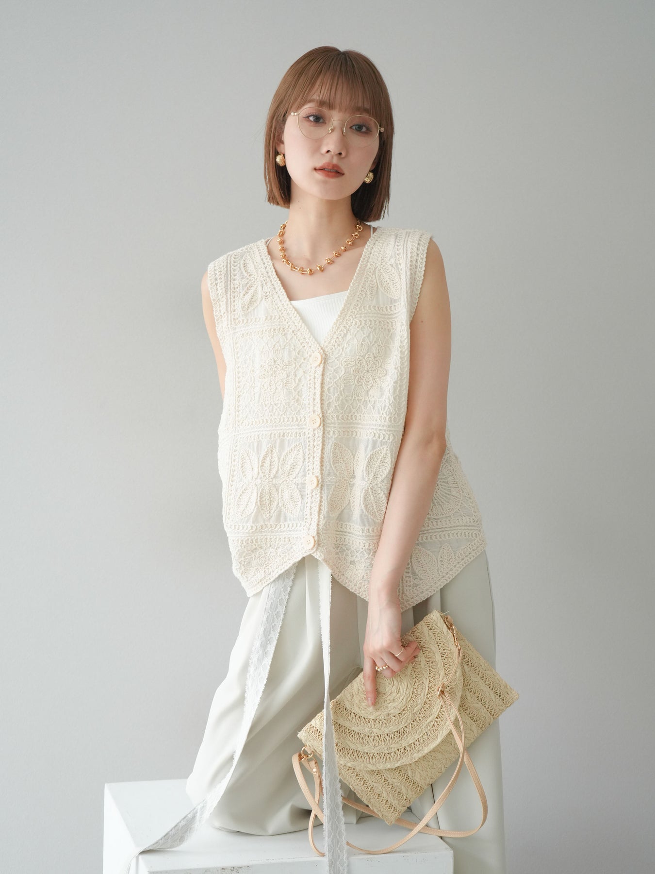 トレンドのクロシェ編みを取り入れたジレが登場。繊細な編み模様が魅力で、ナチュラルながらも程よく個性を演出します。フロントのボタンデザインがアクセントになり、開けても閉めても着こなしを楽しめるのがポイント。シンプルなインナーとレイヤードするだけで、こなれたスタイリングが完成。ワンピースやTシャツとの相性も抜群で、幅広いコーディネートに活躍するアイテムです。 ※ボトムス、キャミソール(インナー)以外の商品は一律でインナーは付属していません