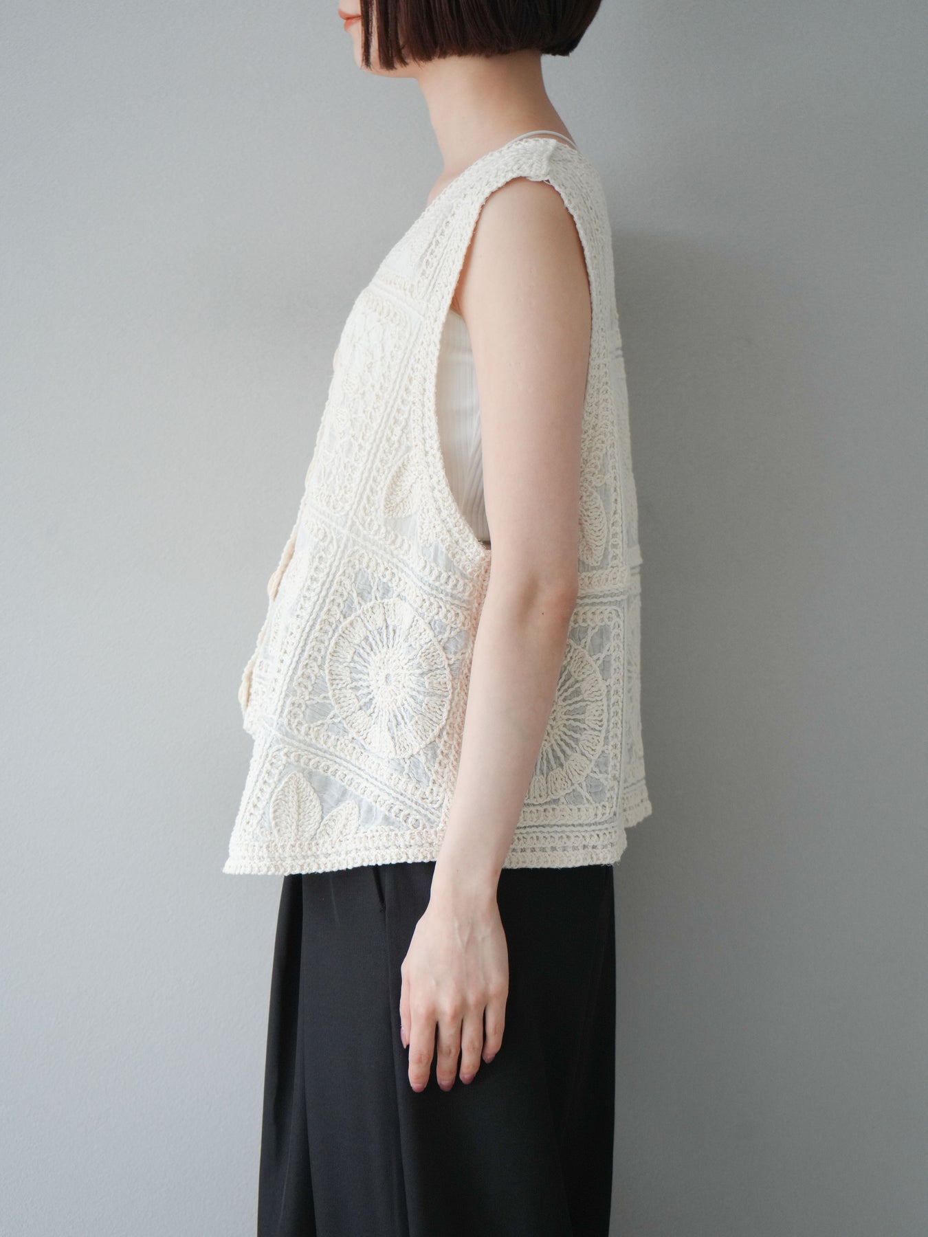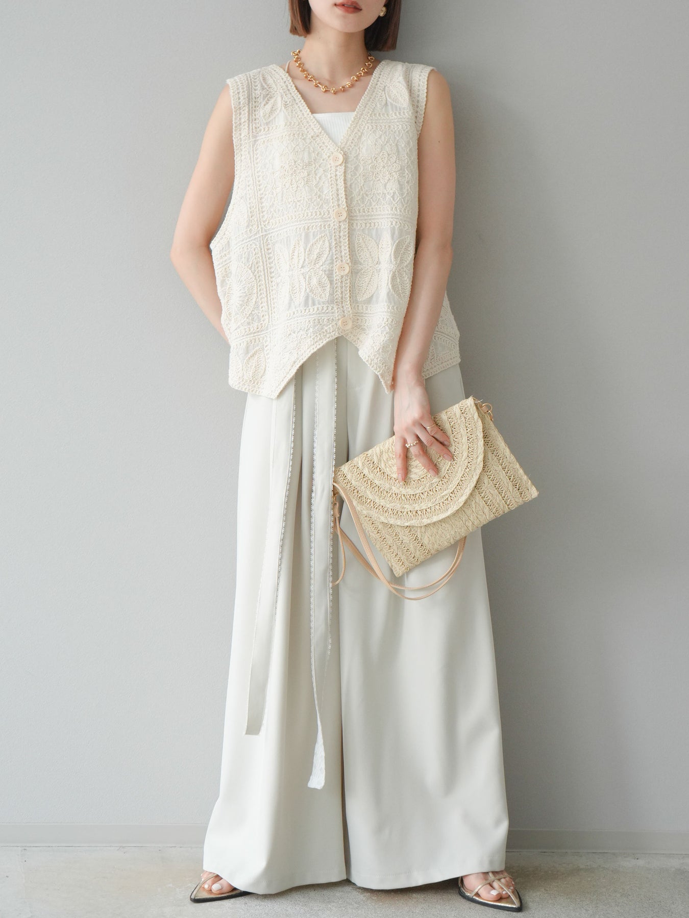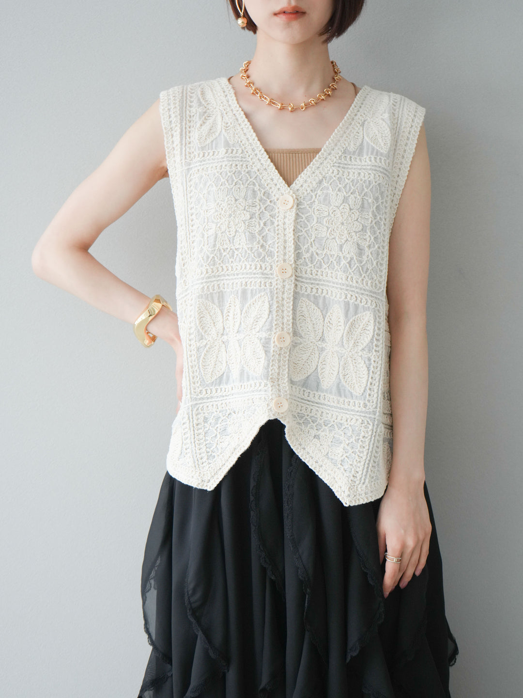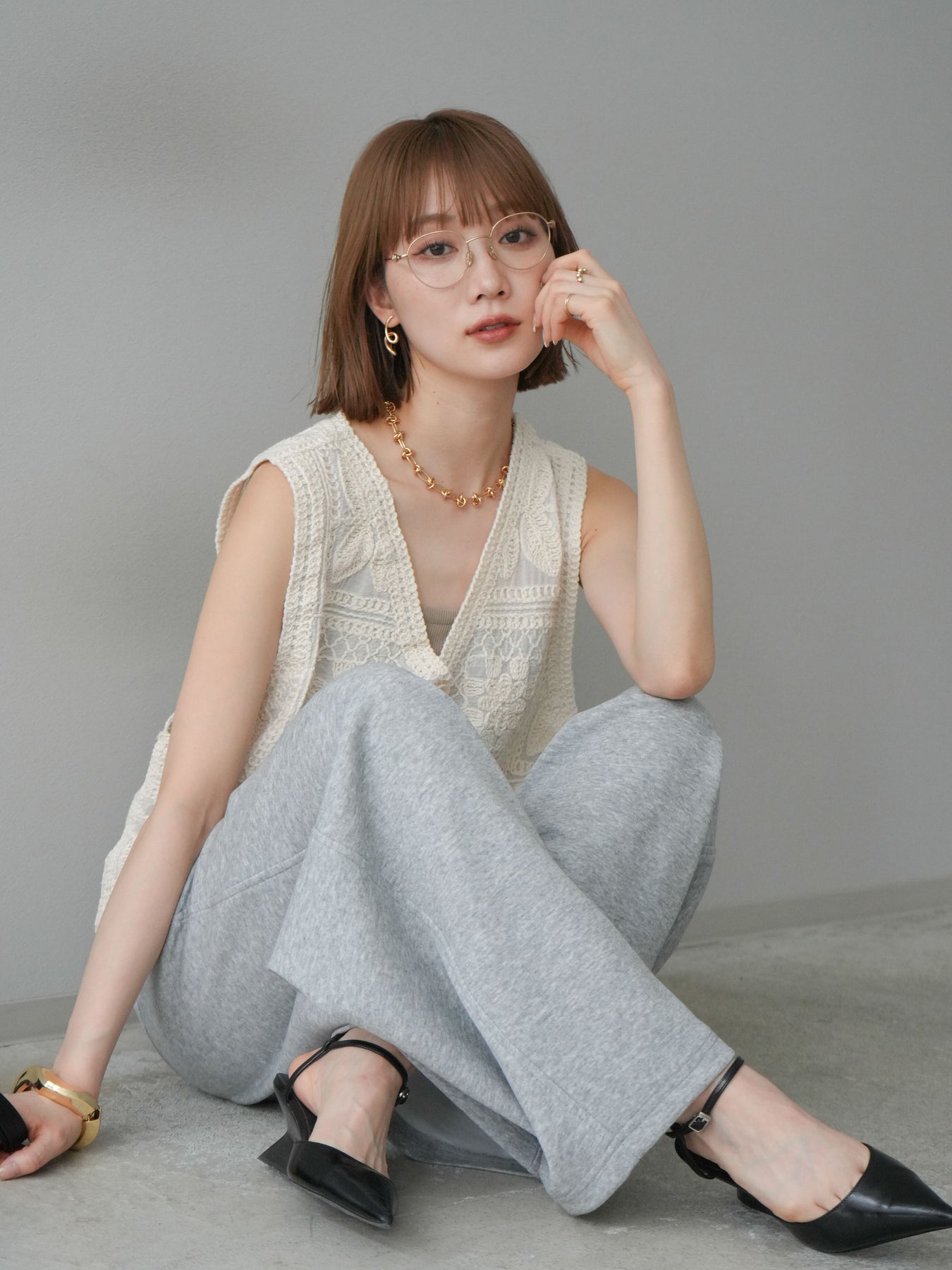 トレンドのクロシェ編みを取り入れたジレが登場。繊細な編み模様が魅力で、ナチュラルながらも程よく個性を演出します。フロントのボタンデザインがアクセントになり、開けても閉めても着こなしを楽しめるのがポイント。シンプルなインナーとレイヤードするだけで、こなれたスタイリングが完成。ワンピースやTシャツとの相性も抜群で、幅広いコーディネートに活躍するアイテムです。 ※ボトムス、キャミソール(インナー)以外の商品は一律でインナーは付属していません