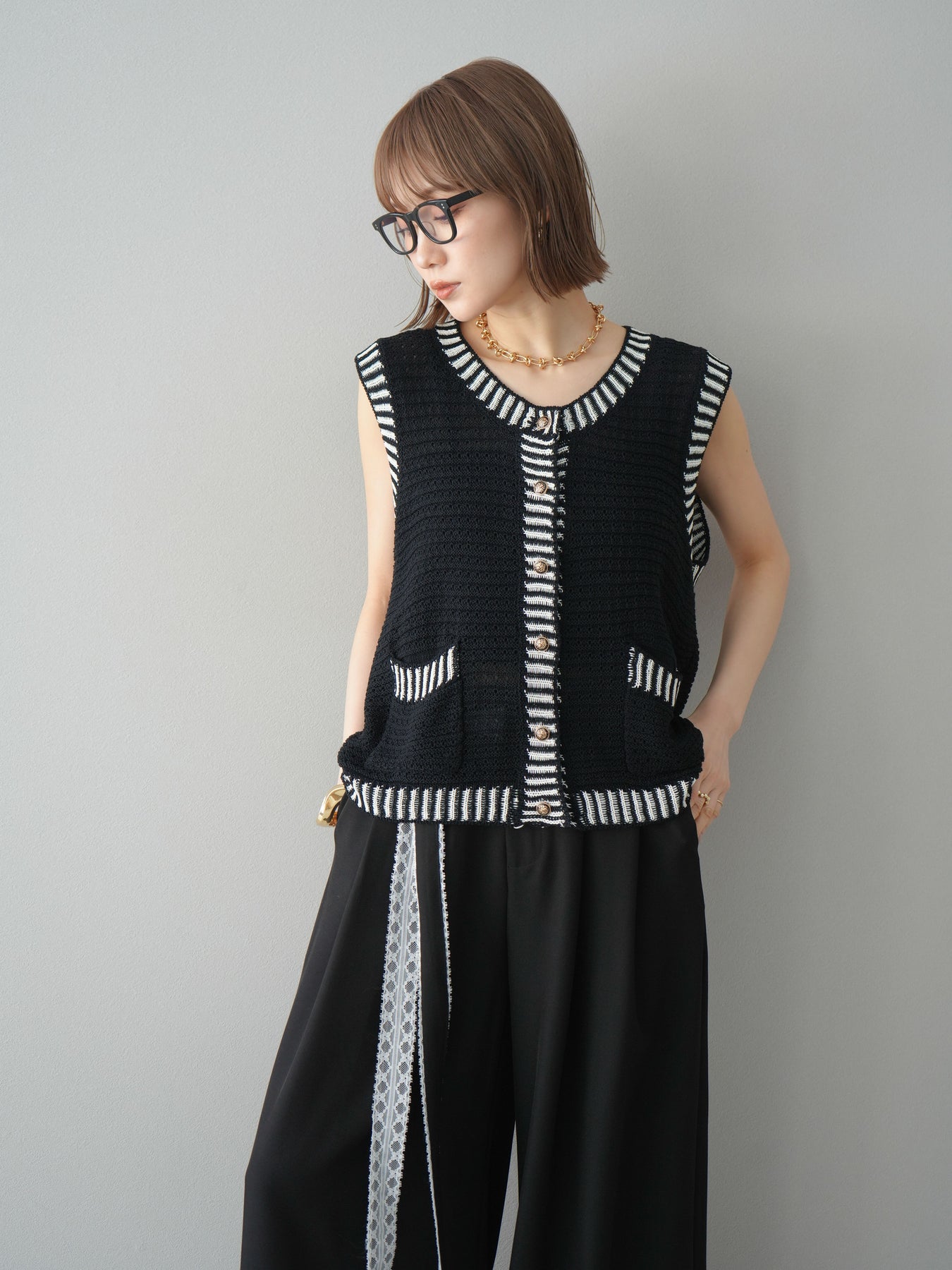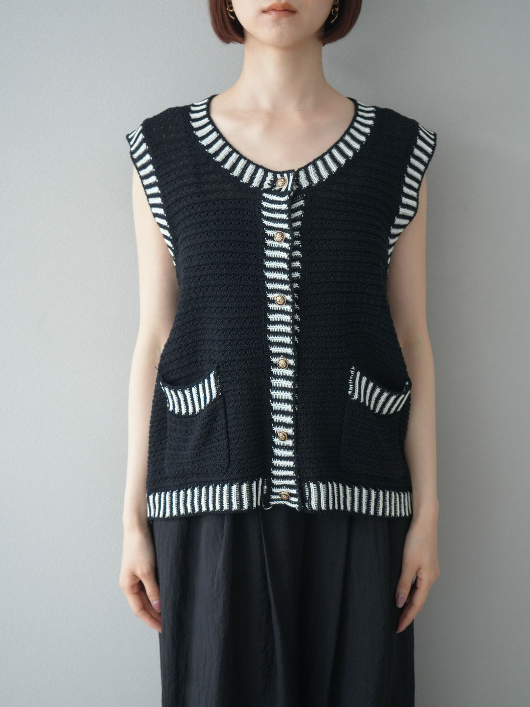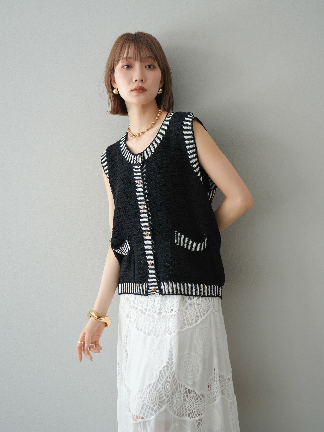 トレンド感のある配色ラインが目を引く、サマーニットベスト。ざっくりとした編み地が軽やかで、季節感たっぷりの1枚です。ゴールドボタンやポケット付きのデザインで、カジュアルながらもきちんと感を演出。Tシャツやワンピースとのレイヤードにぴったりで、こなれた着こなしが叶います。 ※ボトムス、キャミソール(インナー)以外の商品は一律でインナーは付属していません。