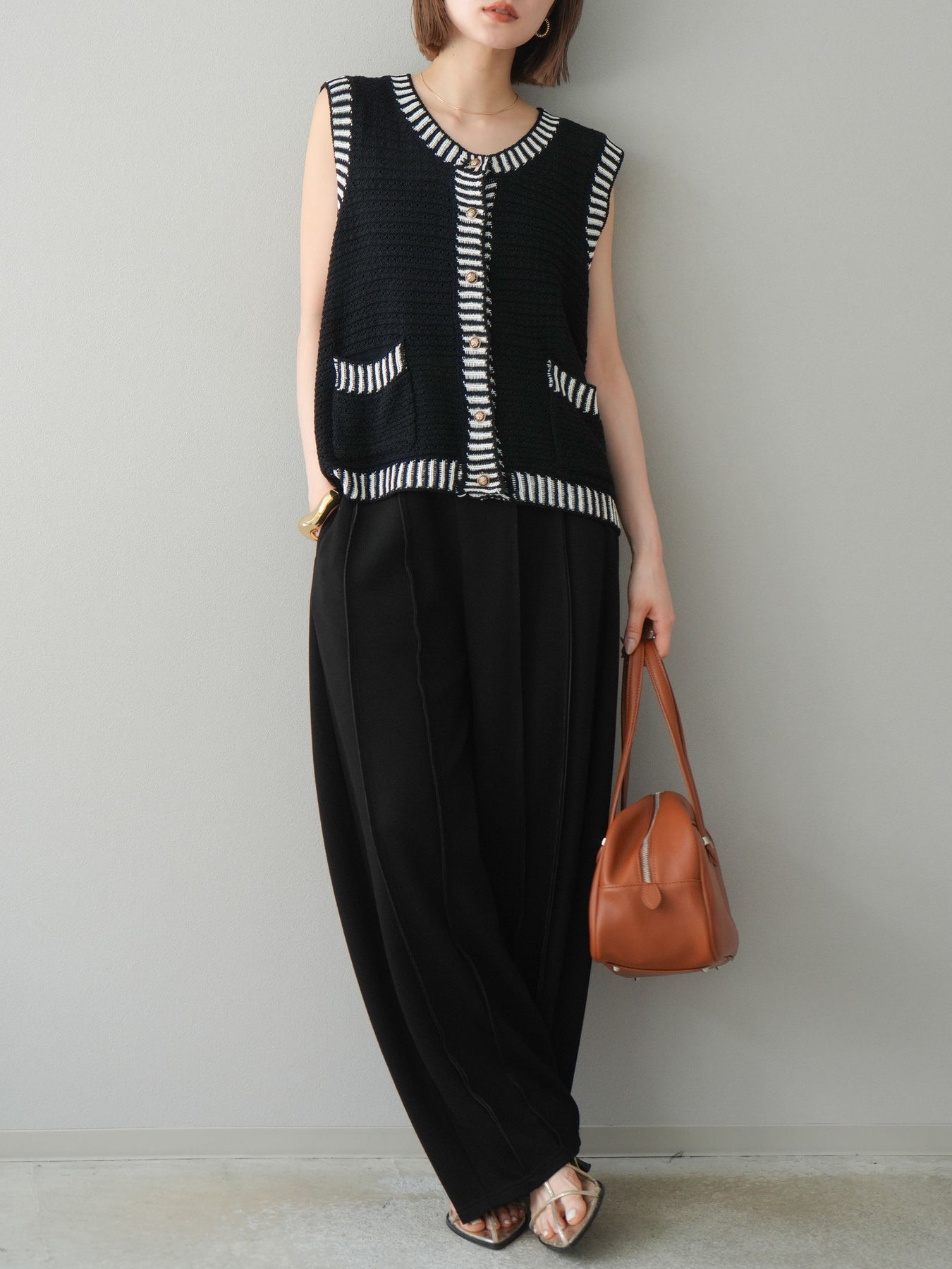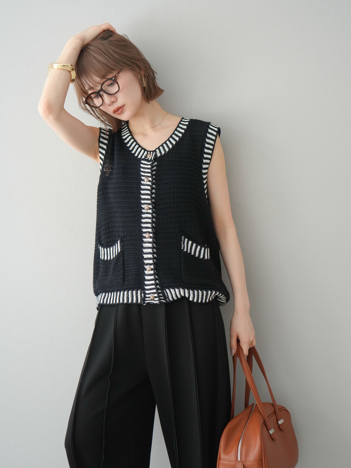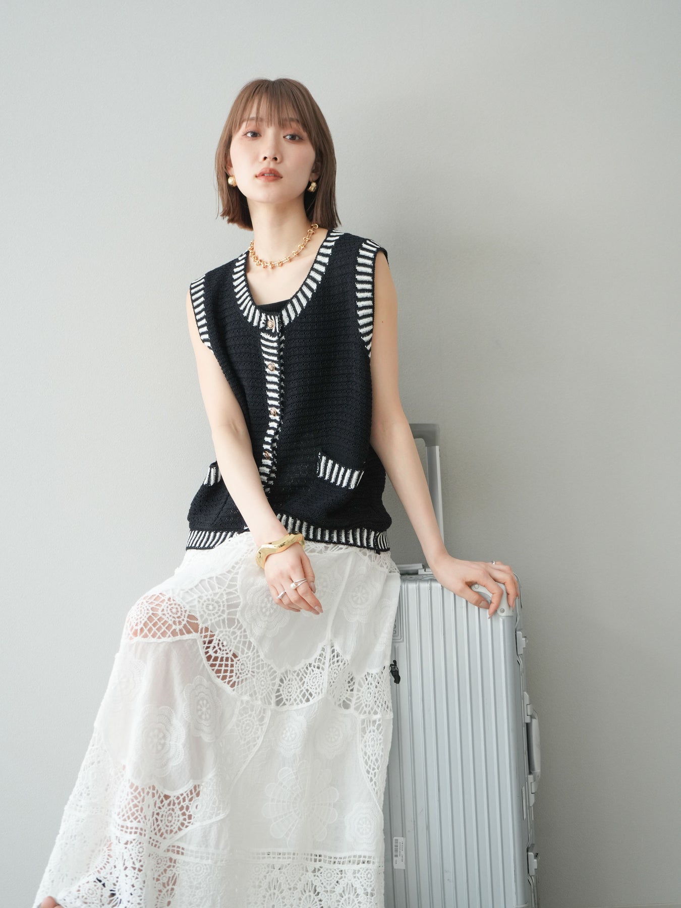 トレンド感のある配色ラインが目を引く、サマーニットベスト。ざっくりとした編み地が軽やかで、季節感たっぷりの1枚です。ゴールドボタンやポケット付きのデザインで、カジュアルながらもきちんと感を演出。Tシャツやワンピースとのレイヤードにぴったりで、こなれた着こなしが叶います。 ※ボトムス、キャミソール(インナー)以外の商品は一律でインナーは付属していません。