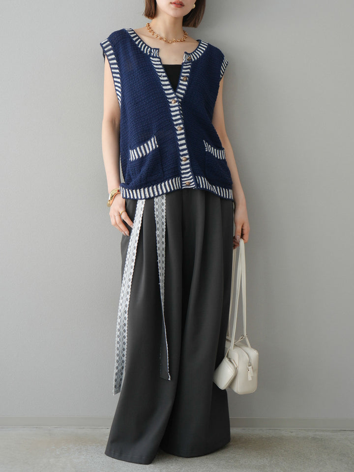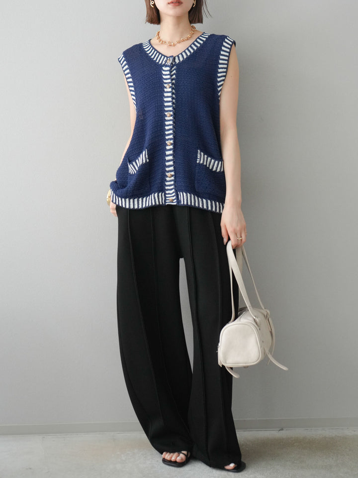 トレンド感のある配色ラインが目を引く、サマーニットベスト。ざっくりとした編み地が軽やかで、季節感たっぷりの1枚です。ゴールドボタンやポケット付きのデザインで、カジュアルながらもきちんと感を演出。Tシャツやワンピースとのレイヤードにぴったりで、こなれた着こなしが叶います。 ※ボトムス、キャミソール(インナー)以外の商品は一律でインナーは付属していません。