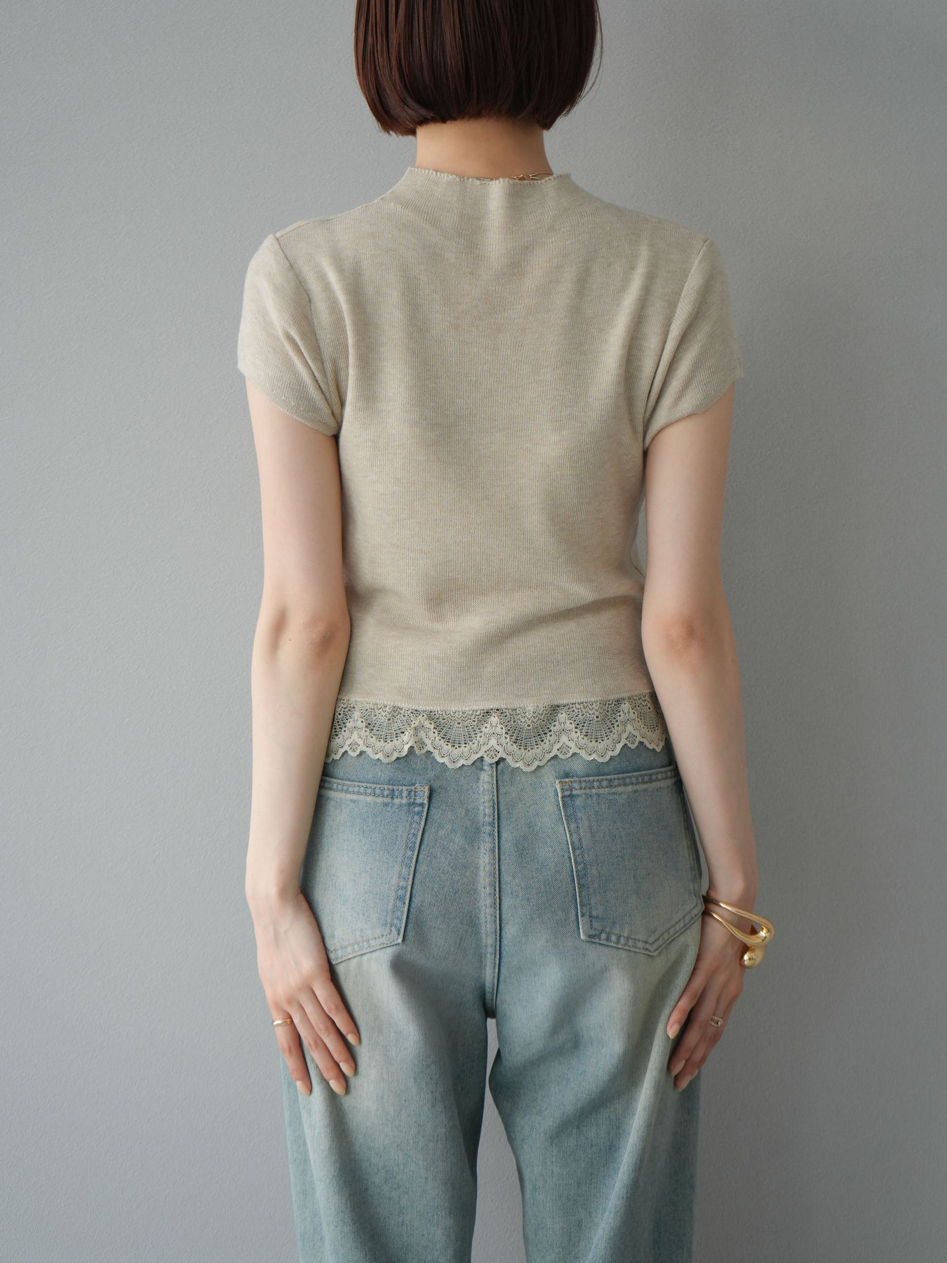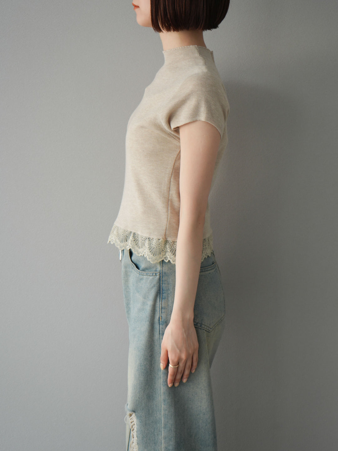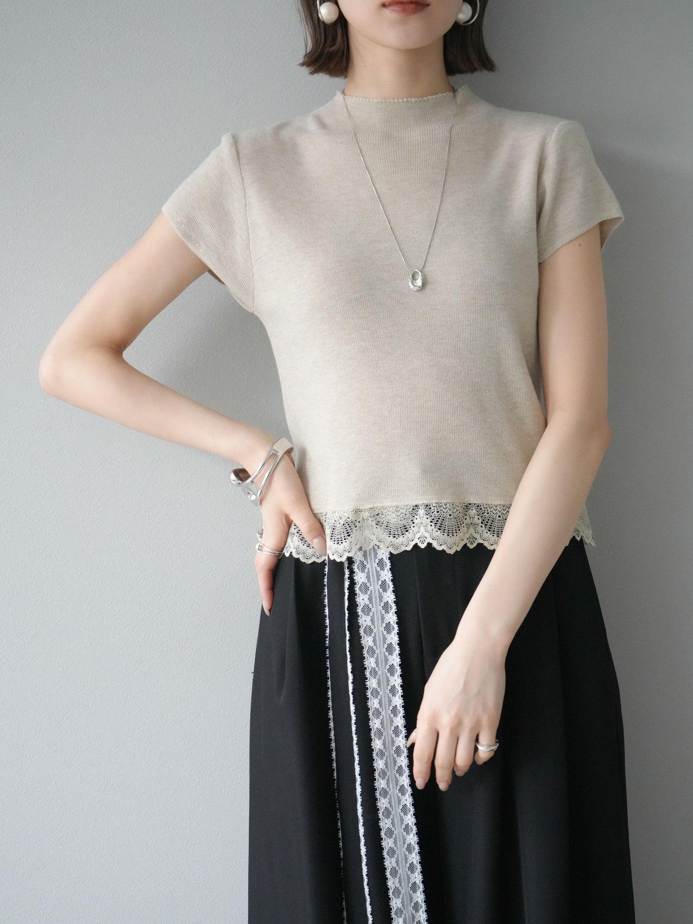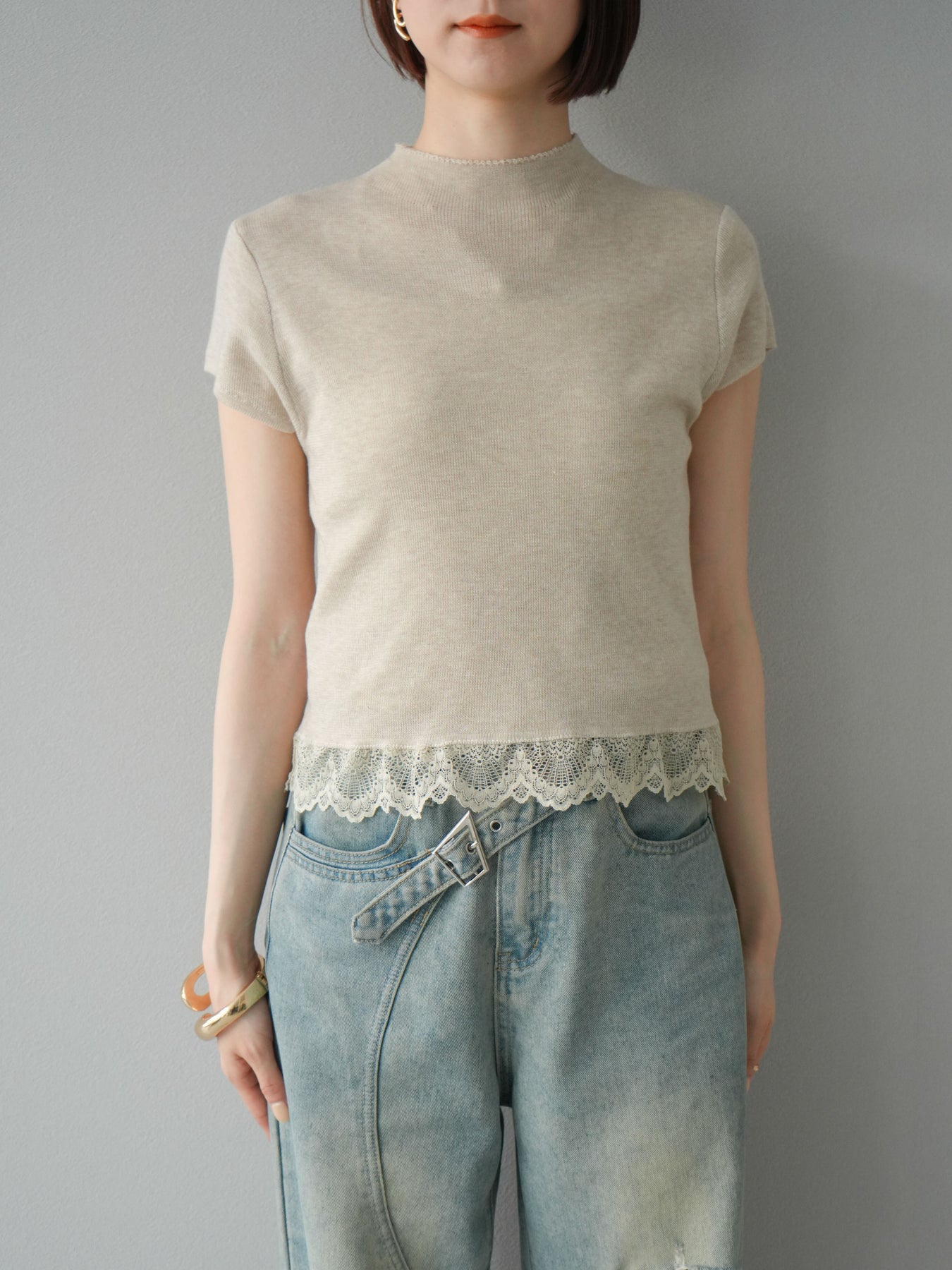 [予約]裾レースプチネックニットトップス/ベージュ