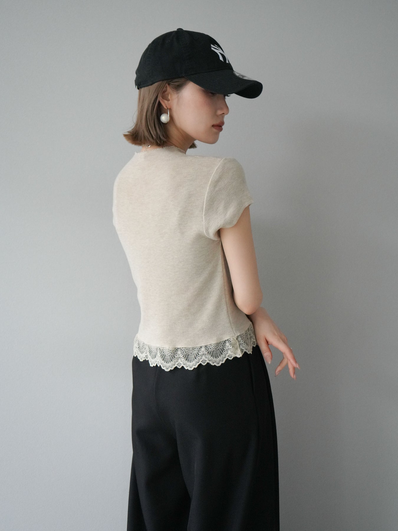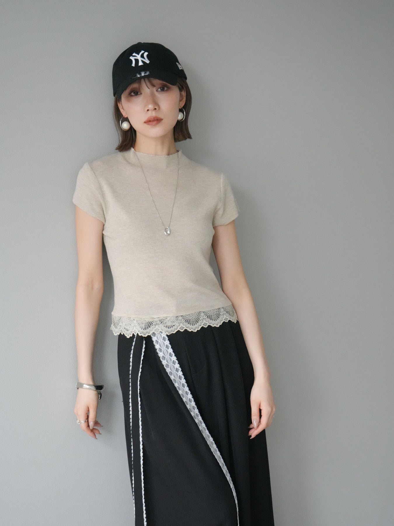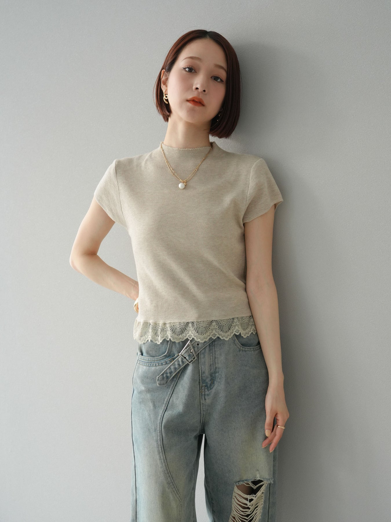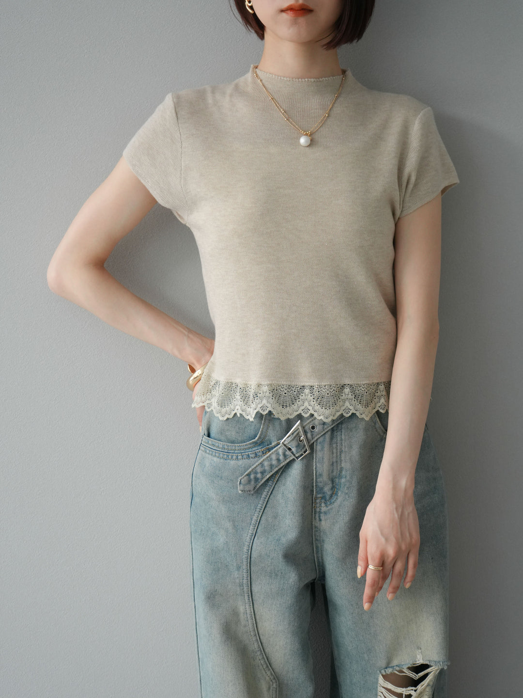 [予約]裾レースプチネックニットトップス/ベージュ