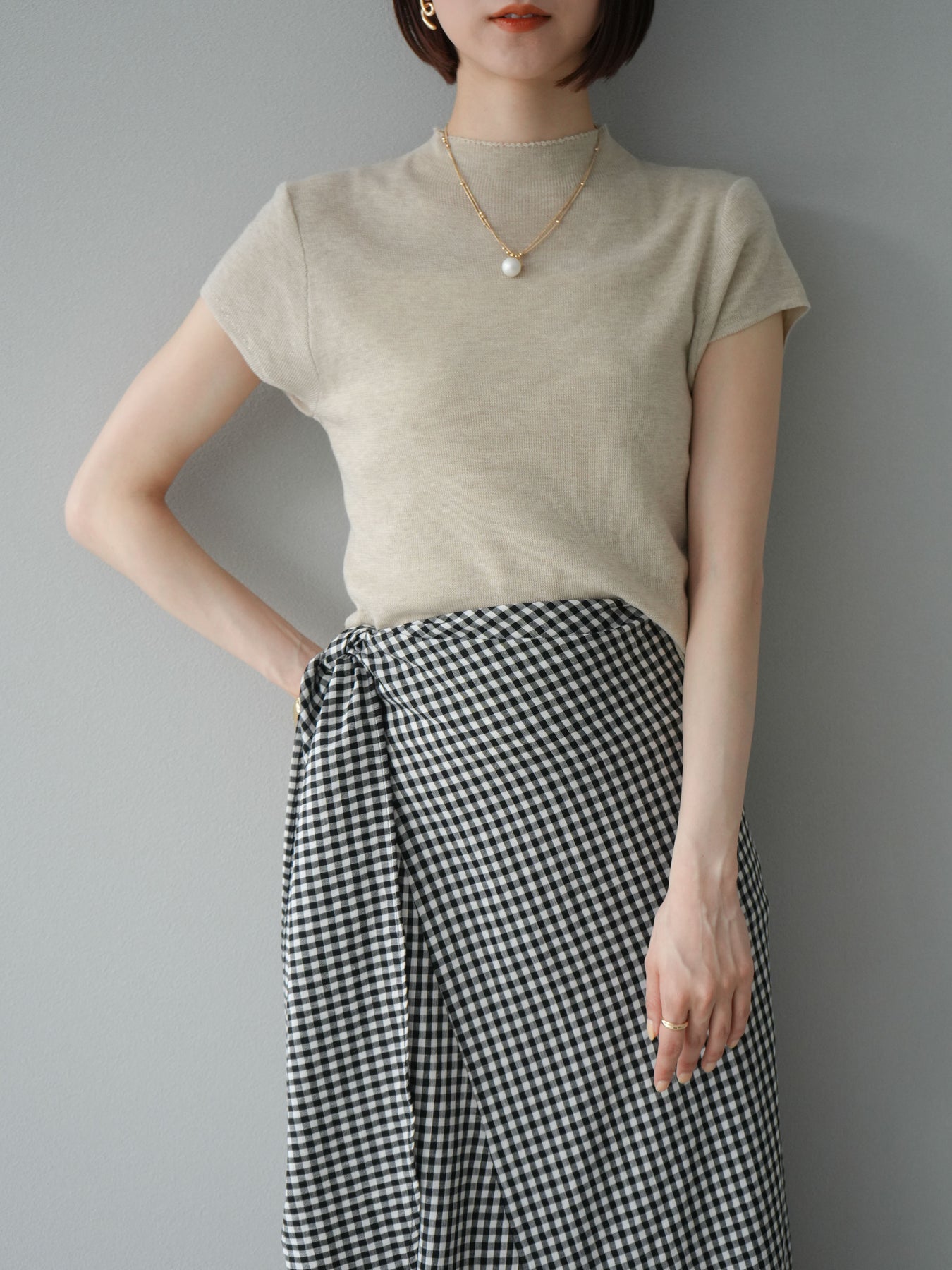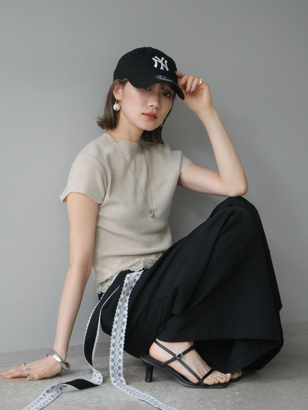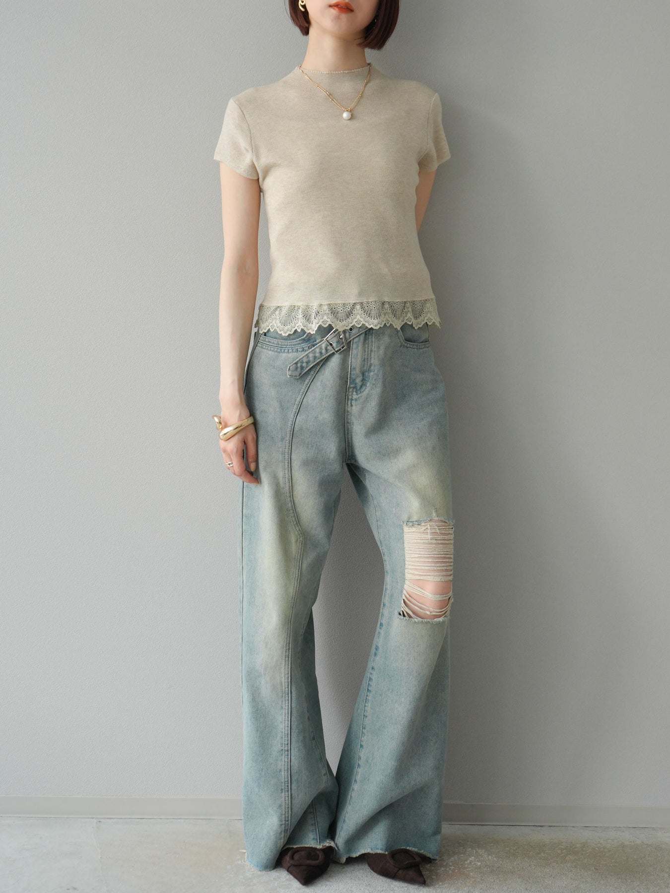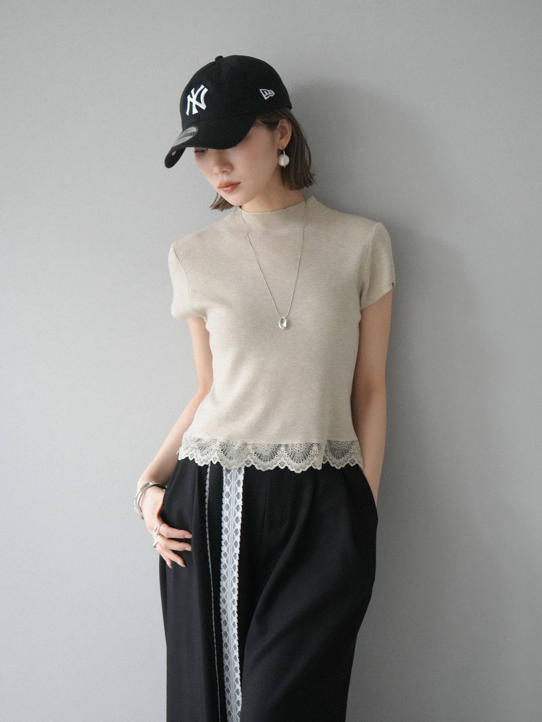 [予約]裾レースプチネックニットトップス/ベージュ