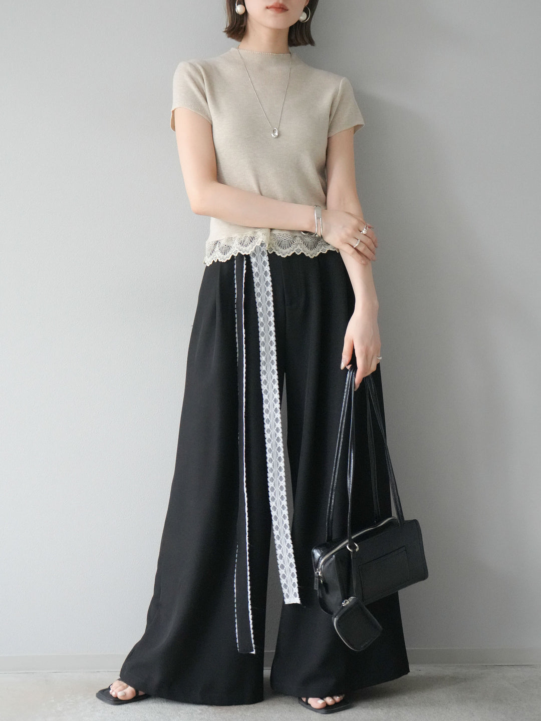 裾にあしらった繊細なレースが目を惹く、トレンドライクなニットトップス。詰まりすぎないプチネックとコンパクトなシルエットが、上品さと抜け感を両立。柔らかな肌ざわりの素材で着心地も快適です。一枚で着映えし、インナー使いにもぴったりな万能アイテム。 ※ボトムス、キャミソール(インナー)以外の商品は一律でインナーは付属していません