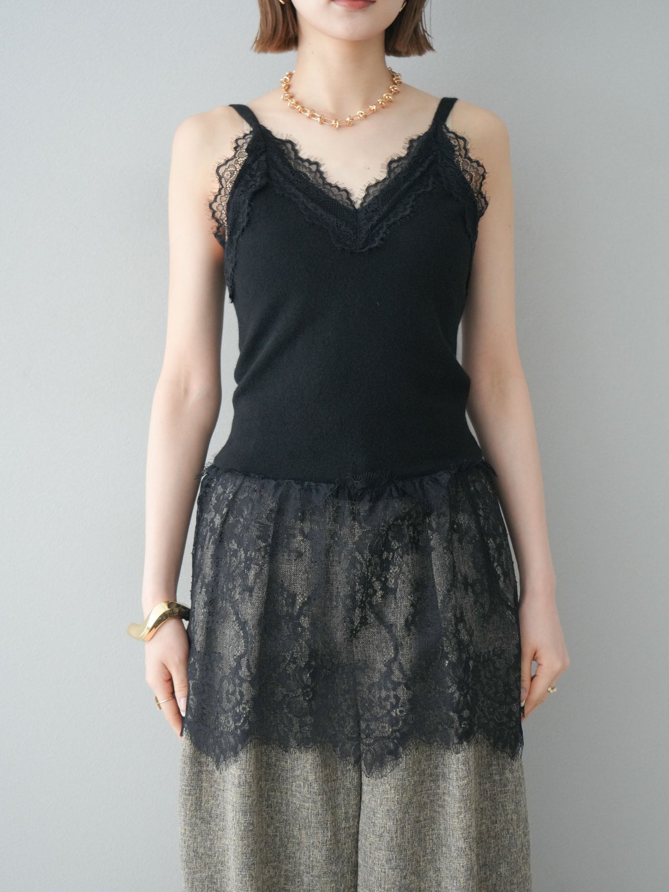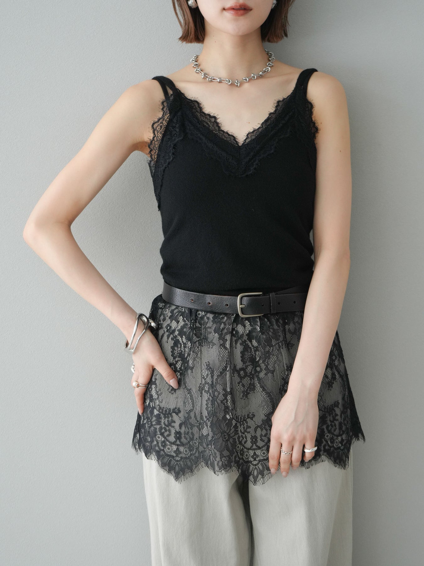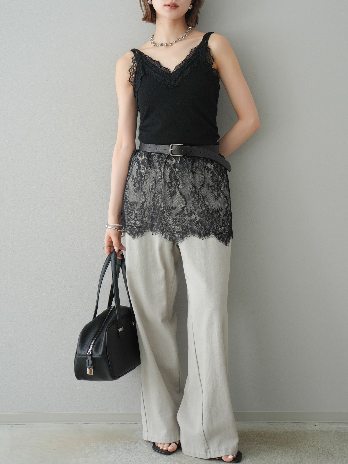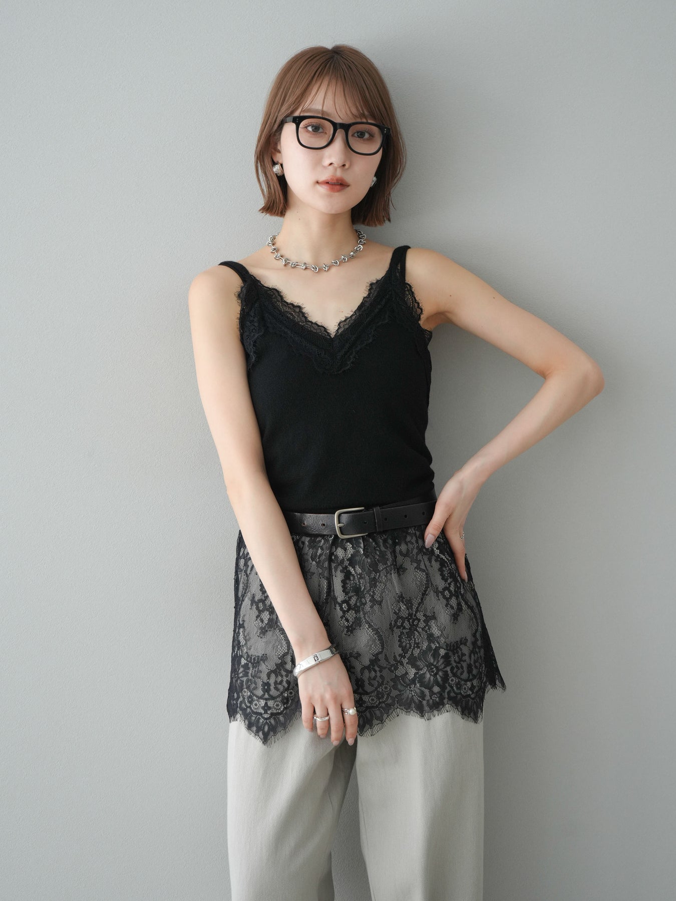 トレンド感のある繊細なレースをあしらったキャミソール。デコルテを美しく魅せるVネックデザインで、フェミニンな印象を演出します。柔らかな素材感と程よいフィット感で、インナーとしても一枚着としても活躍。カーディガンやジャケットのインナーに合わせるだけで、スタイリングの幅が広がるアイテムです。 ※ボトムス、キャミソール(インナー)以外の商品は一律でインナーは付属していません