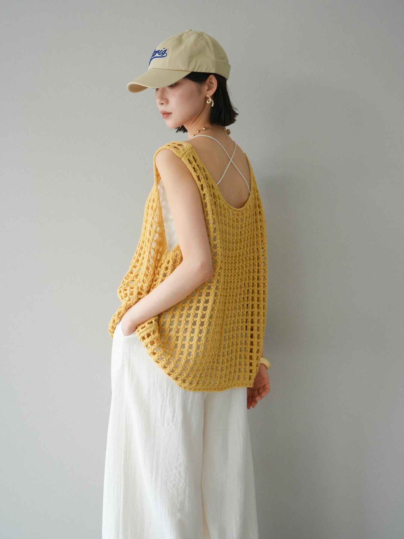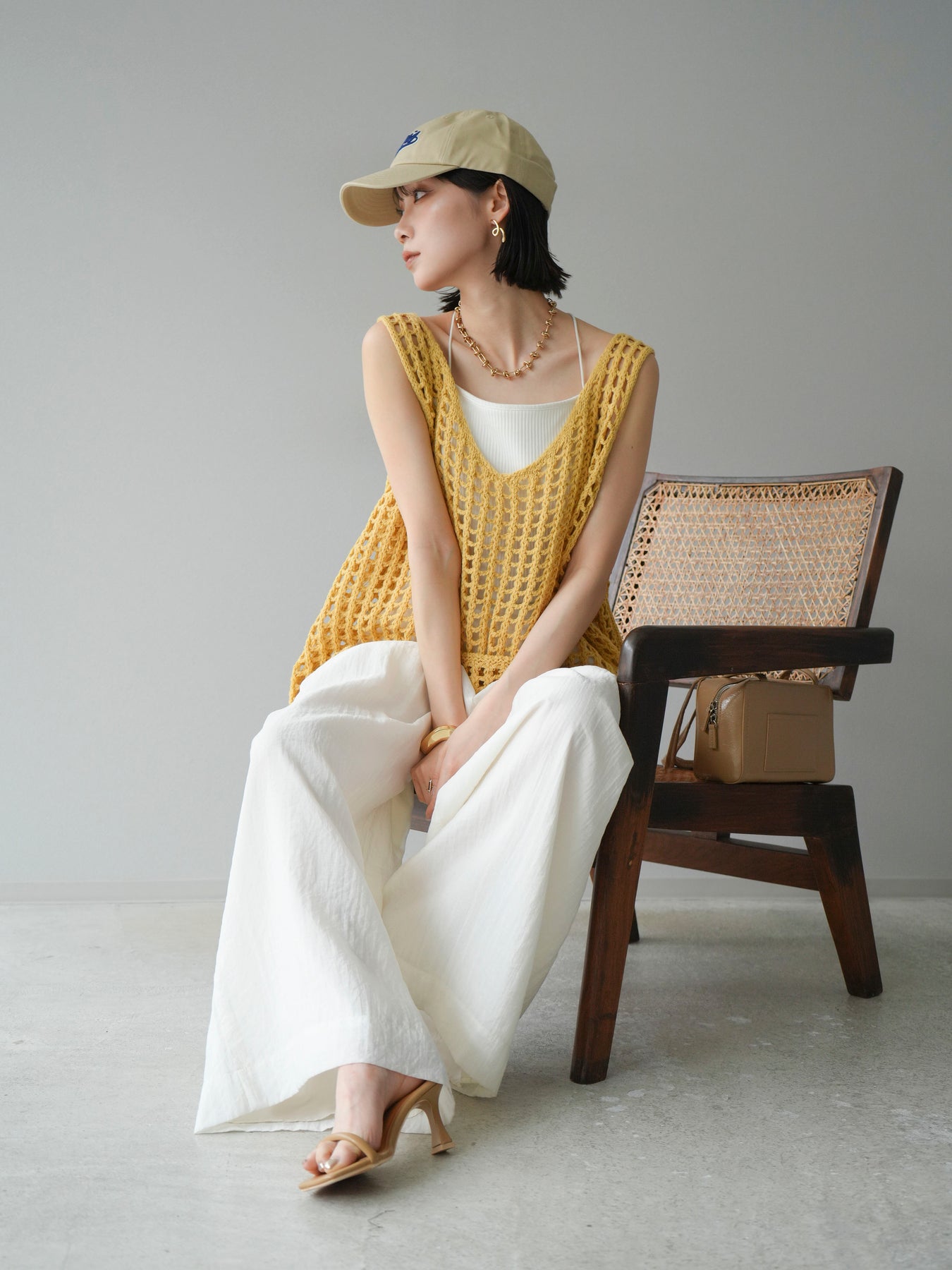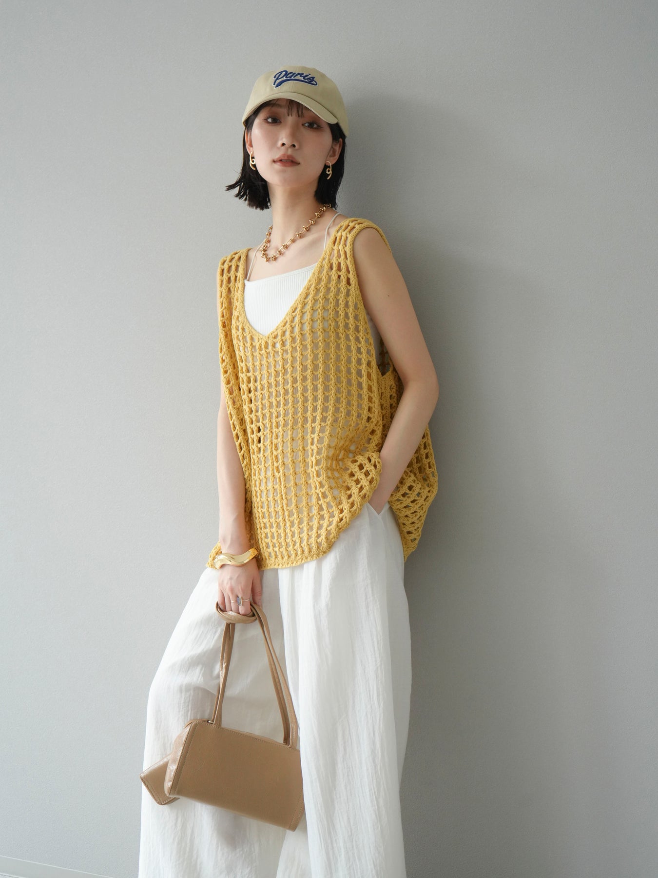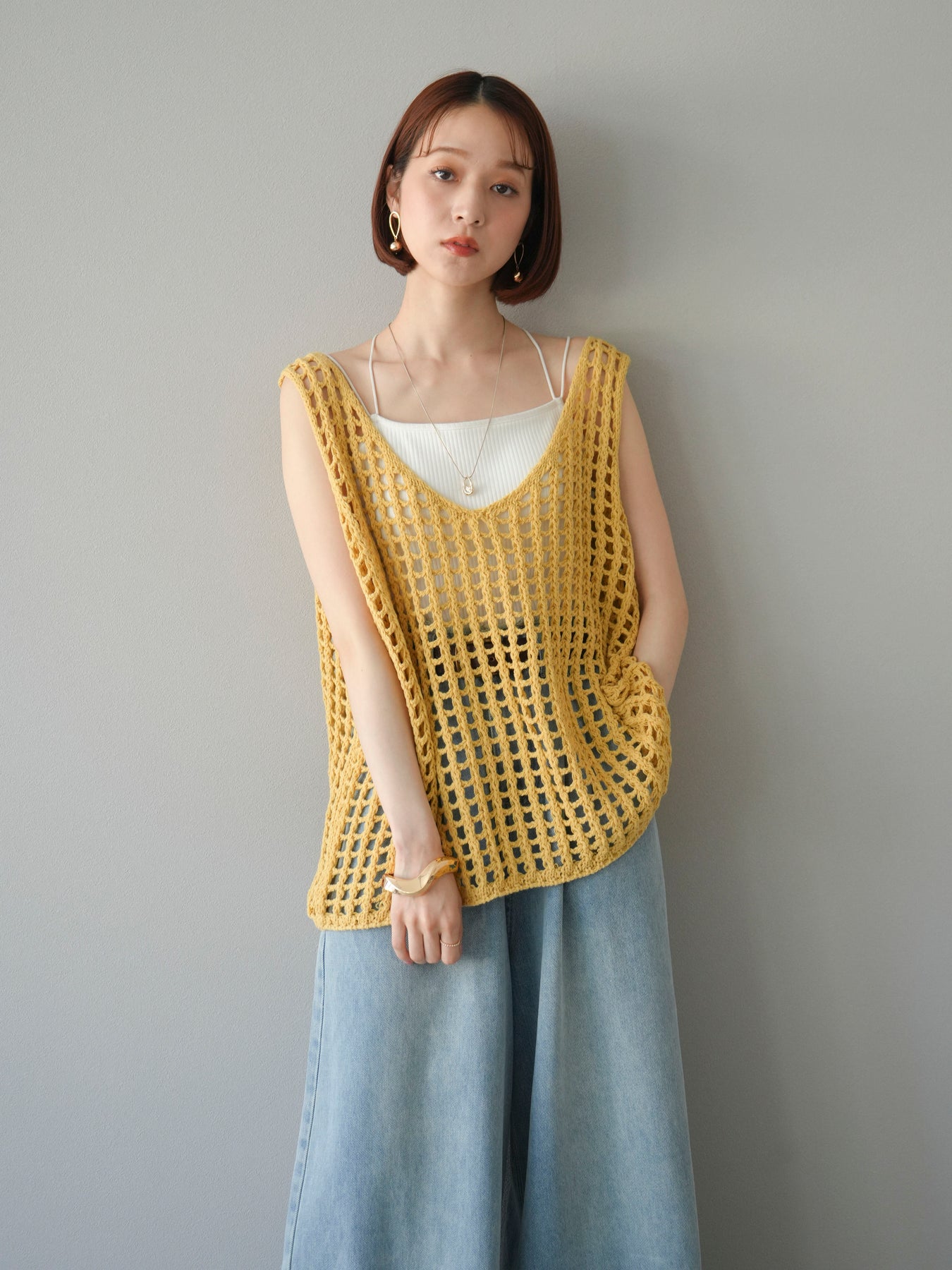通気性の良いメッシュニット素材で仕立てたベスト。軽やかな着心地とリラックス感を提供し、暑い季節にもぴったりです。シンプルなデザインでありながら、網目のディテールがアクセントとなり、カジュアルでありながらおしゃれな印象を与えます。デニムやスカートとのコーディネートに最適で、様々なスタイルに活躍するアイテムです。 ※ボトムス、キャミソール(インナー)以外の商品は一律でインナーは付属していません