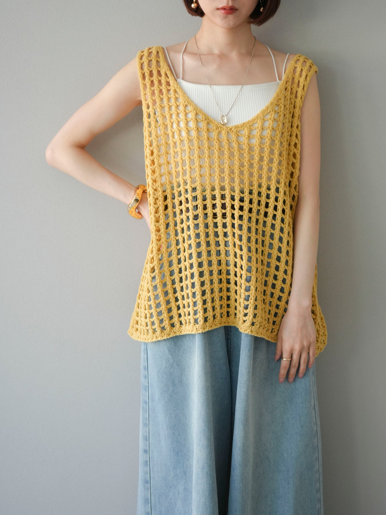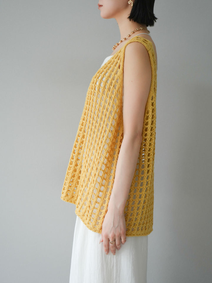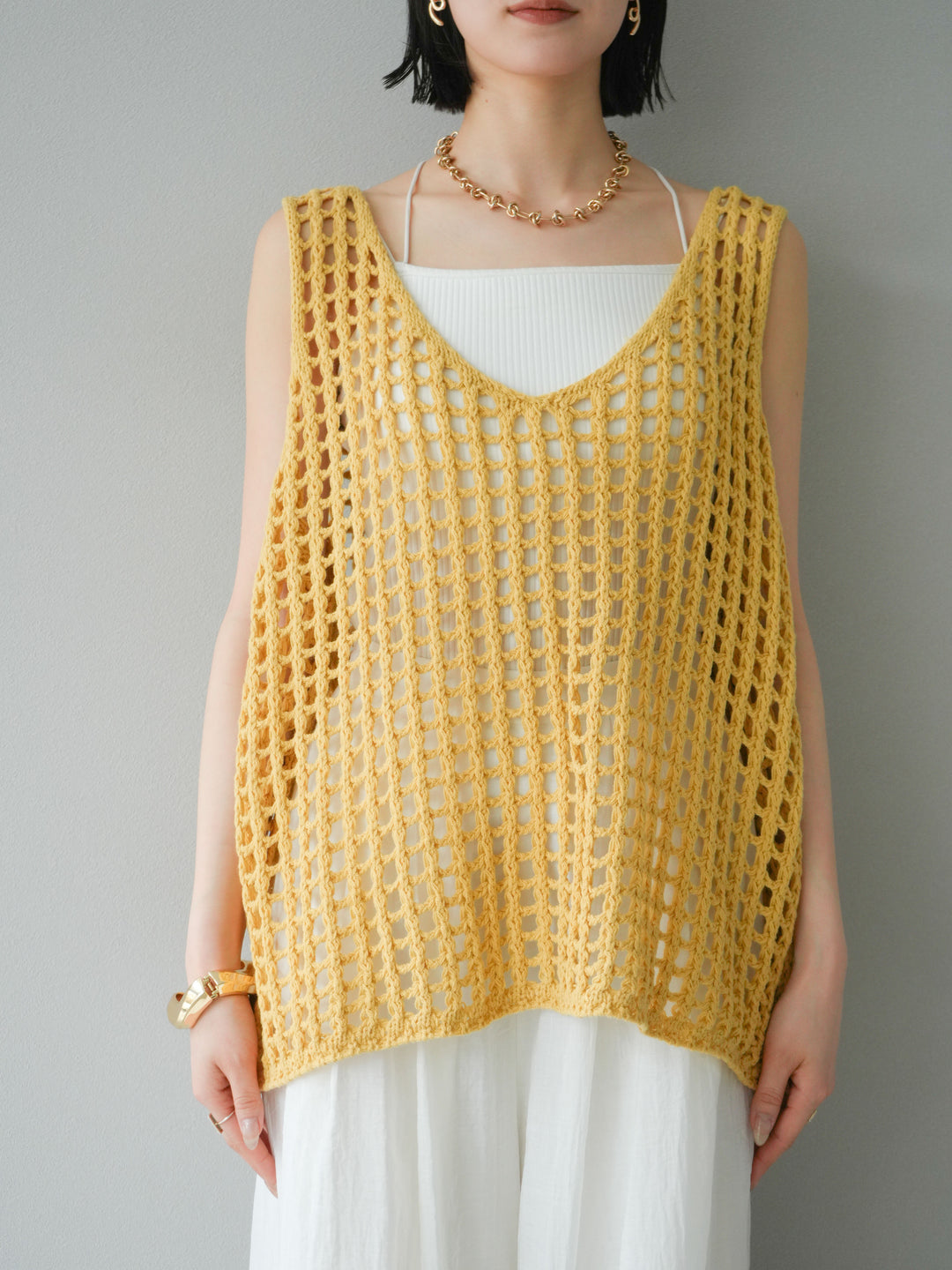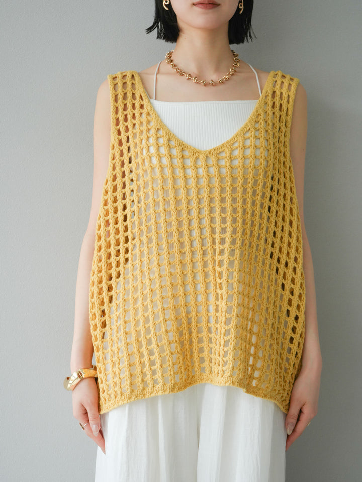 通気性の良いメッシュニット素材で仕立てたベスト。軽やかな着心地とリラックス感を提供し、暑い季節にもぴったりです。シンプルなデザインでありながら、網目のディテールがアクセントとなり、カジュアルでありながらおしゃれな印象を与えます。デニムやスカートとのコーディネートに最適で、様々なスタイルに活躍するアイテムです。 ※ボトムス、キャミソール(インナー)以外の商品は一律でインナーは付属していません