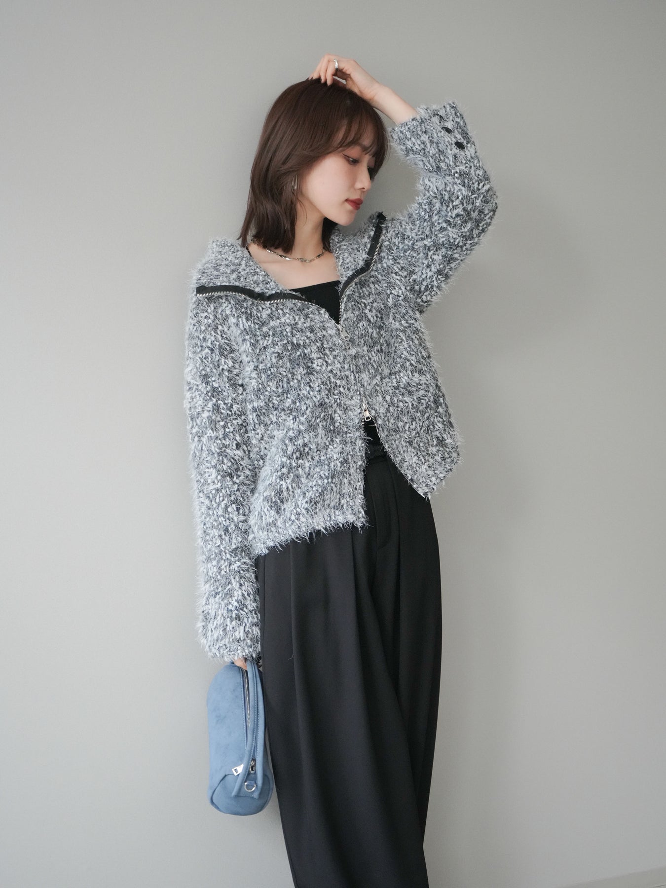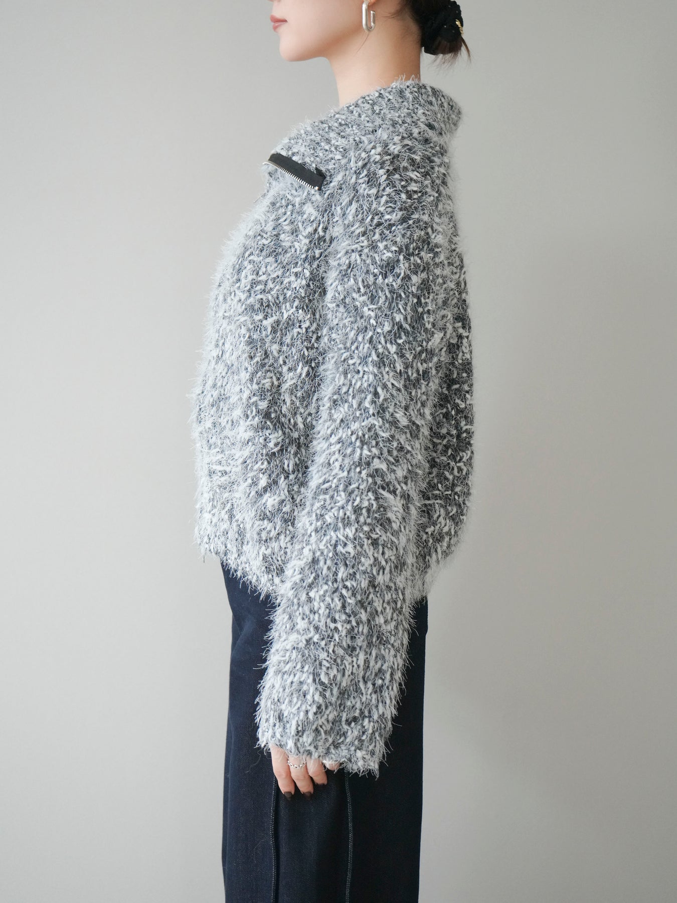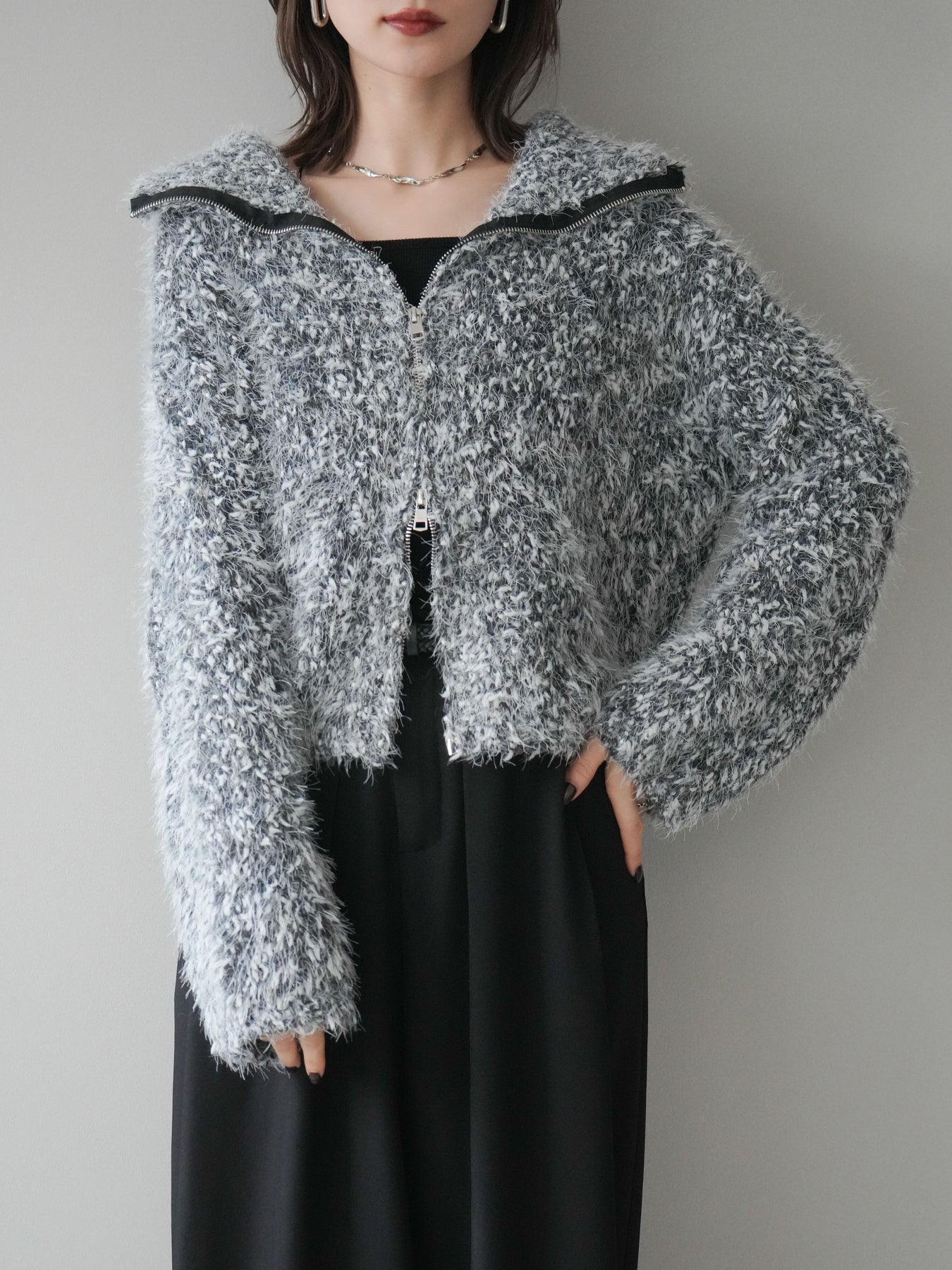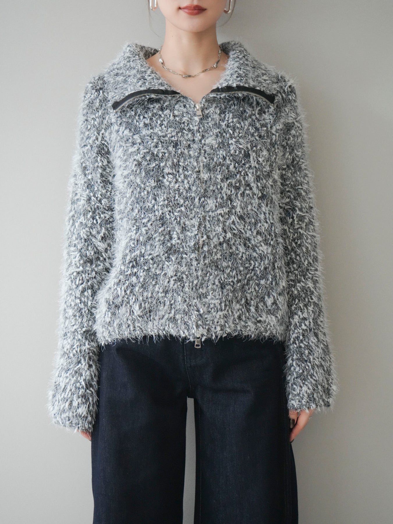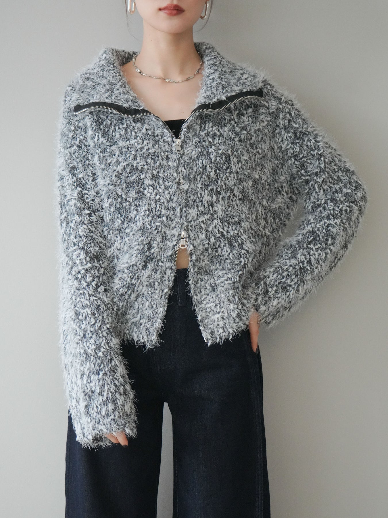 毛足のあるシャギー素材をミックス調で仕上げた、表情豊かなジップニットカーディガン。ふんわりとした質感がシーズンムードを高めつつ、ジップ使いがカジュアルな抜け感をプラスしてくれます。襟元はジップの開閉でニュアンスを変えられ、気分やスタイリングに合わせたアレンジが可能。ゆとりのあるシルエットでレイヤードもしやすく、デイリーに取り入れやすい万能な一枚です。 ※ボトムス、キャミソール(インナー)以外の商品は一律でインナーは付属していません。