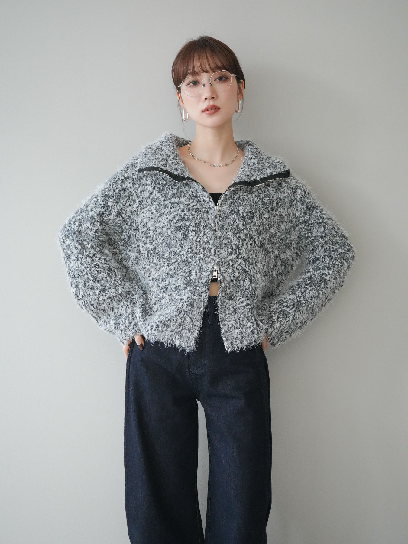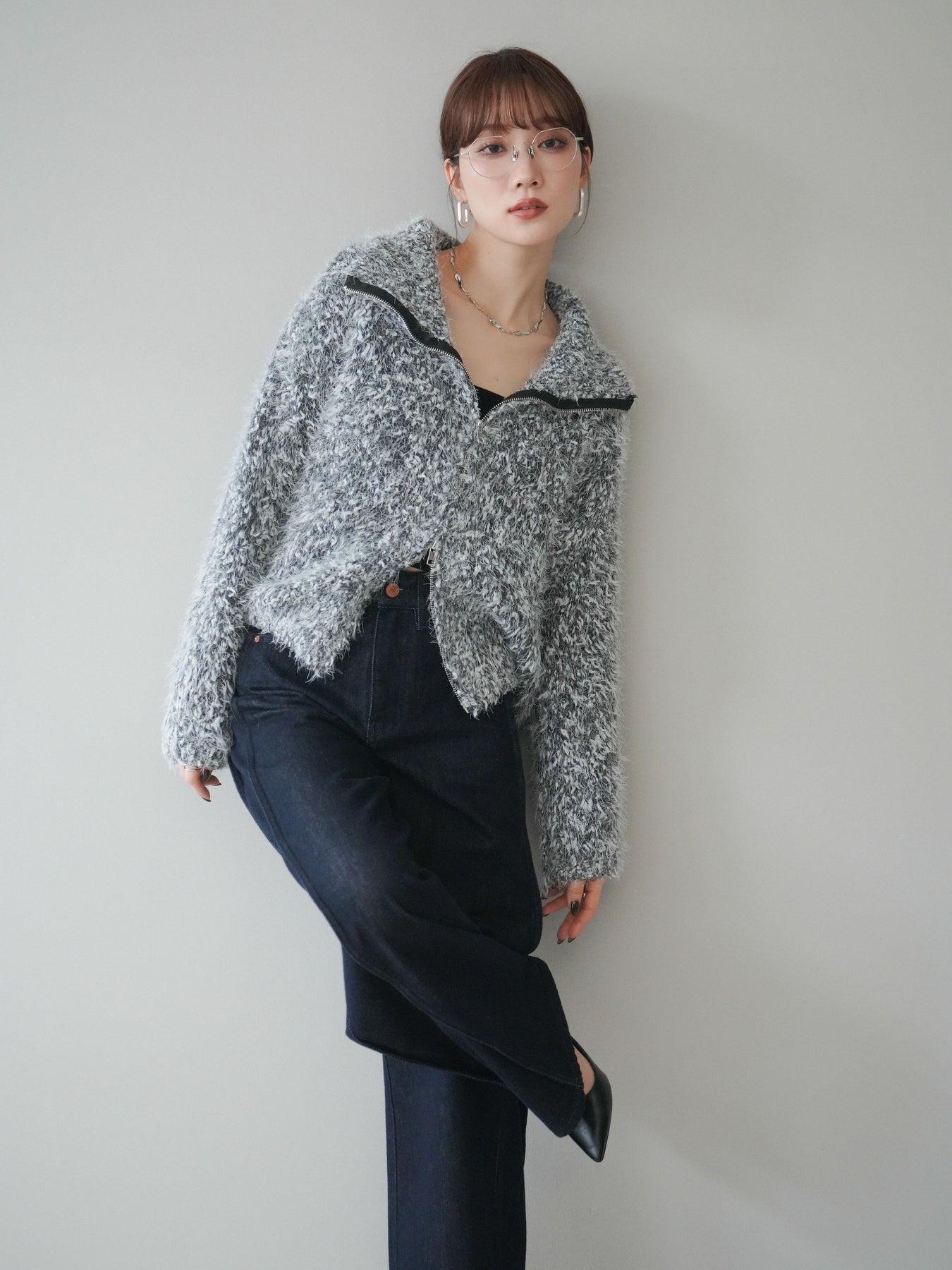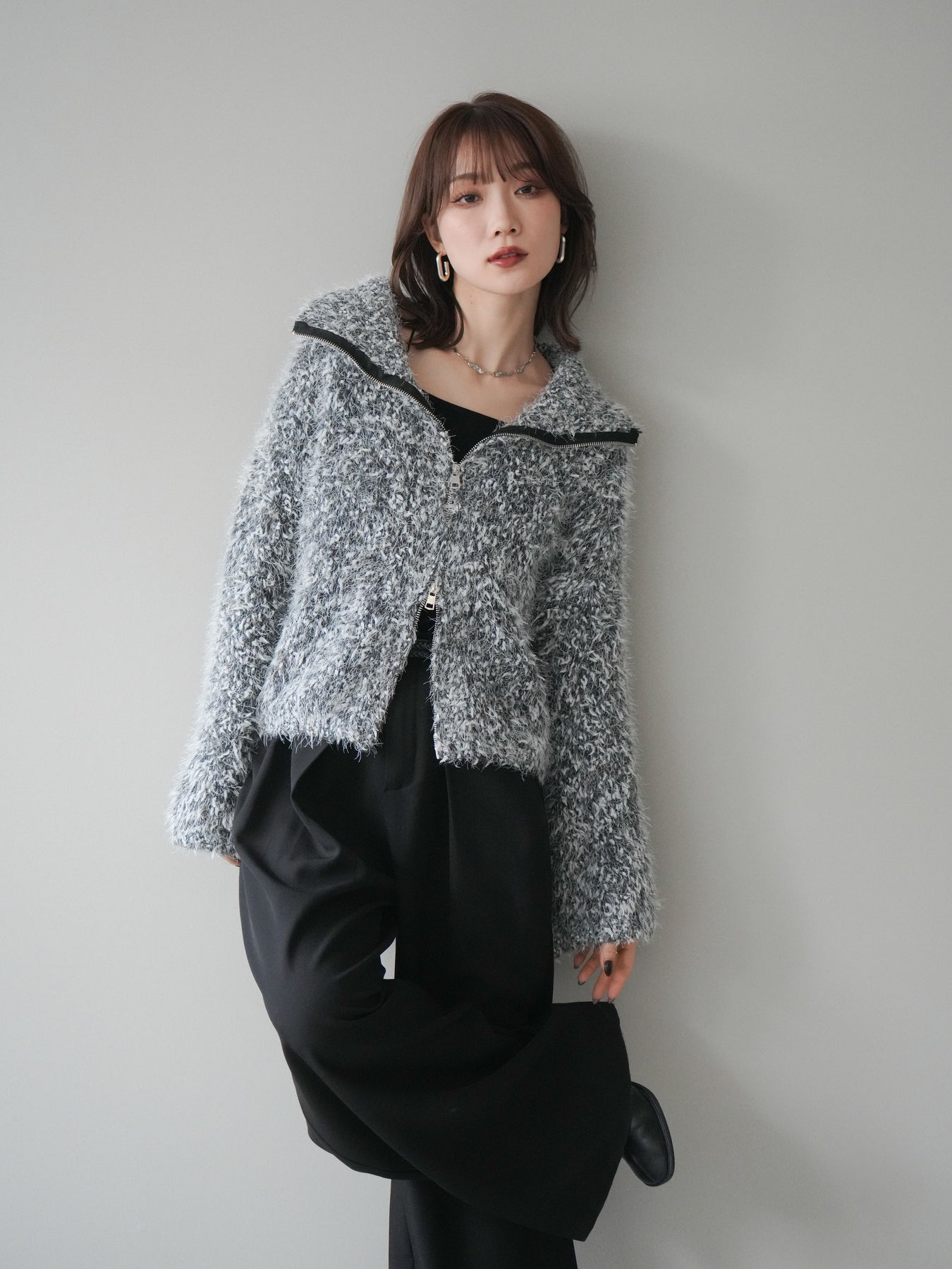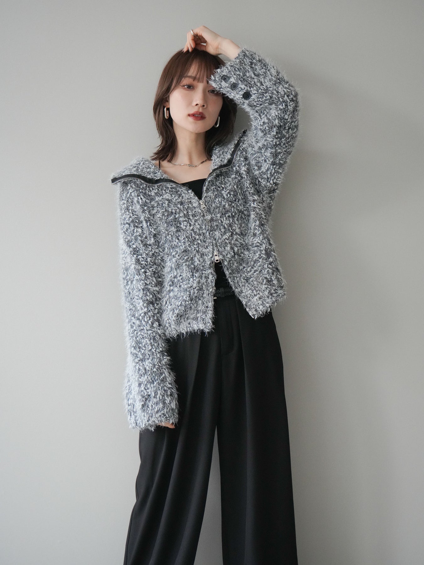 毛足のあるシャギー素材をミックス調で仕上げた、表情豊かなジップニットカーディガン。ふんわりとした質感がシーズンムードを高めつつ、ジップ使いがカジュアルな抜け感をプラスしてくれます。襟元はジップの開閉でニュアンスを変えられ、気分やスタイリングに合わせたアレンジが可能。ゆとりのあるシルエットでレイヤードもしやすく、デイリーに取り入れやすい万能な一枚です。 ※ボトムス、キャミソール(インナー)以外の商品は一律でインナーは付属していません。
