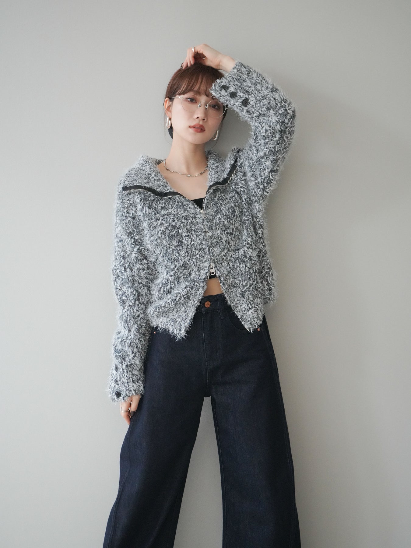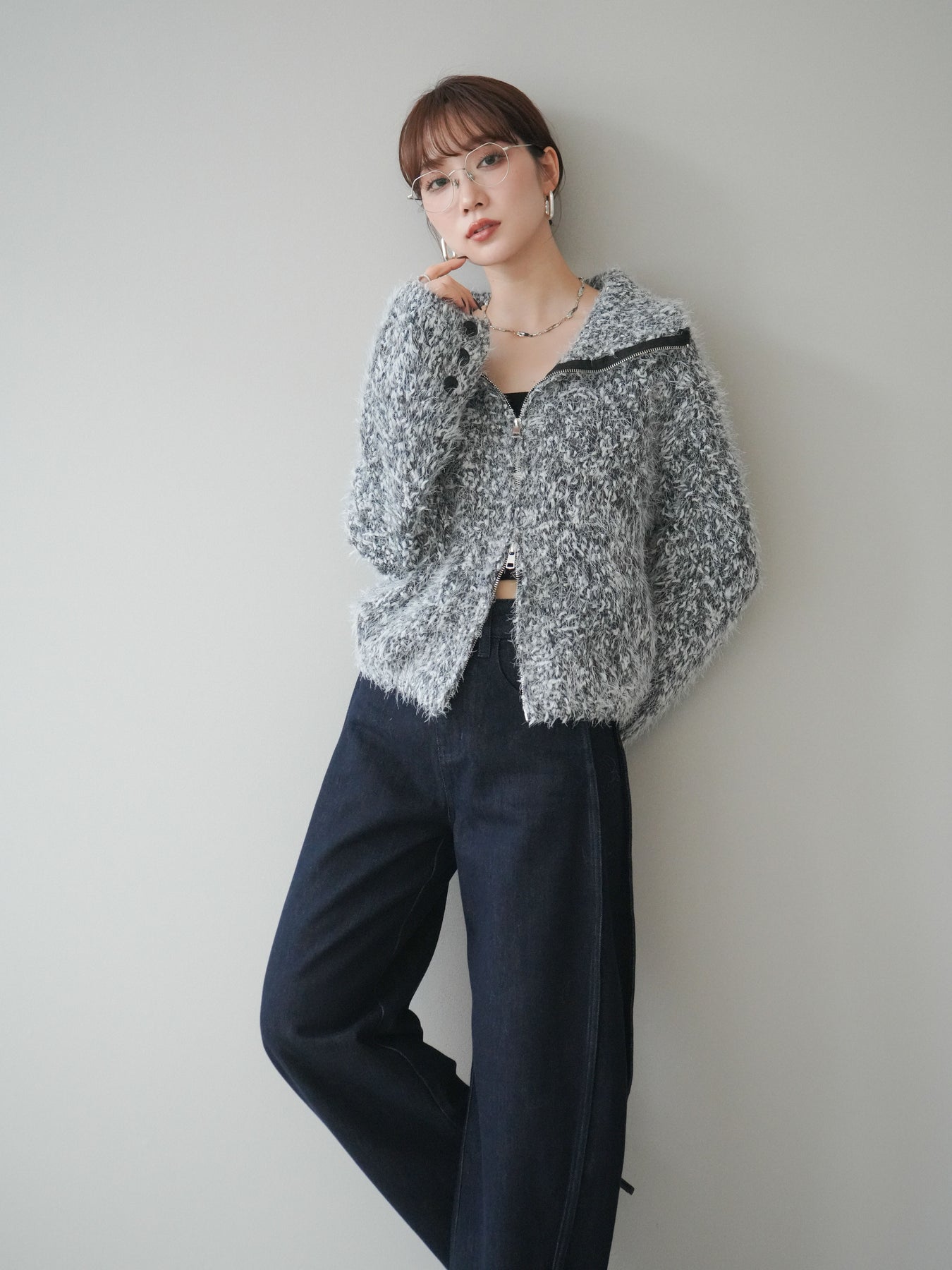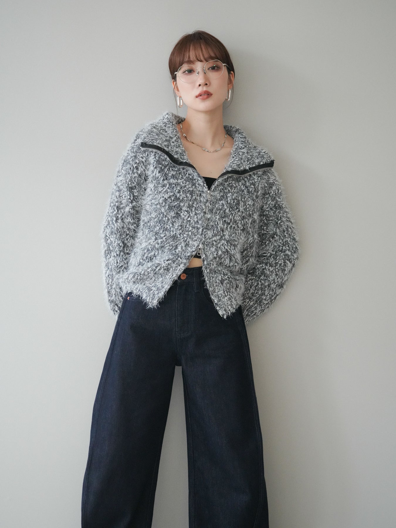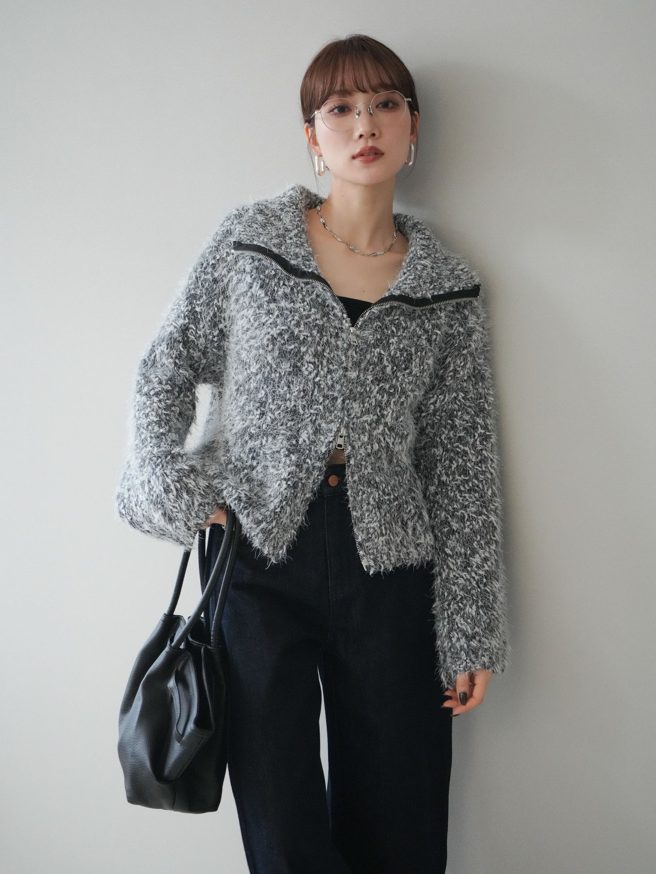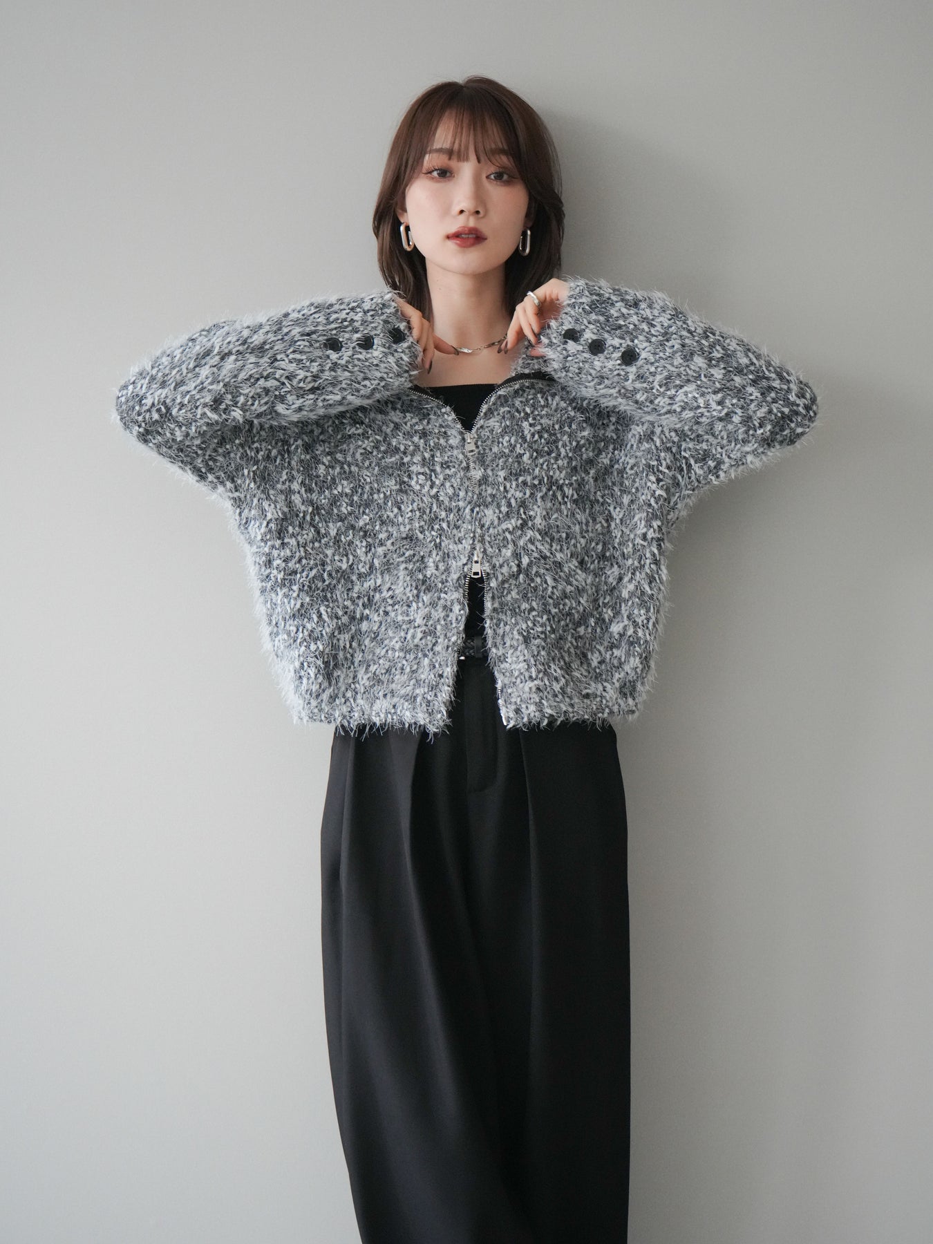 毛足のあるシャギー素材をミックス調で仕上げた、表情豊かなジップニットカーディガン。ふんわりとした質感がシーズンムードを高めつつ、ジップ使いがカジュアルな抜け感をプラスしてくれます。襟元はジップの開閉でニュアンスを変えられ、気分やスタイリングに合わせたアレンジが可能。ゆとりのあるシルエットでレイヤードもしやすく、デイリーに取り入れやすい万能な一枚です。 ※ボトムス、キャミソール(インナー)以外の商品は一律でインナーは付属していません。