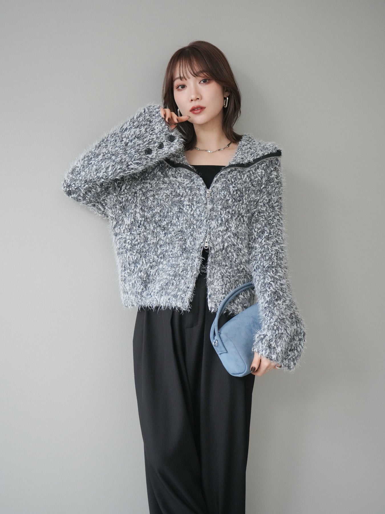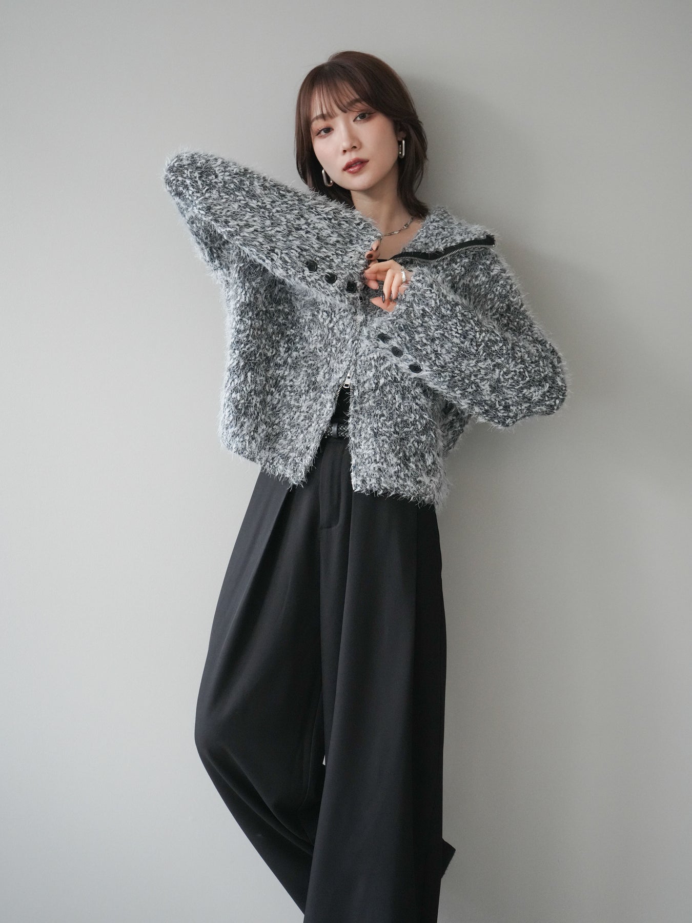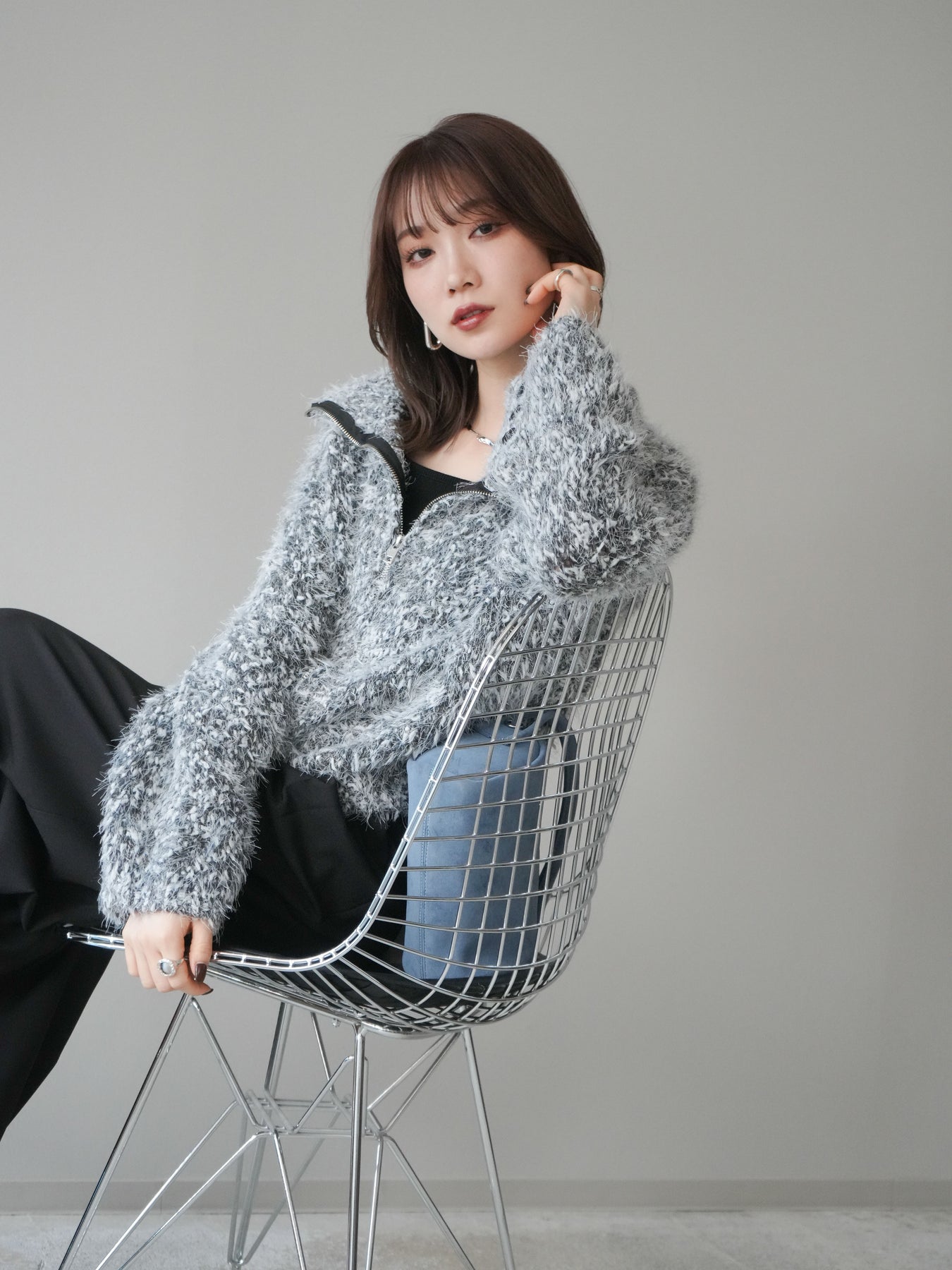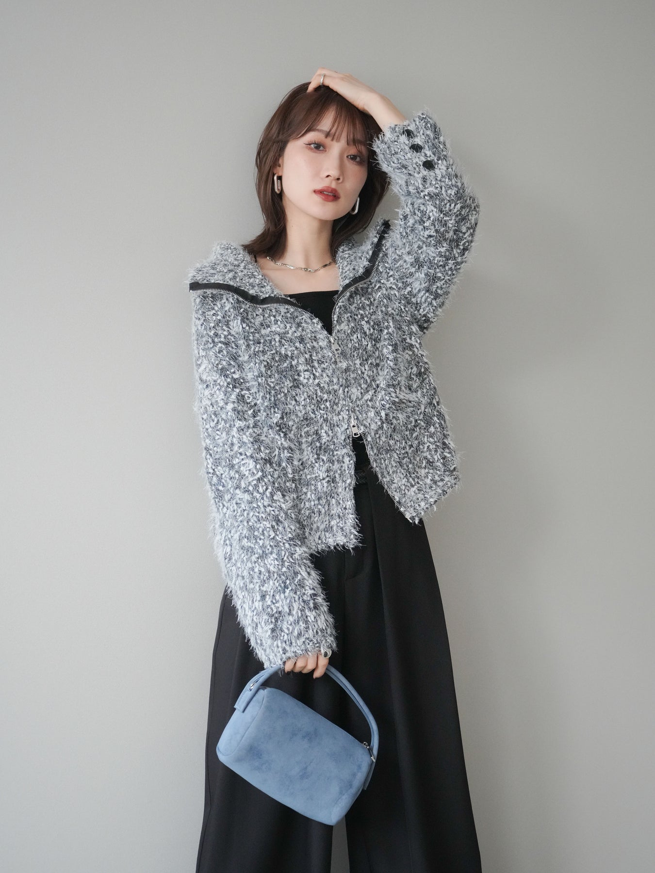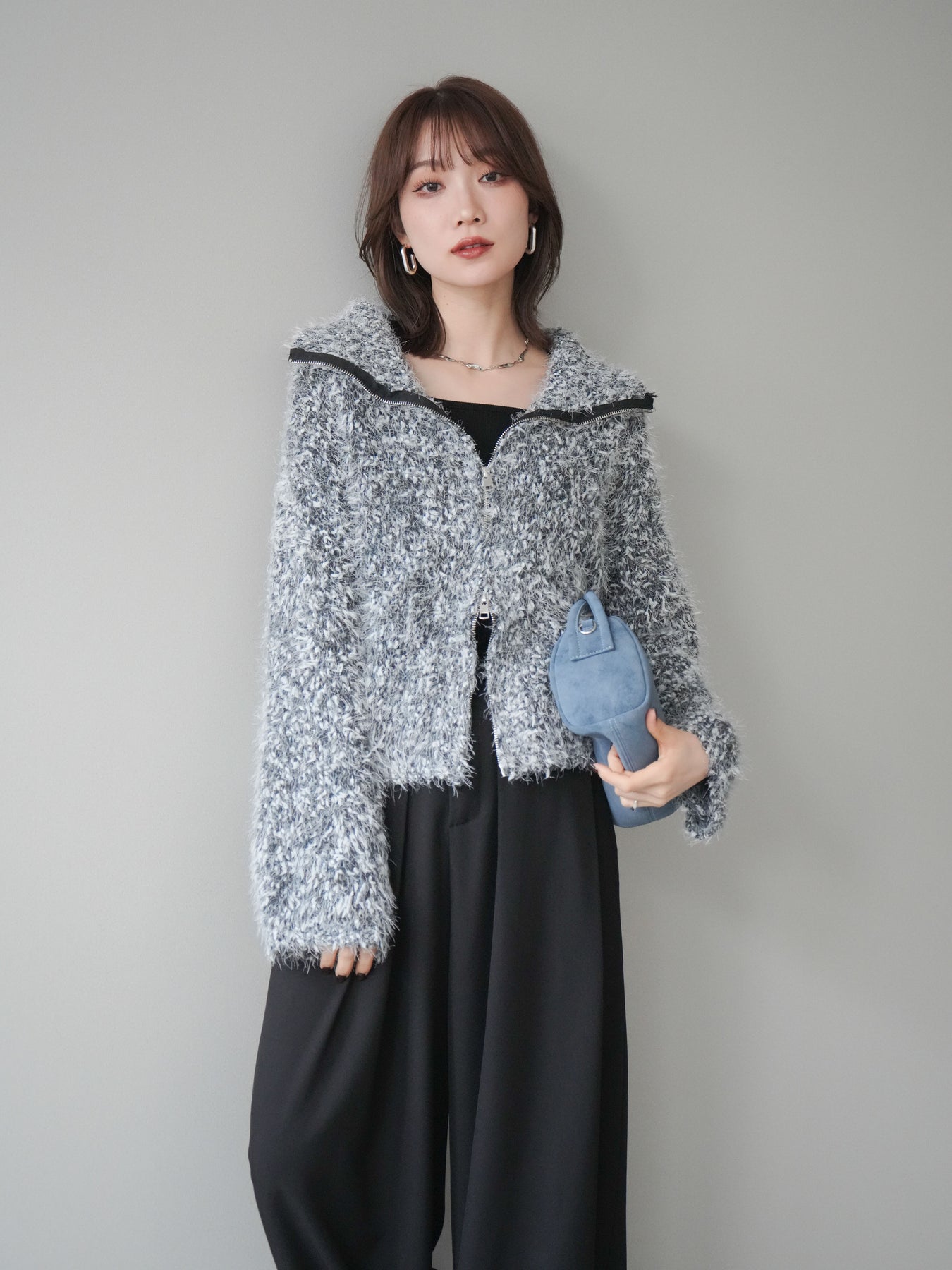 毛足のあるシャギー素材をミックス調で仕上げた、表情豊かなジップニットカーディガン。ふんわりとした質感がシーズンムードを高めつつ、ジップ使いがカジュアルな抜け感をプラスしてくれます。襟元はジップの開閉でニュアンスを変えられ、気分やスタイリングに合わせたアレンジが可能。ゆとりのあるシルエットでレイヤードもしやすく、デイリーに取り入れやすい万能な一枚です。 ※ボトムス、キャミソール(インナー)以外の商品は一律でインナーは付属していません。