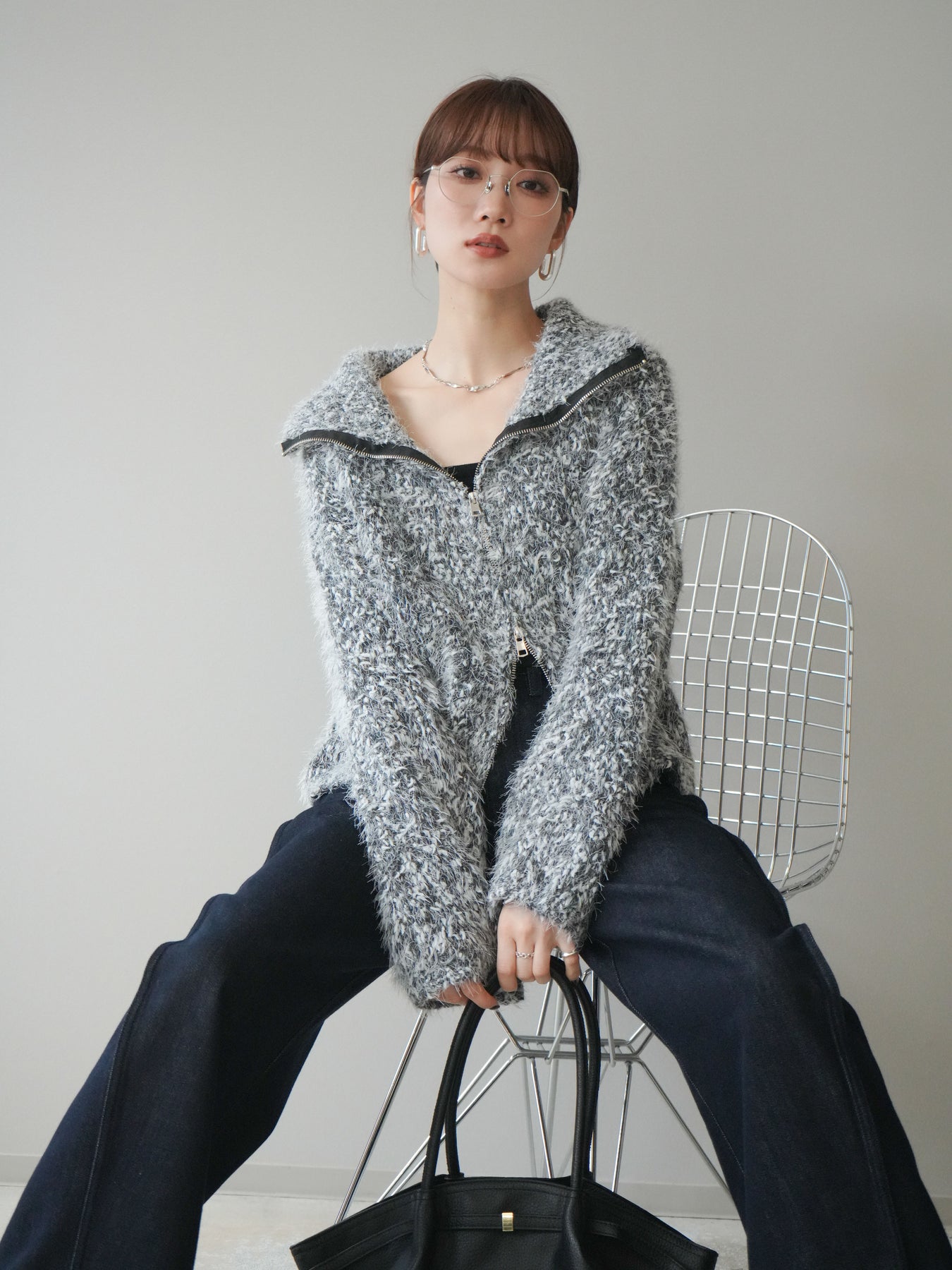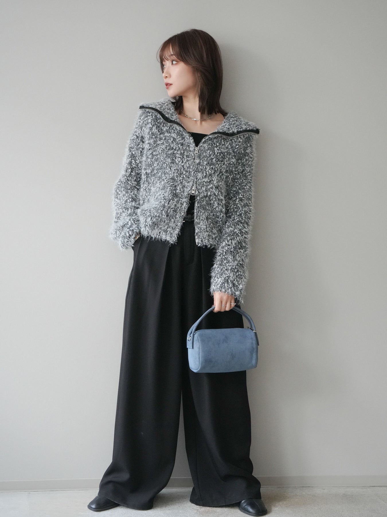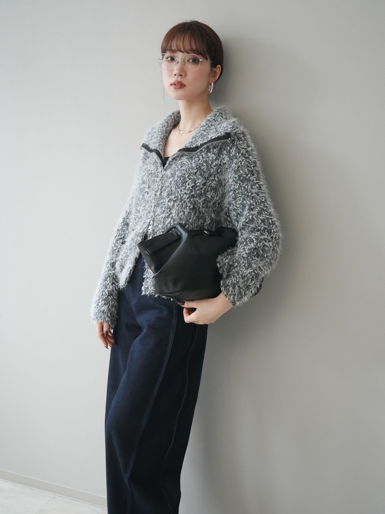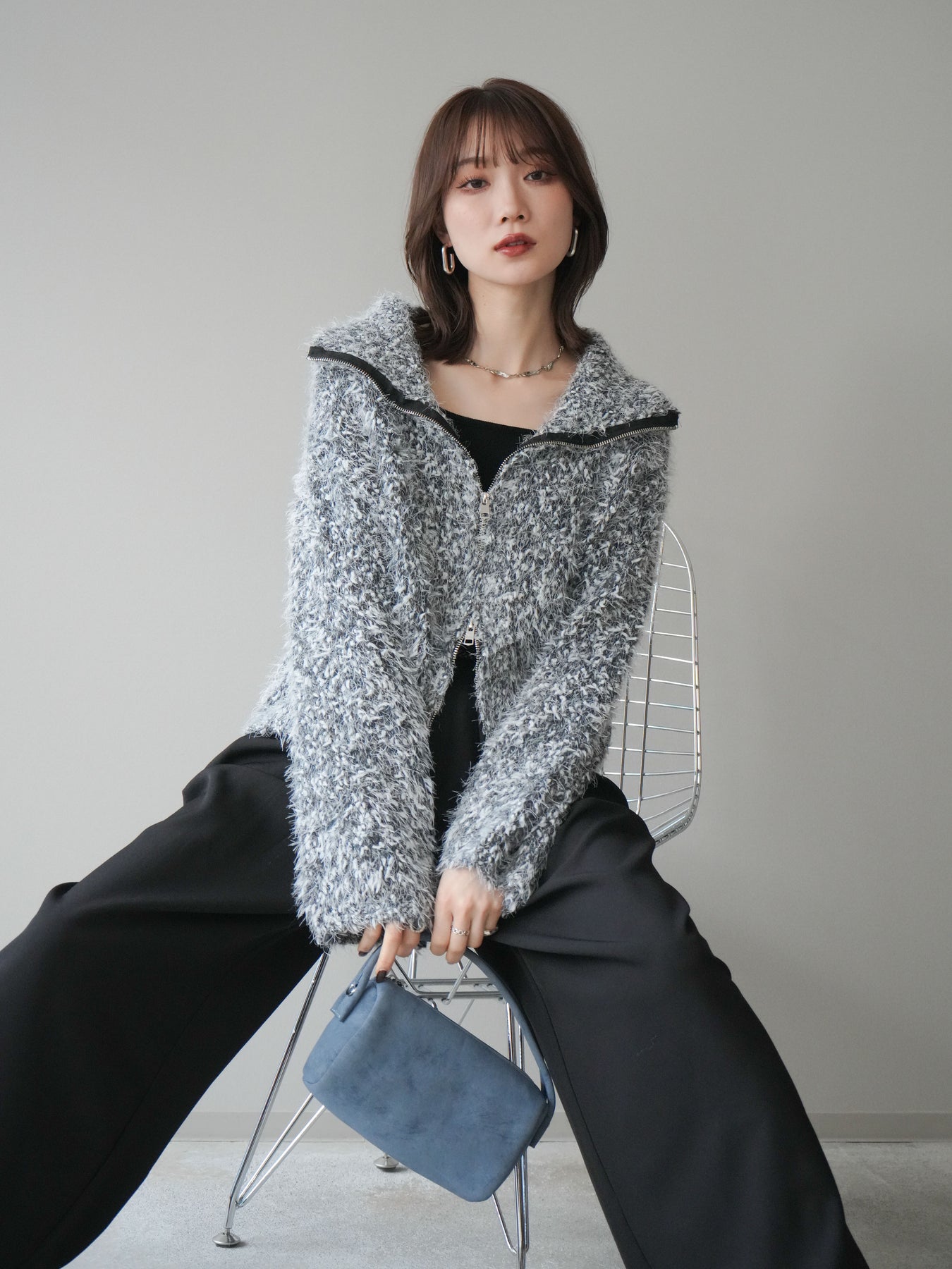 毛足のあるシャギー素材をミックス調で仕上げた、表情豊かなジップニットカーディガン。ふんわりとした質感がシーズンムードを高めつつ、ジップ使いがカジュアルな抜け感をプラスしてくれます。襟元はジップの開閉でニュアンスを変えられ、気分やスタイリングに合わせたアレンジが可能。ゆとりのあるシルエットでレイヤードもしやすく、デイリーに取り入れやすい万能な一枚です。 ※ボトムス、キャミソール(インナー)以外の商品は一律でインナーは付属していません。