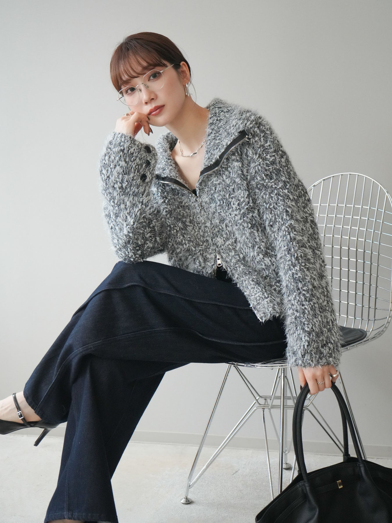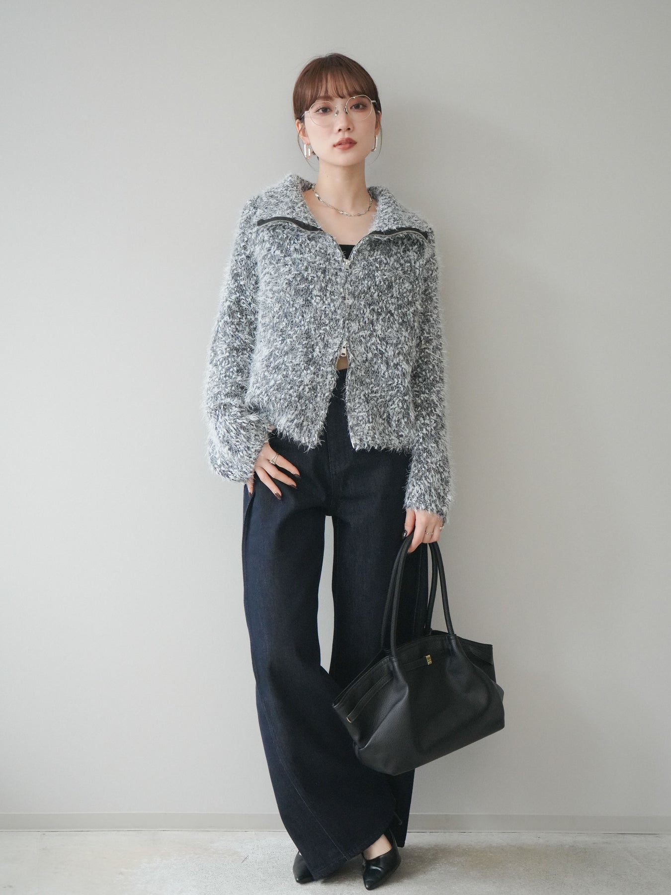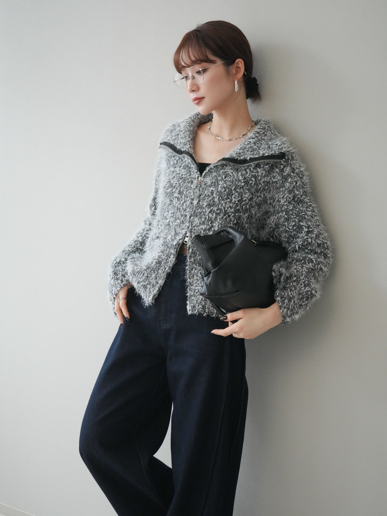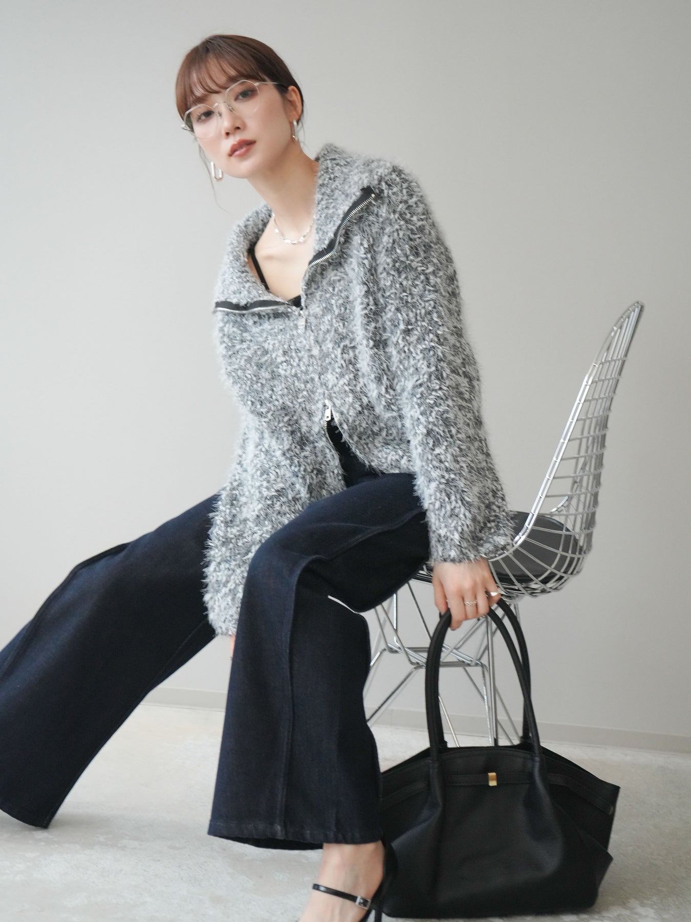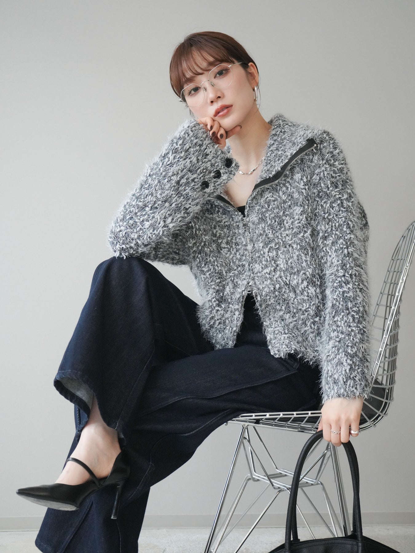 毛足のあるシャギー素材をミックス調で仕上げた、表情豊かなジップニットカーディガン。ふんわりとした質感がシーズンムードを高めつつ、ジップ使いがカジュアルな抜け感をプラスしてくれます。襟元はジップの開閉でニュアンスを変えられ、気分やスタイリングに合わせたアレンジが可能。ゆとりのあるシルエットでレイヤードもしやすく、デイリーに取り入れやすい万能な一枚です。 ※ボトムス、キャミソール(インナー)以外の商品は一律でインナーは付属していません。