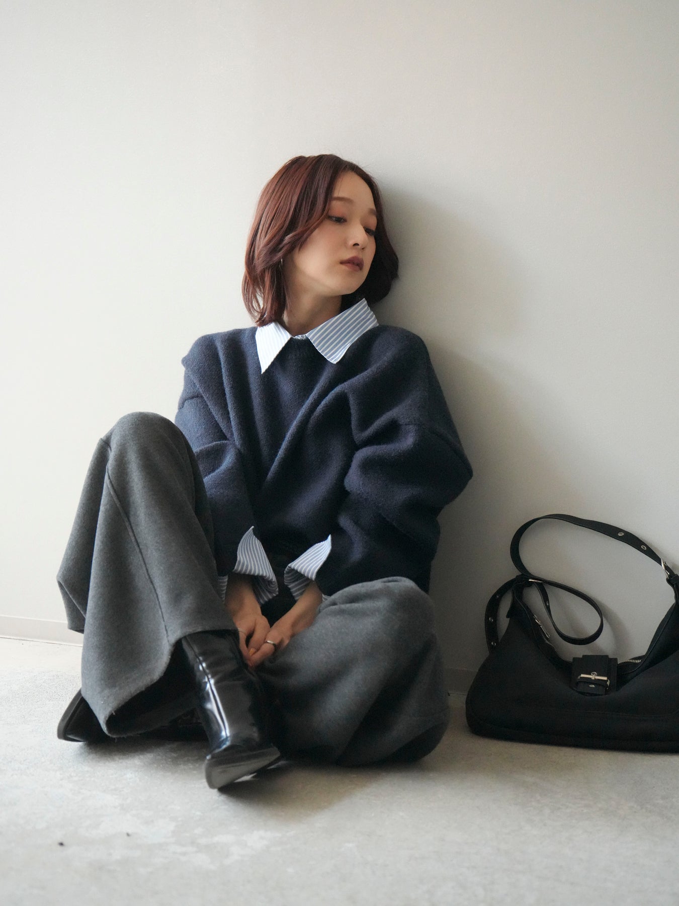 ストライプ柄の襟がアクセントになる、レイヤード風デザインのニットプルオーバー。襟は取り外し可能な2WAY仕様で、その日の気分やコーディネートに合わせてシンプルにも華やかにもアレンジできます。程よくゆとりのあるシルエットはリラックス感があり、ニットの柔らかな風合いが季節らしい温かみをプラス。デニムやスカートなど幅広いボトムスと相性がよく、1枚でバランスよく着映えする万能アイテムです。 ※ボトムス、キャミソール(インナー)以外の商品は一律でインナーは付属していません。