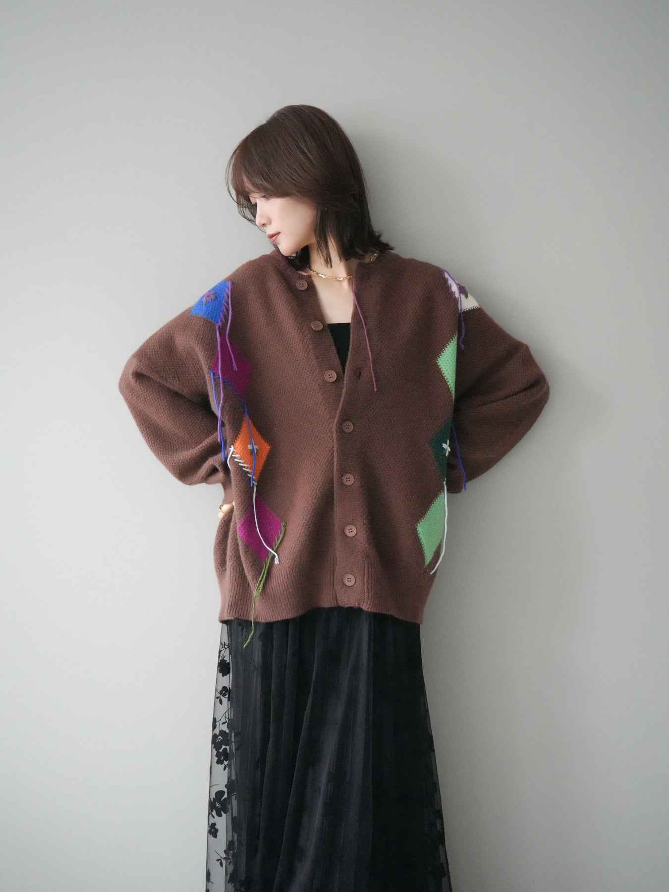 異素材の編地とハンドステッチ風のディテールを組み合わせた、存在感あふれるアーガイルデザインのニットカーディガン。色や質感の異なるパッチワークのような装飾が視覚的な楽しさを加え、1枚で主役になる着映えアイテムに仕上がっています。ゆったりとしたシルエットと柔らかなニット素材がリラックスした着心地を叶えつつ、フロントのボタンで着こなしのアレンジも自在。シンプルなボトムスに合わせるだけでスタイルが完成する、個性と暖かみを兼ね備えた一枚です。 ※ボトムス、キャミソール(インナー)以外の商品は一律でインナーは付属していません。