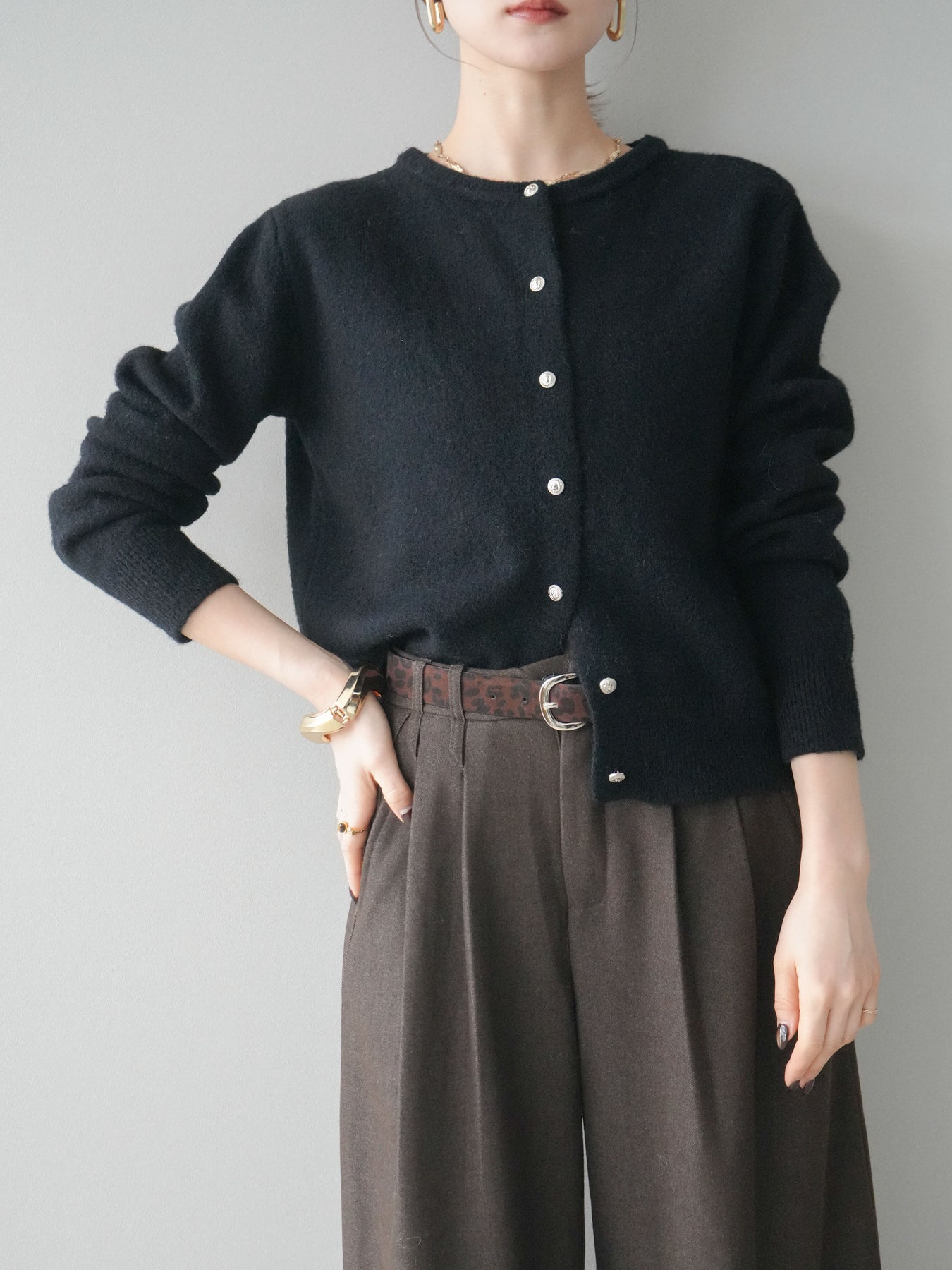アンティーク調のボタンをアクセントにした、上品な雰囲気漂うニットカーディガン。柔らかな風合いのニットがふんわりと身体を包み、程よいゆとりのあるシルエットがリラックス感と女性らしい抜け感を両立します。シンプルなデザインながら、クラシックムード漂うボタンがさりげない存在感をプラスし、羽織りとしてもトップス代わりとしても使いやすい万能な一枚。デニムやスカートなど幅広いアイテムと相性が良く、デイリーに活躍してくれます。 ※ボトムス、キャミソール(インナー)以外の商品は一律でインナーは付属していません。