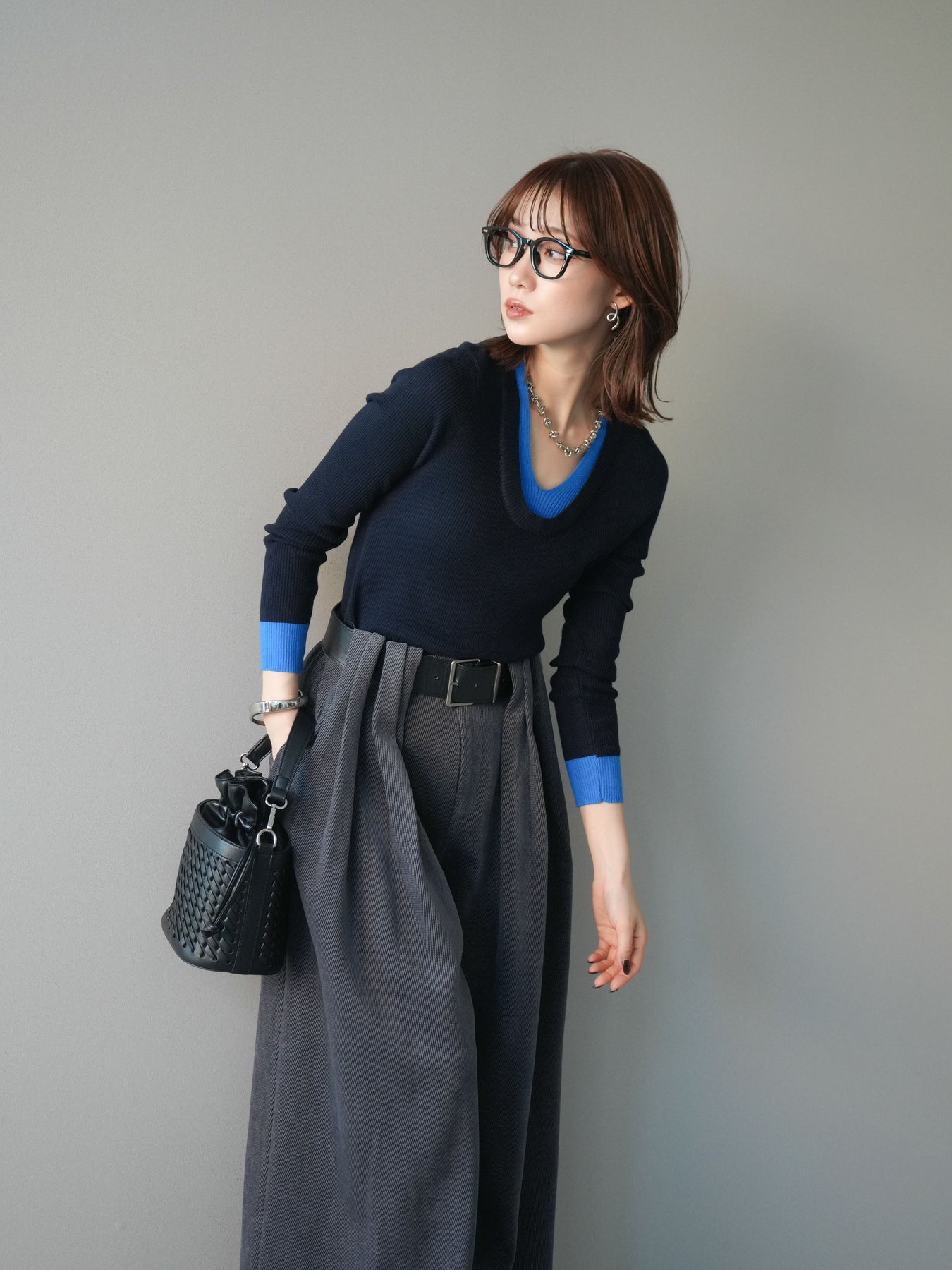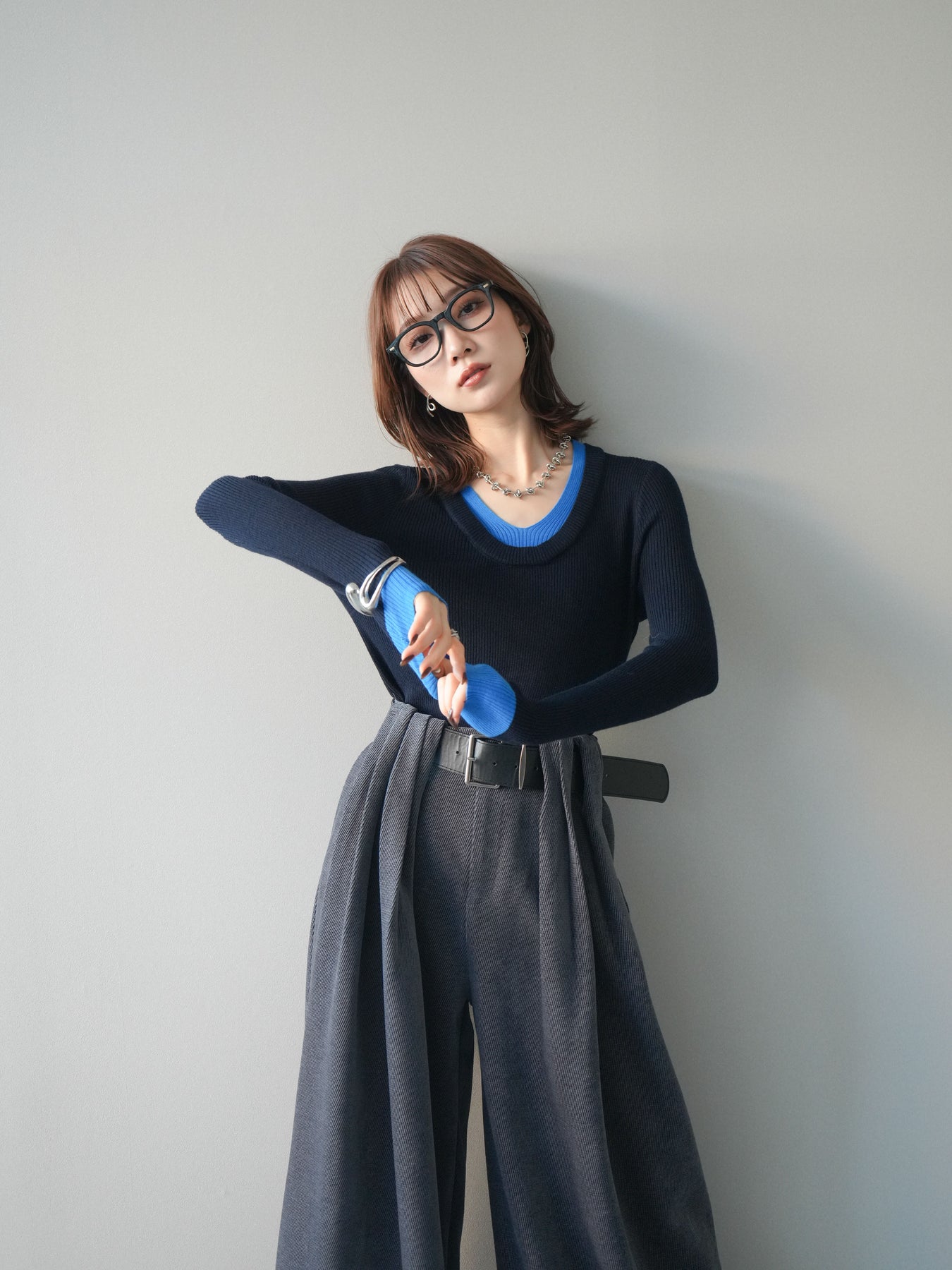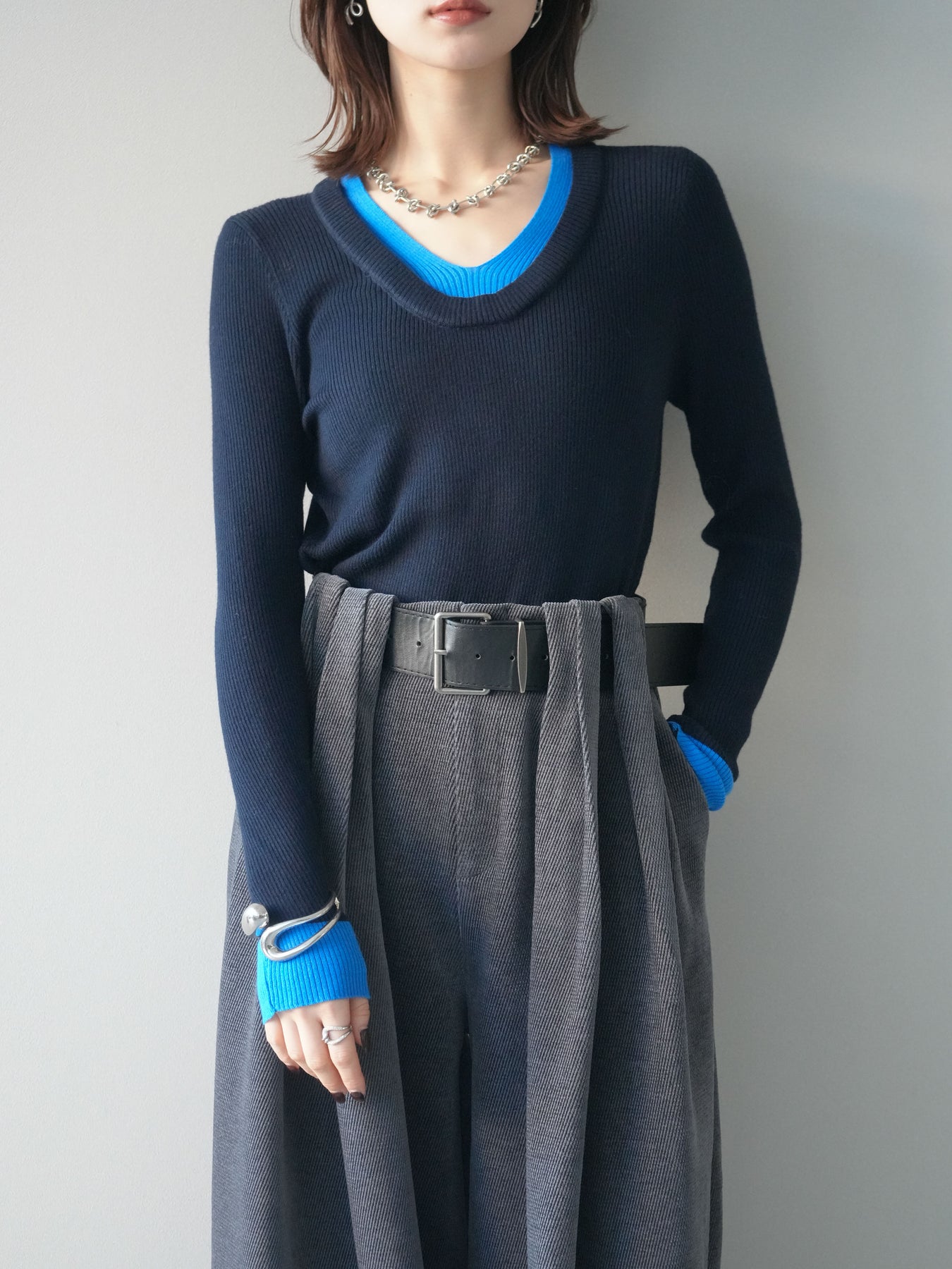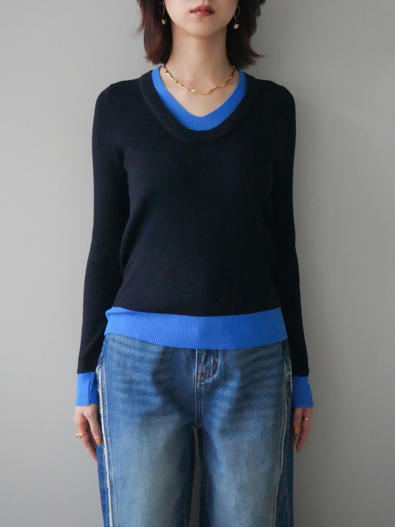 [予約]Uネック配色レイヤードリブニットトップス/black
