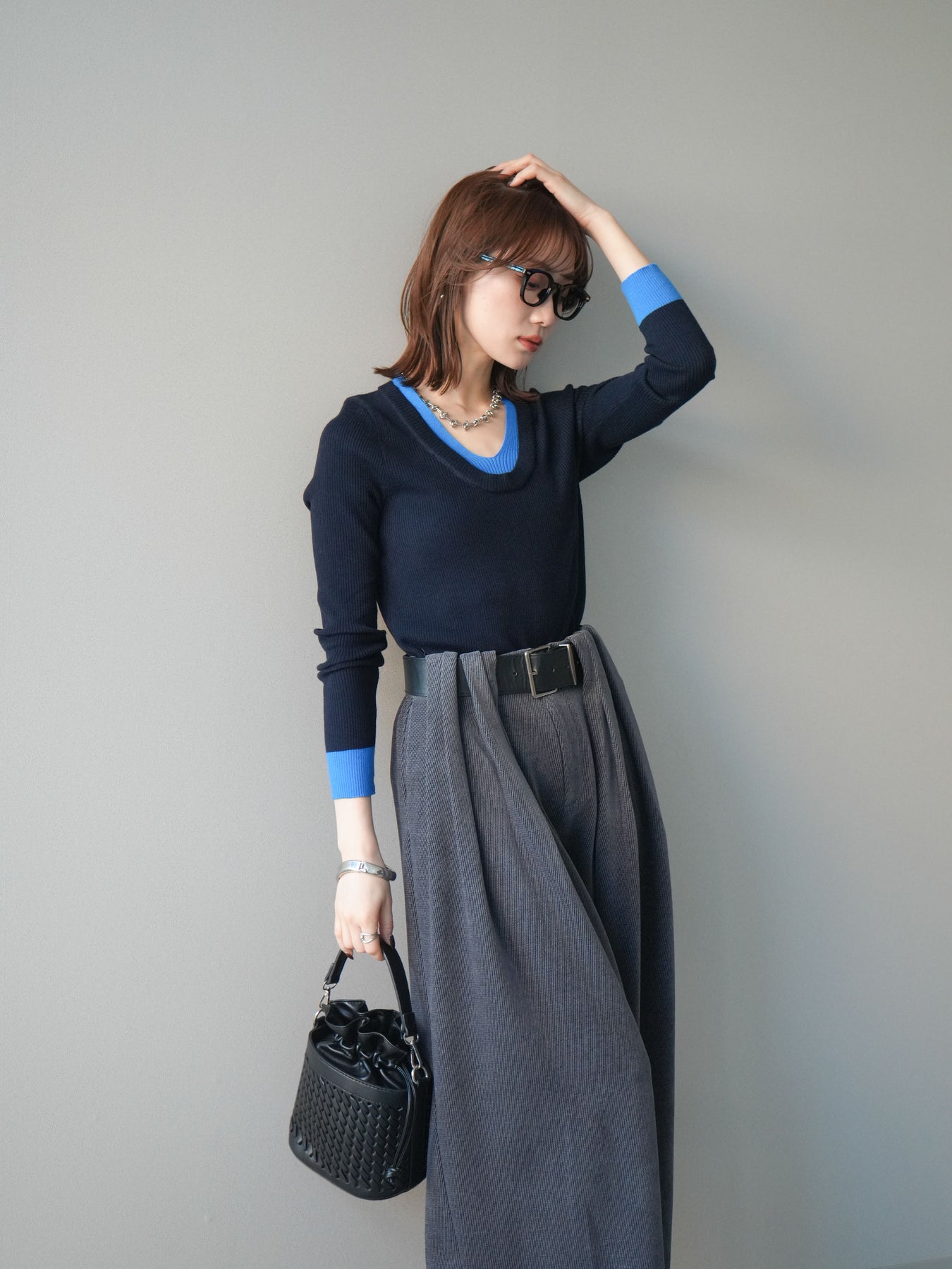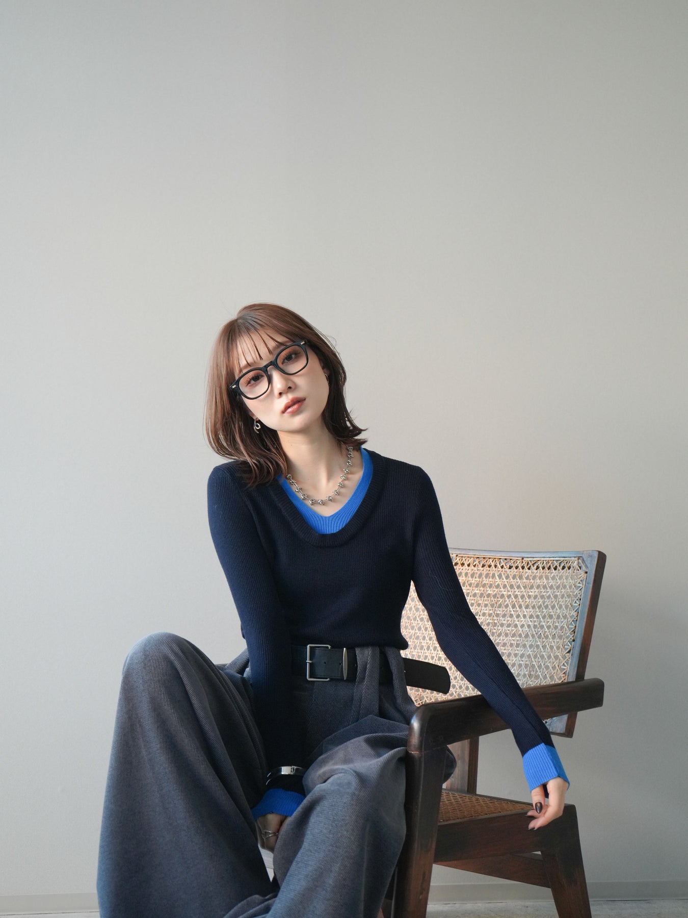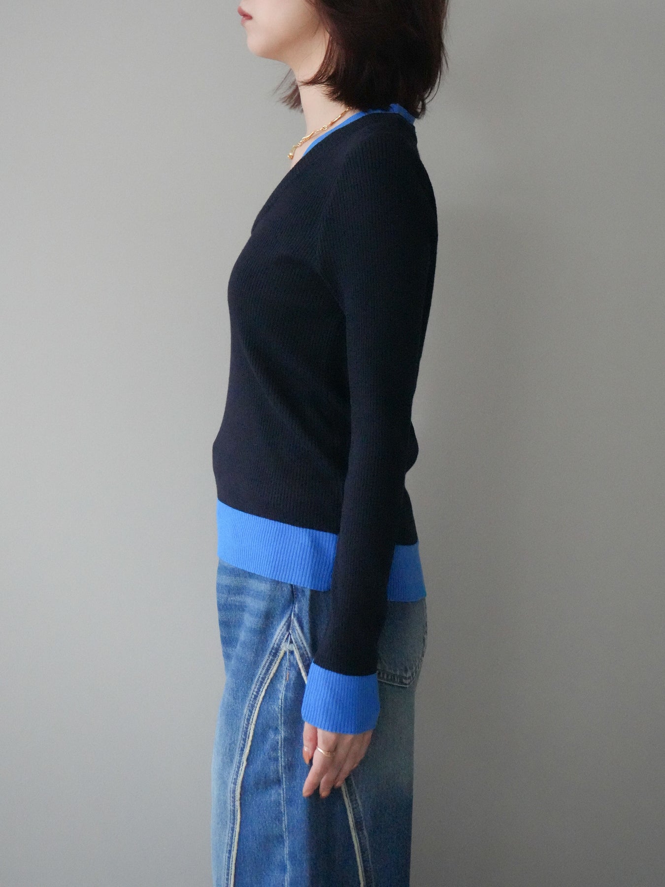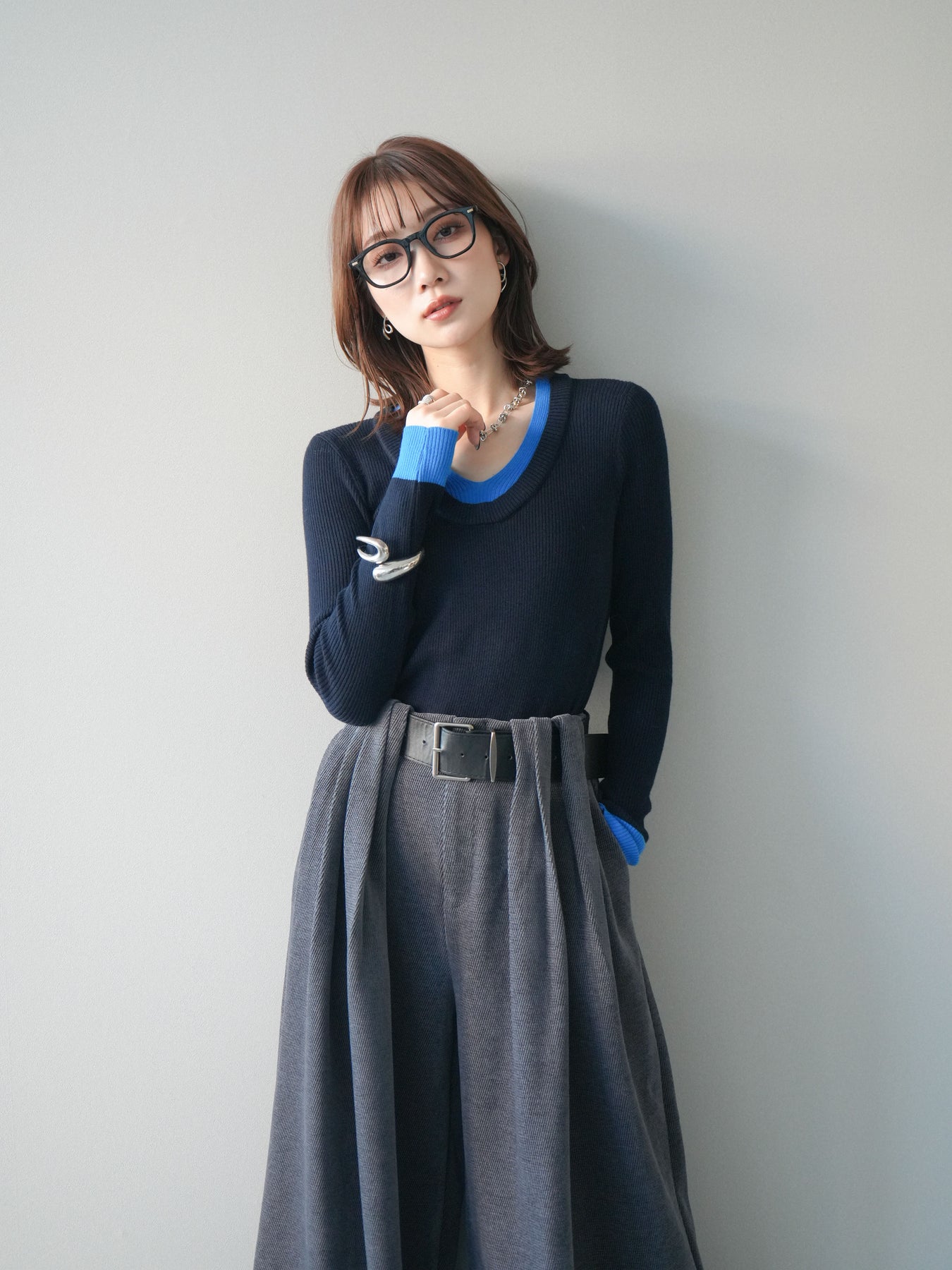 [予約]Uネック配色レイヤードリブニットトップス/black