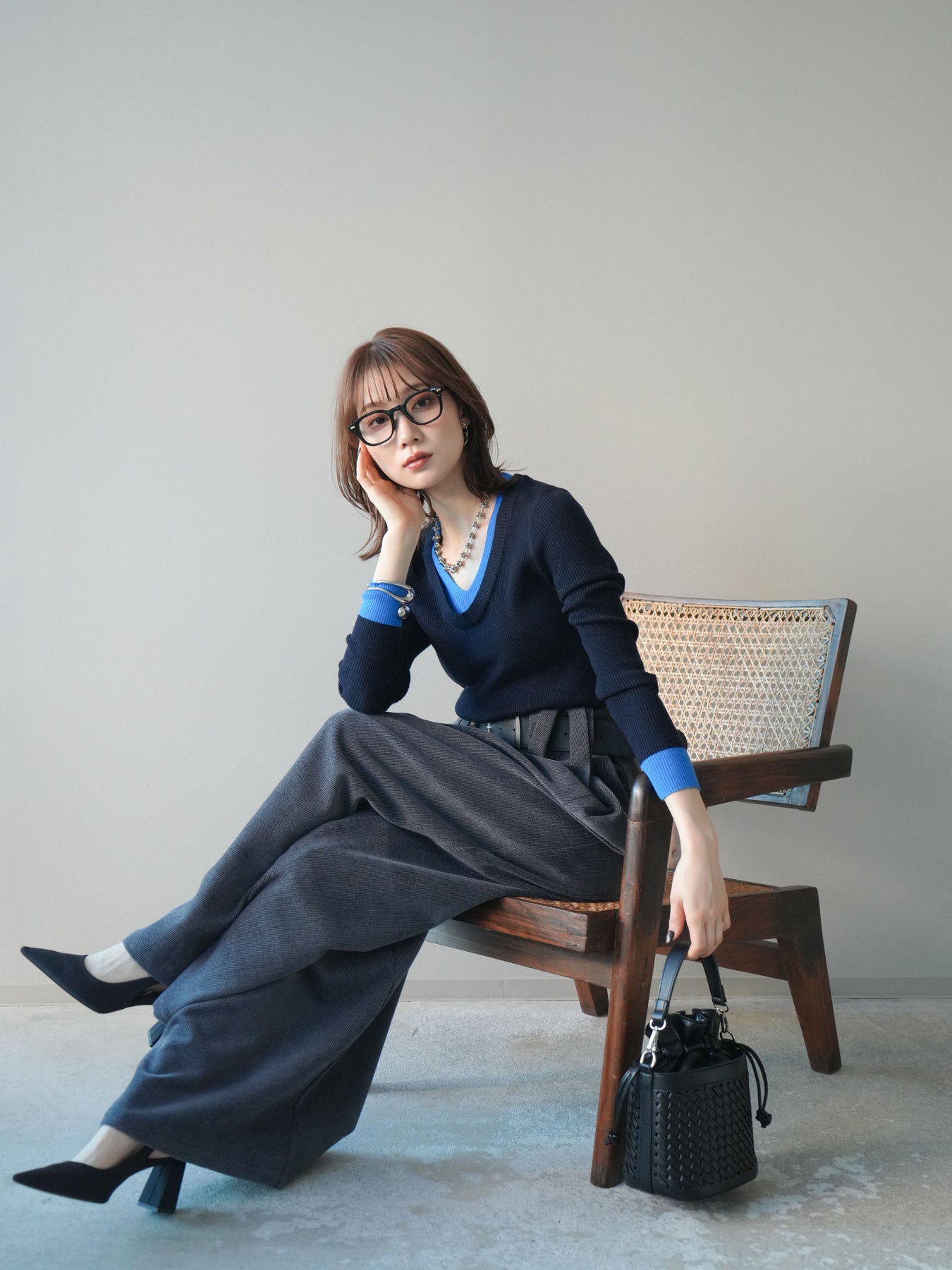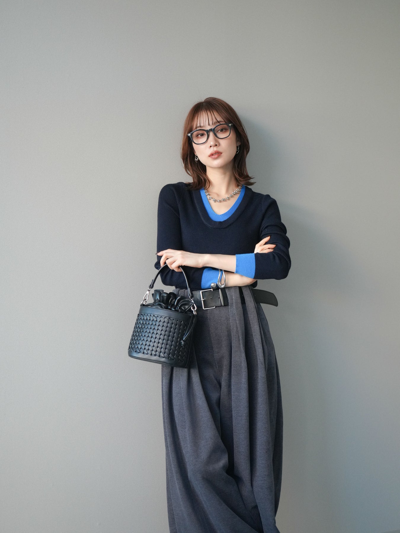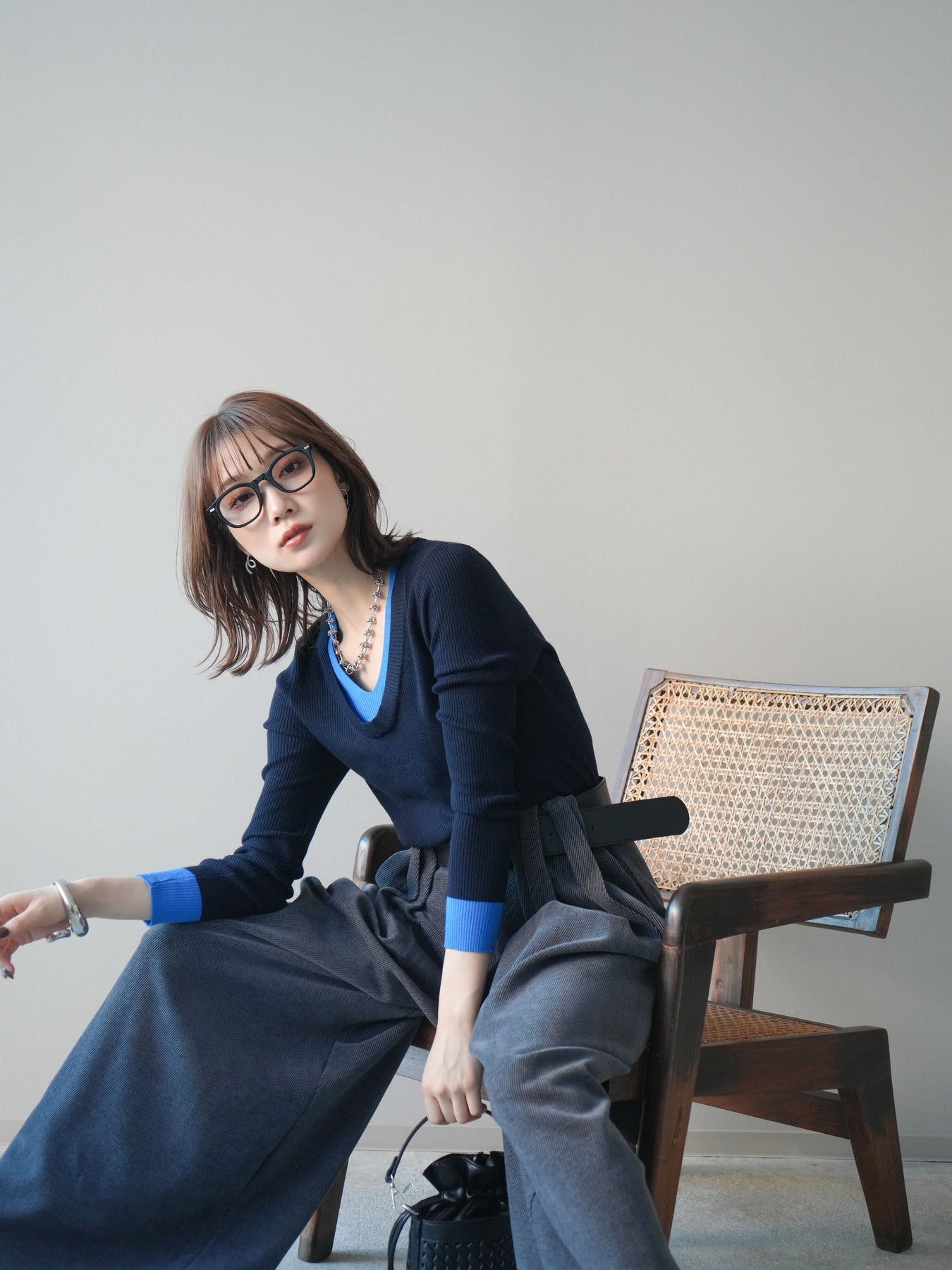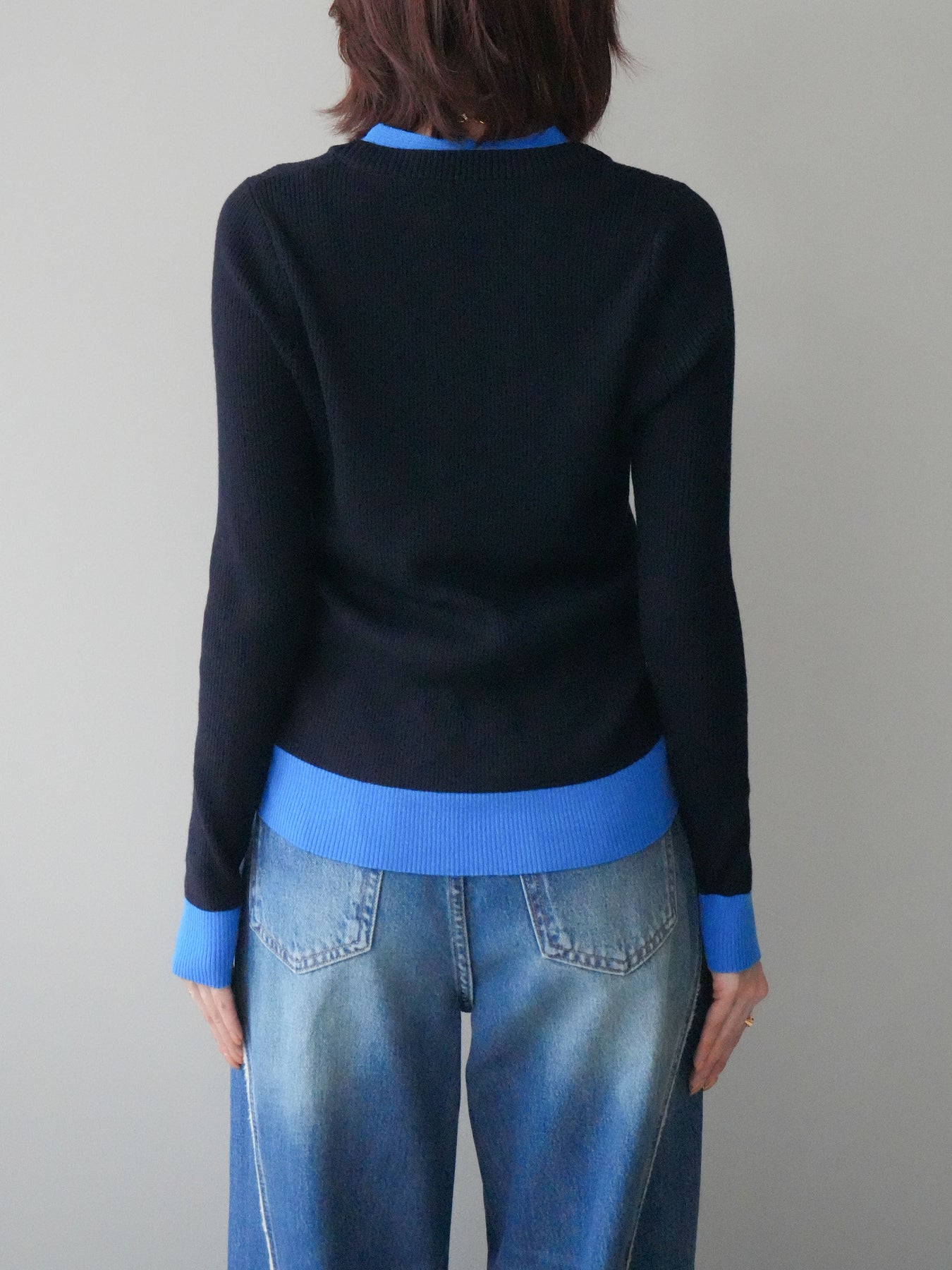 [予約]Uネック配色レイヤードリブニットトップス/black