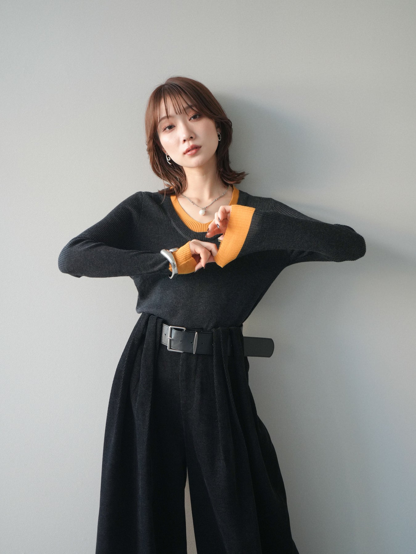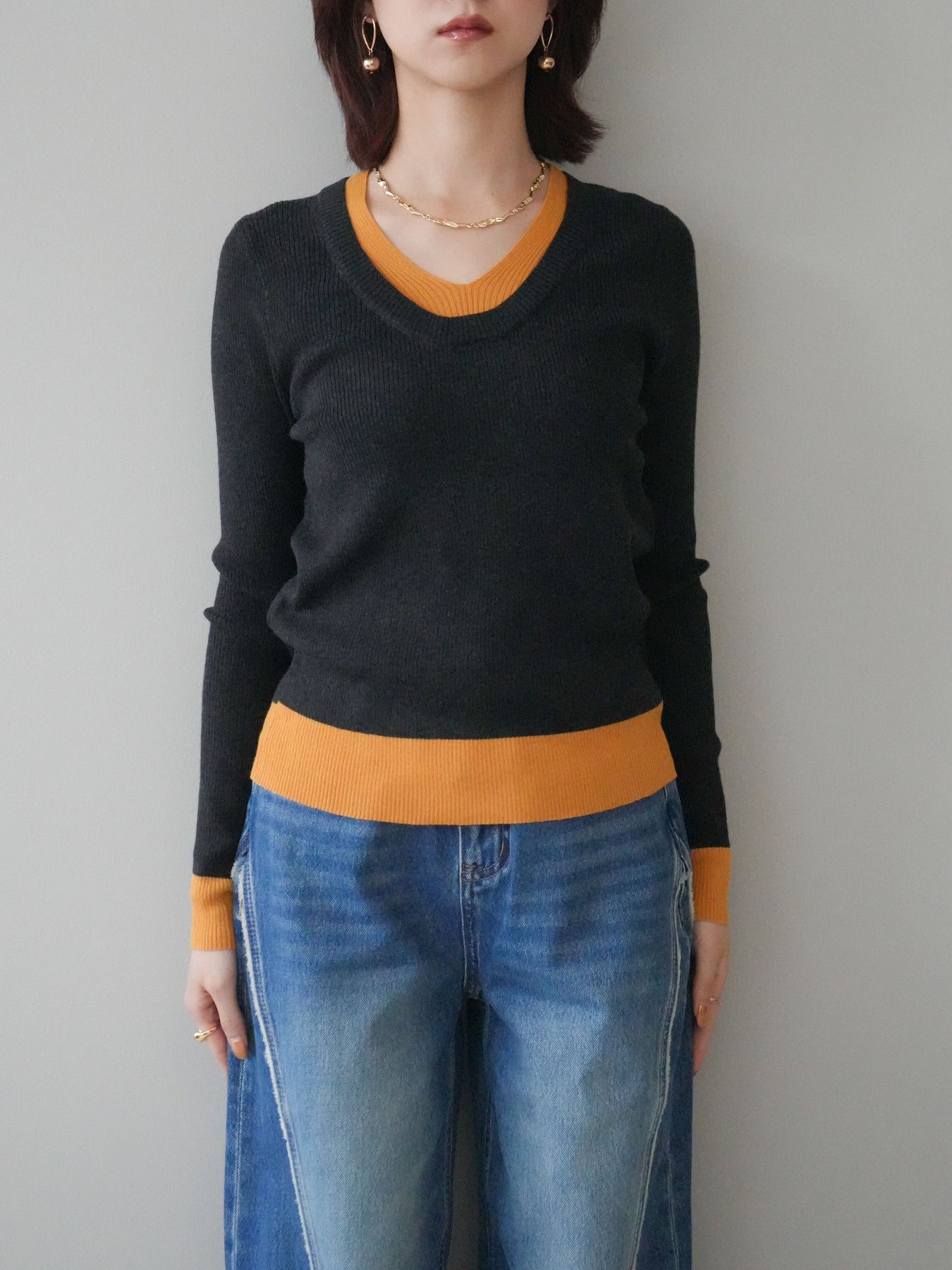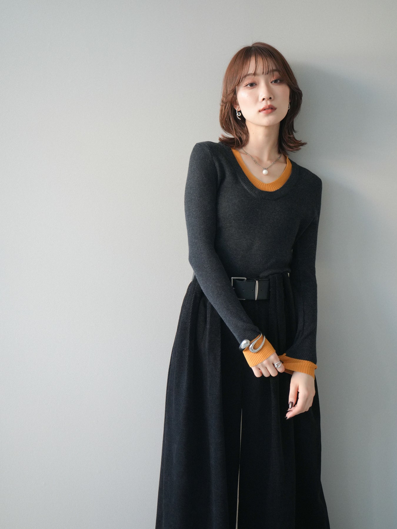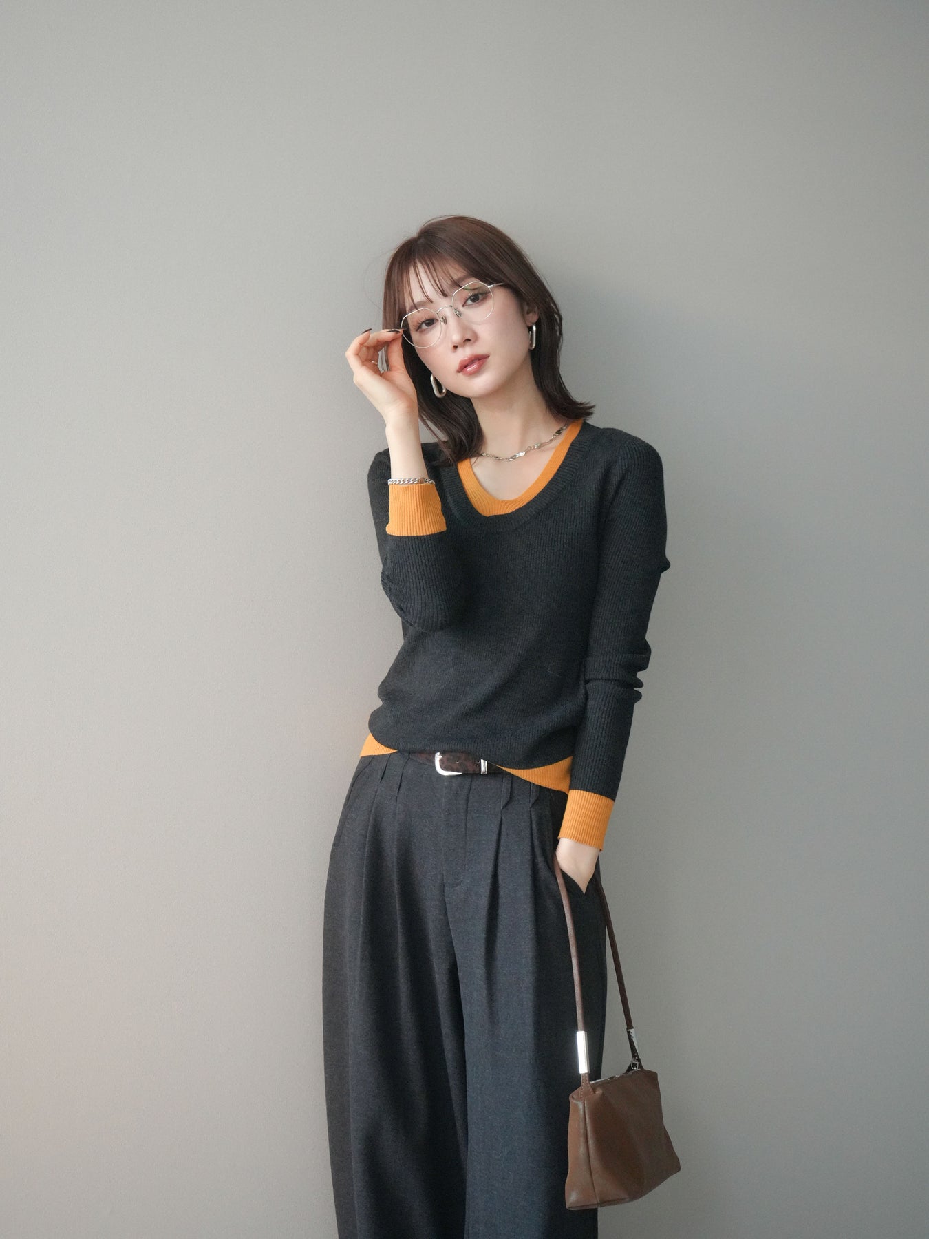 [予約]Uネック配色レイヤードリブニットトップス/charcoal