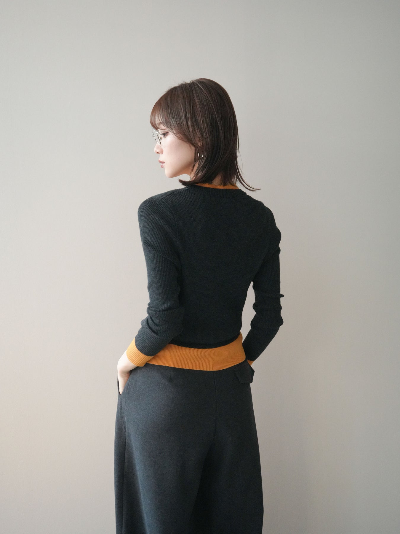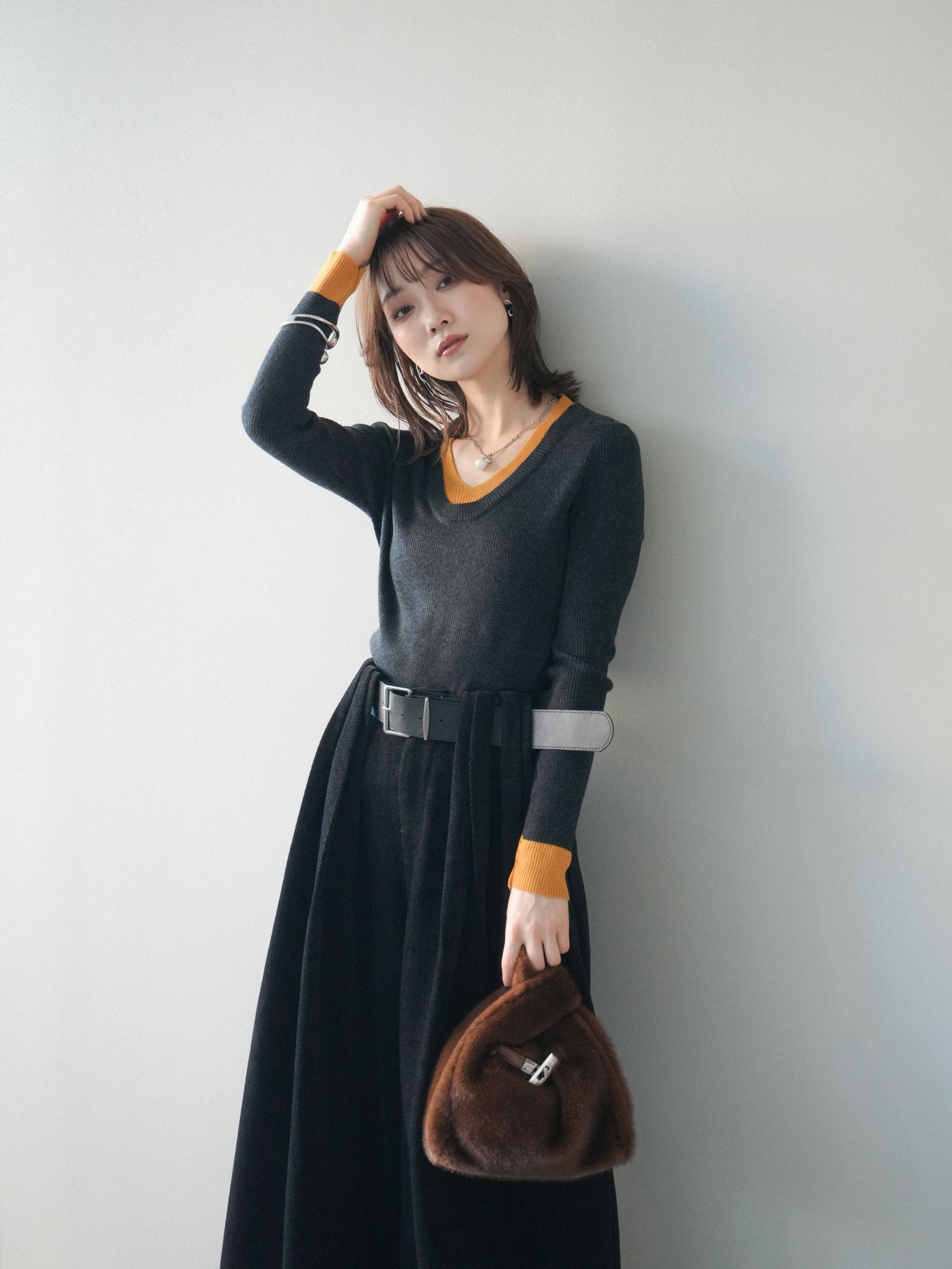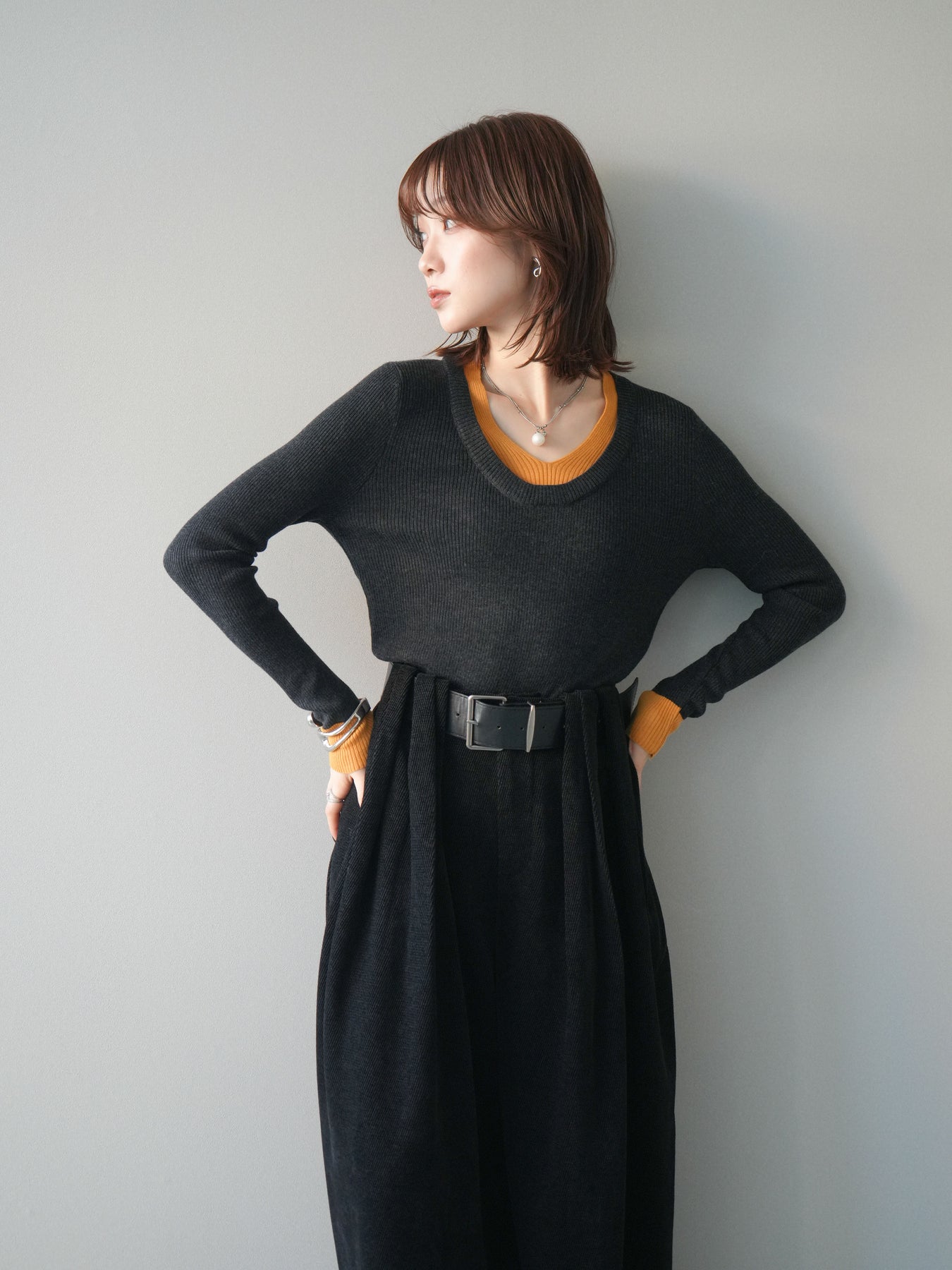 [予約]Uネック配色レイヤードリブニットトップス/charcoal