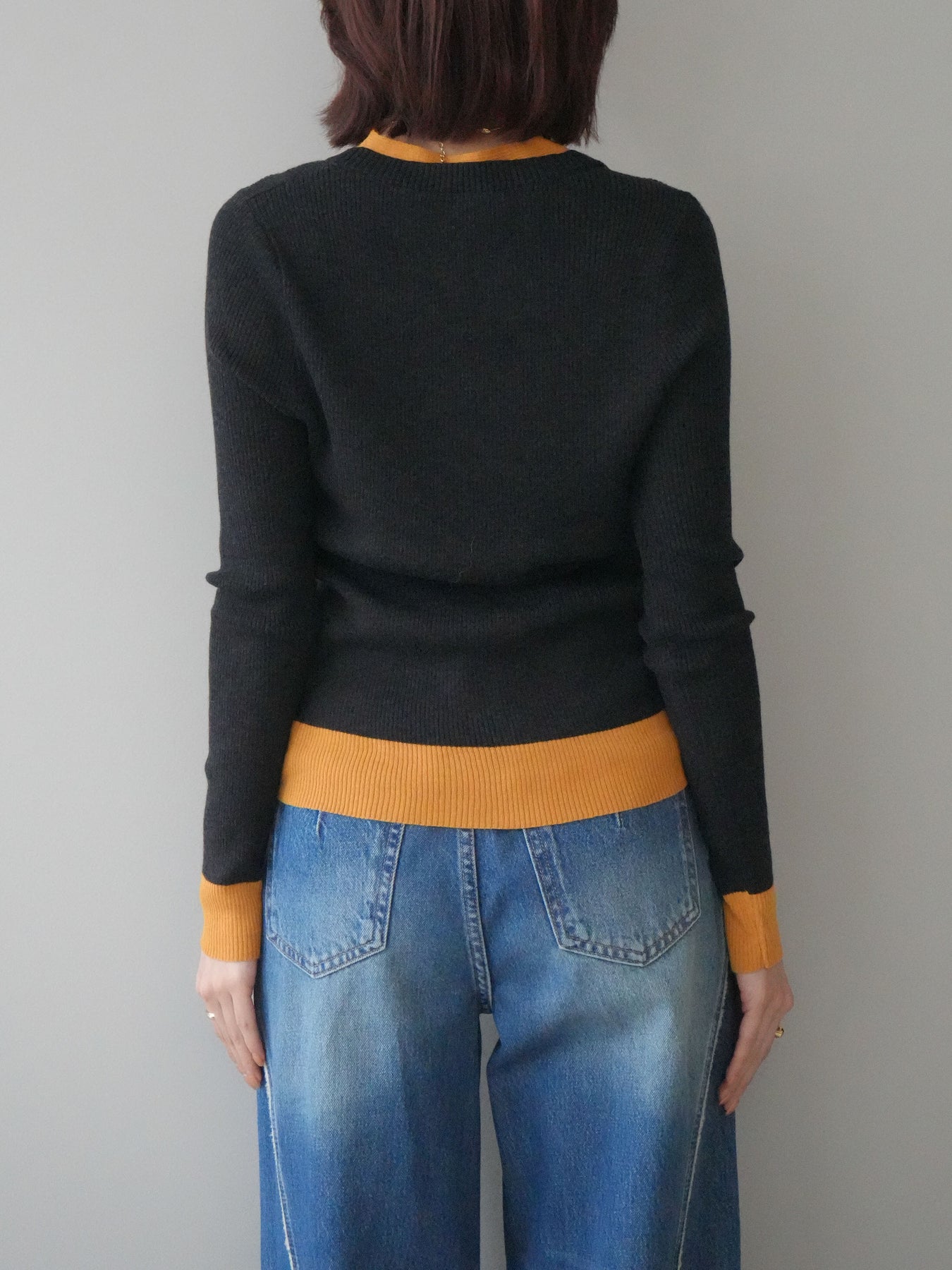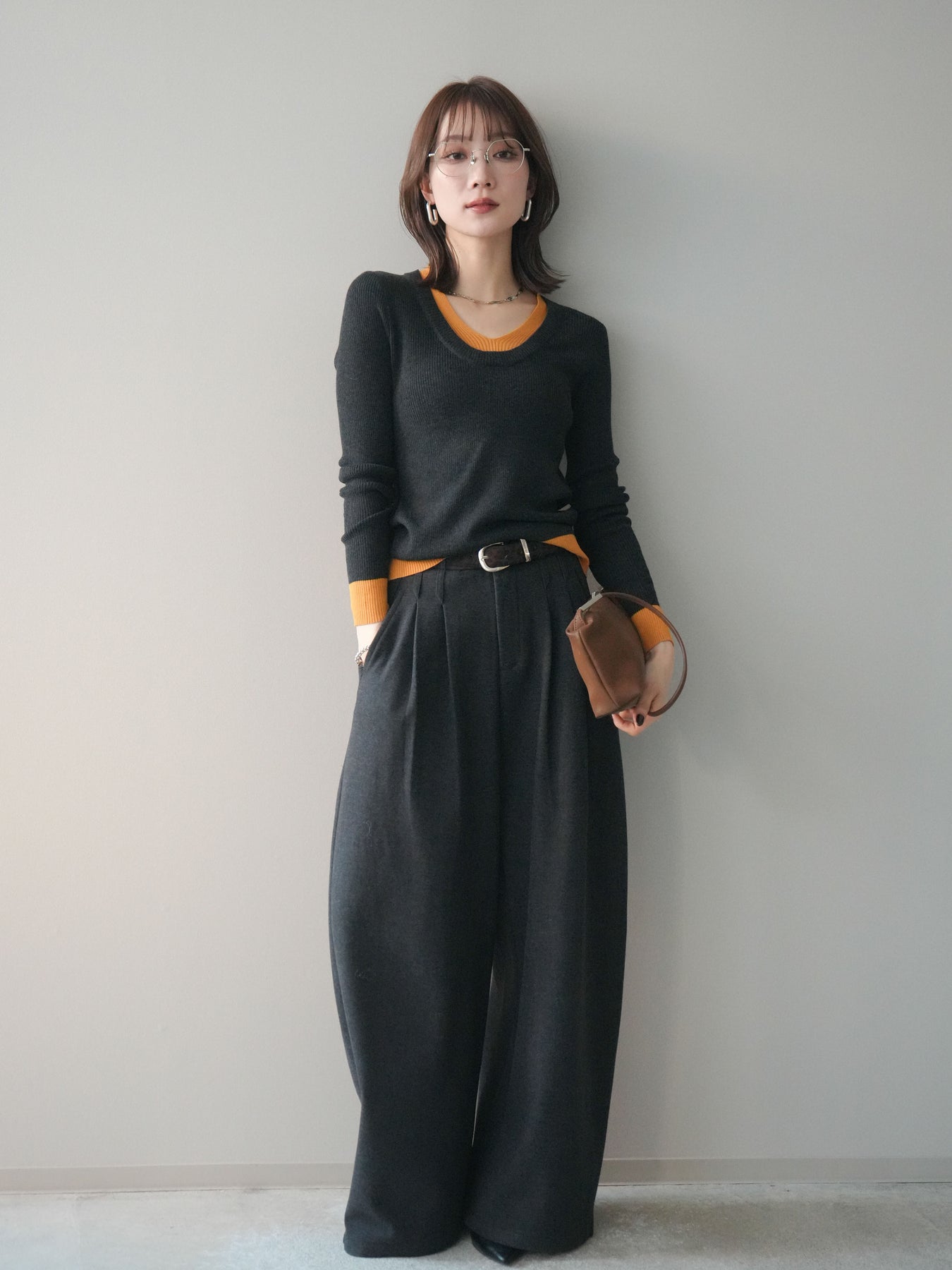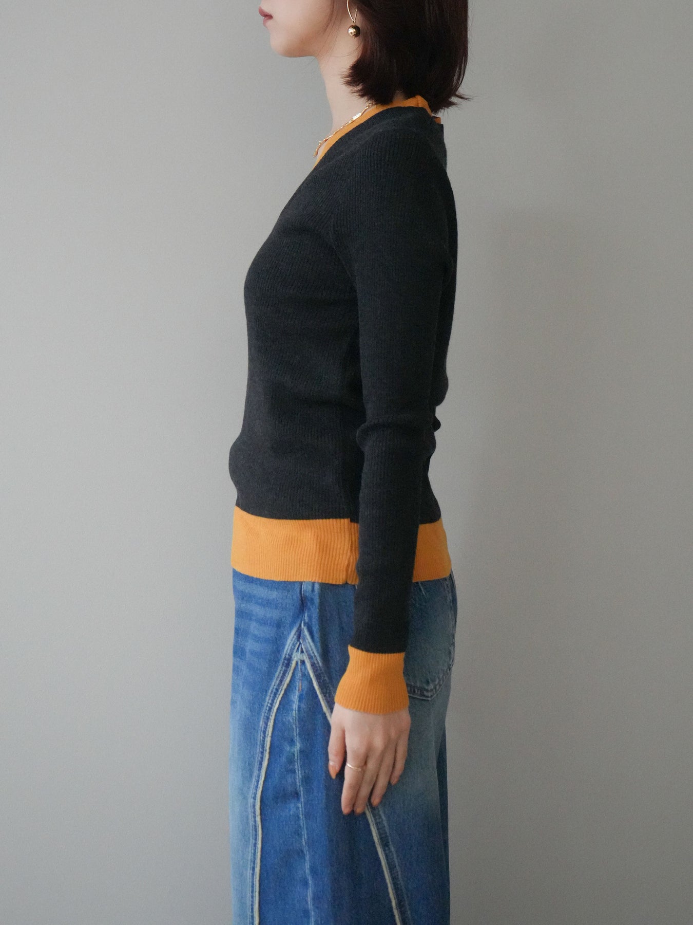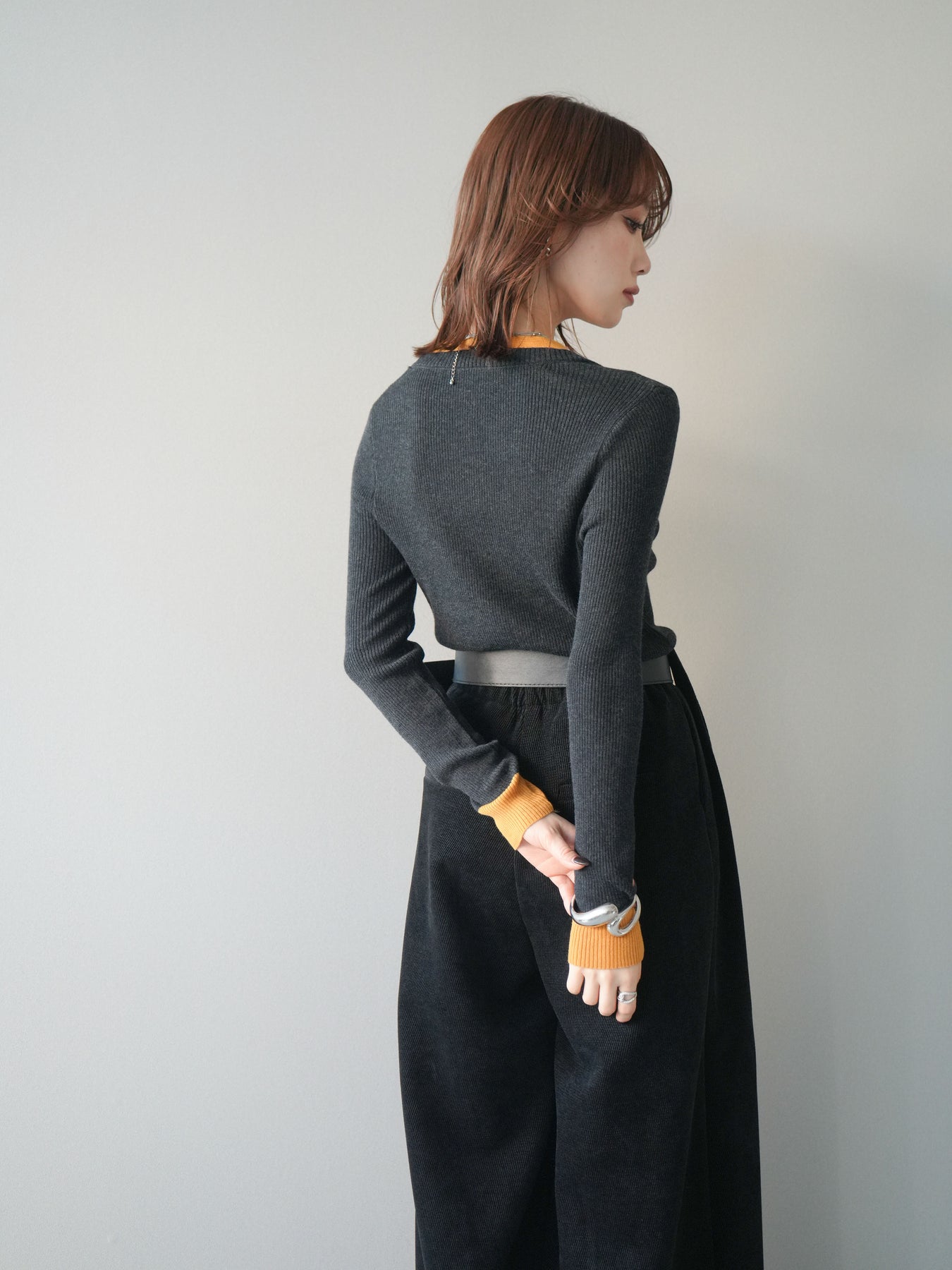 [予約]Uネック配色レイヤードリブニットトップス/charcoal
