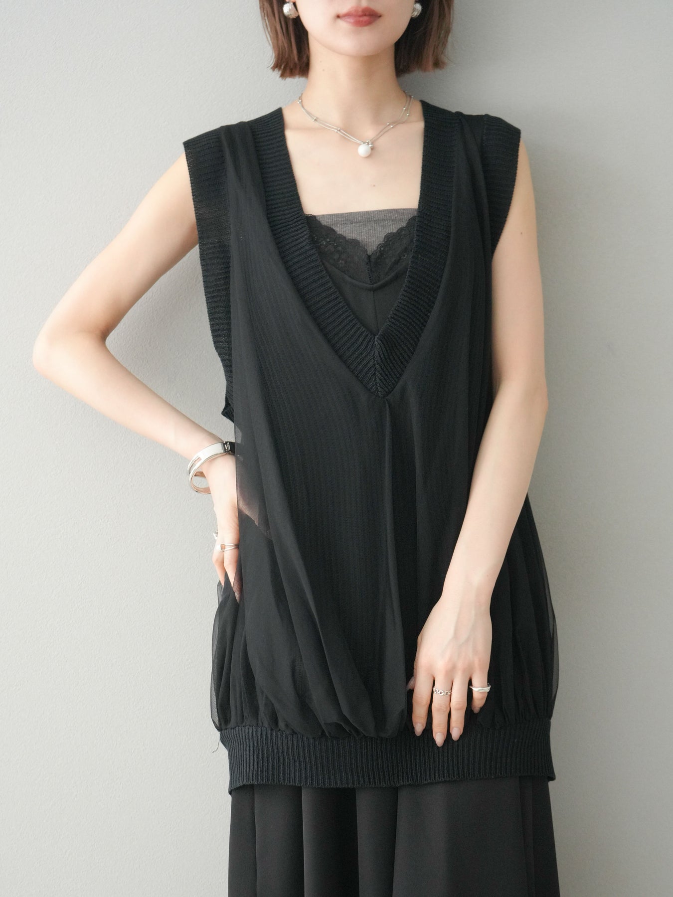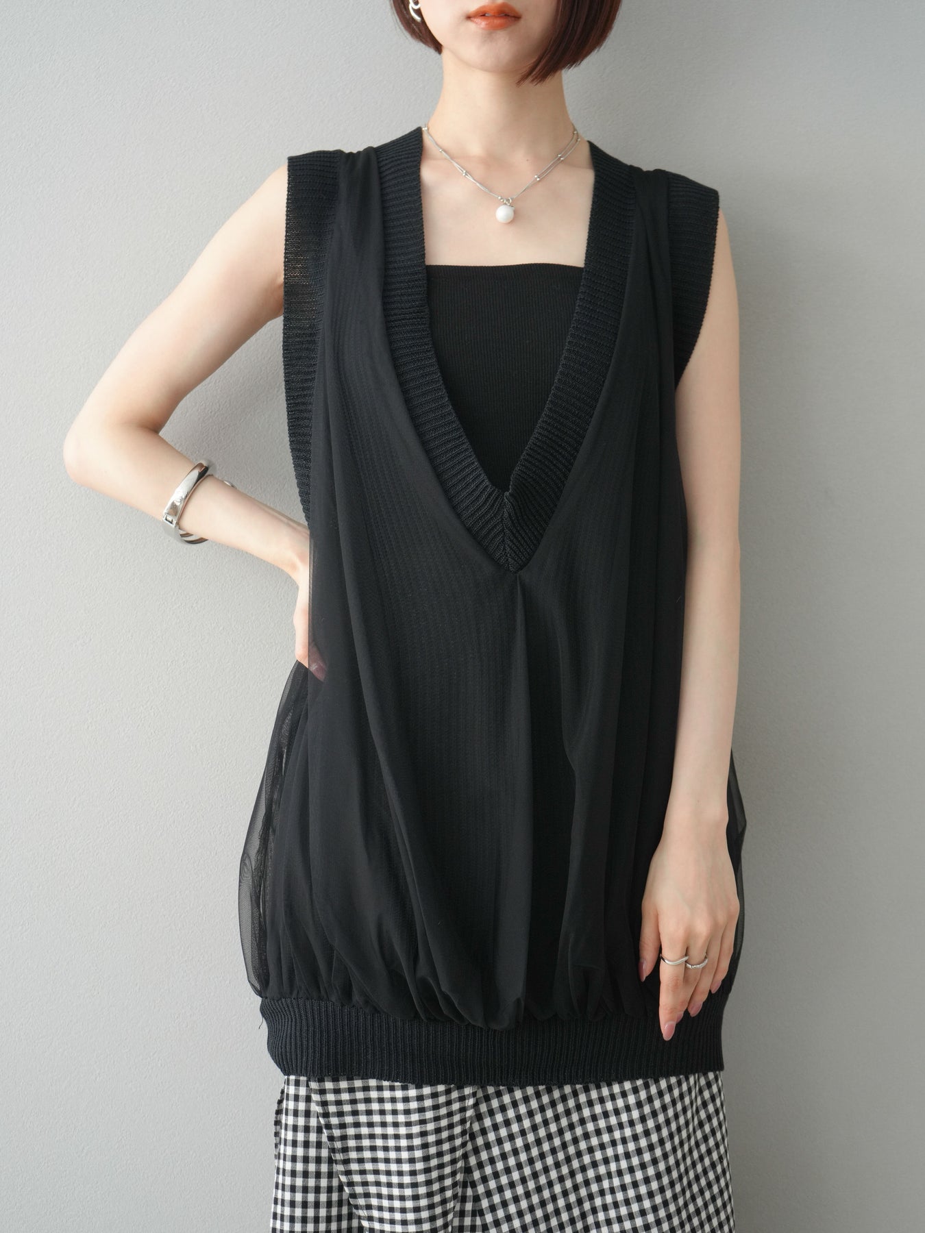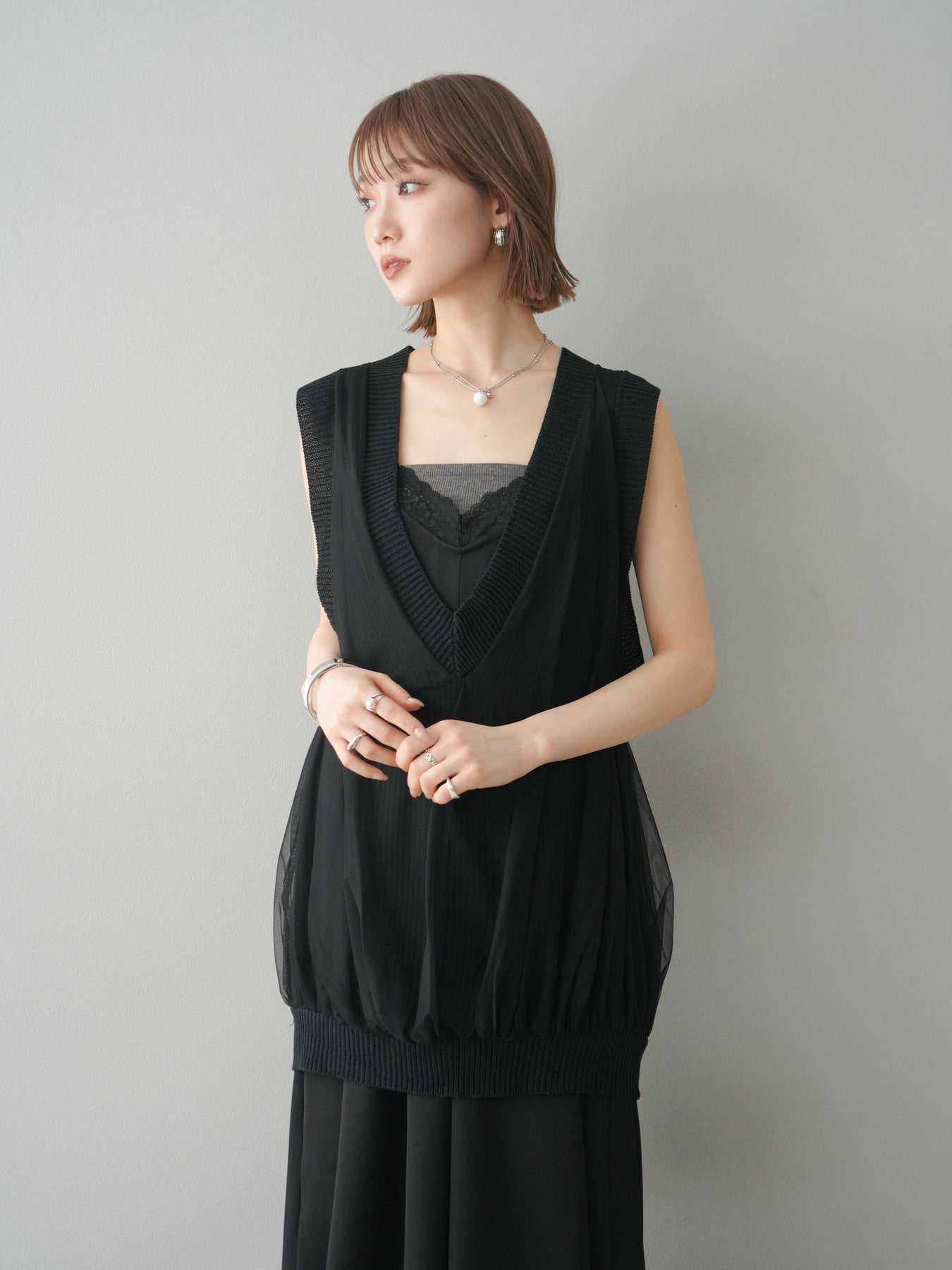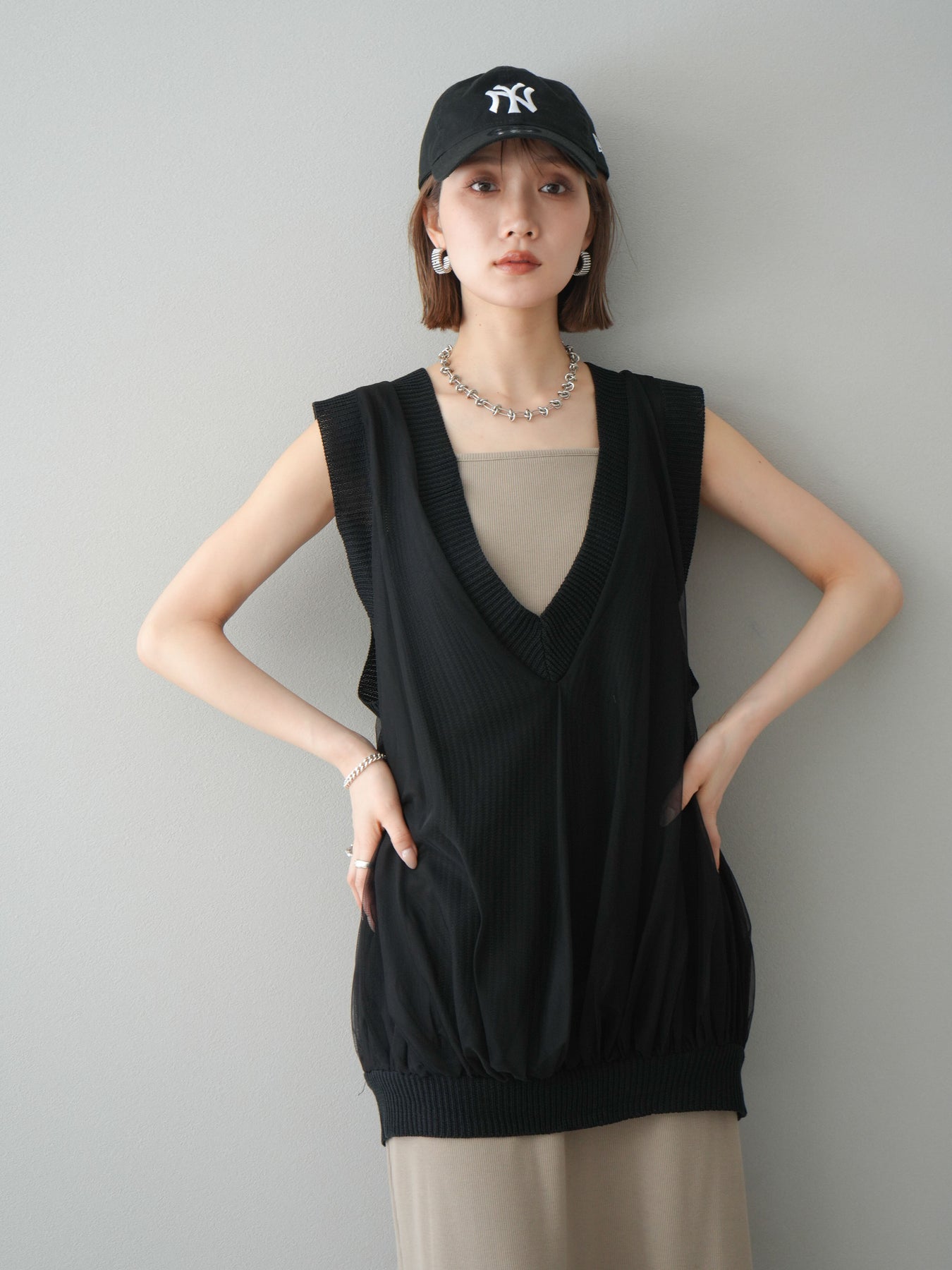 チュールとリブニットをドッキングさせた、表情豊かなVネックベスト。シアー感のあるチュールが軽やかさを演出し、レイヤードスタイルに奥行きを与えます。深めのVネックデザインが抜け感をプラスし、インナーとの組み合わせで様々な表情に。トレンドライクなディテールを取り入れた、着映え力抜群の1枚です。 ※ボトムス、キャミソール(インナー)以外の商品は一律でインナーは付属していません