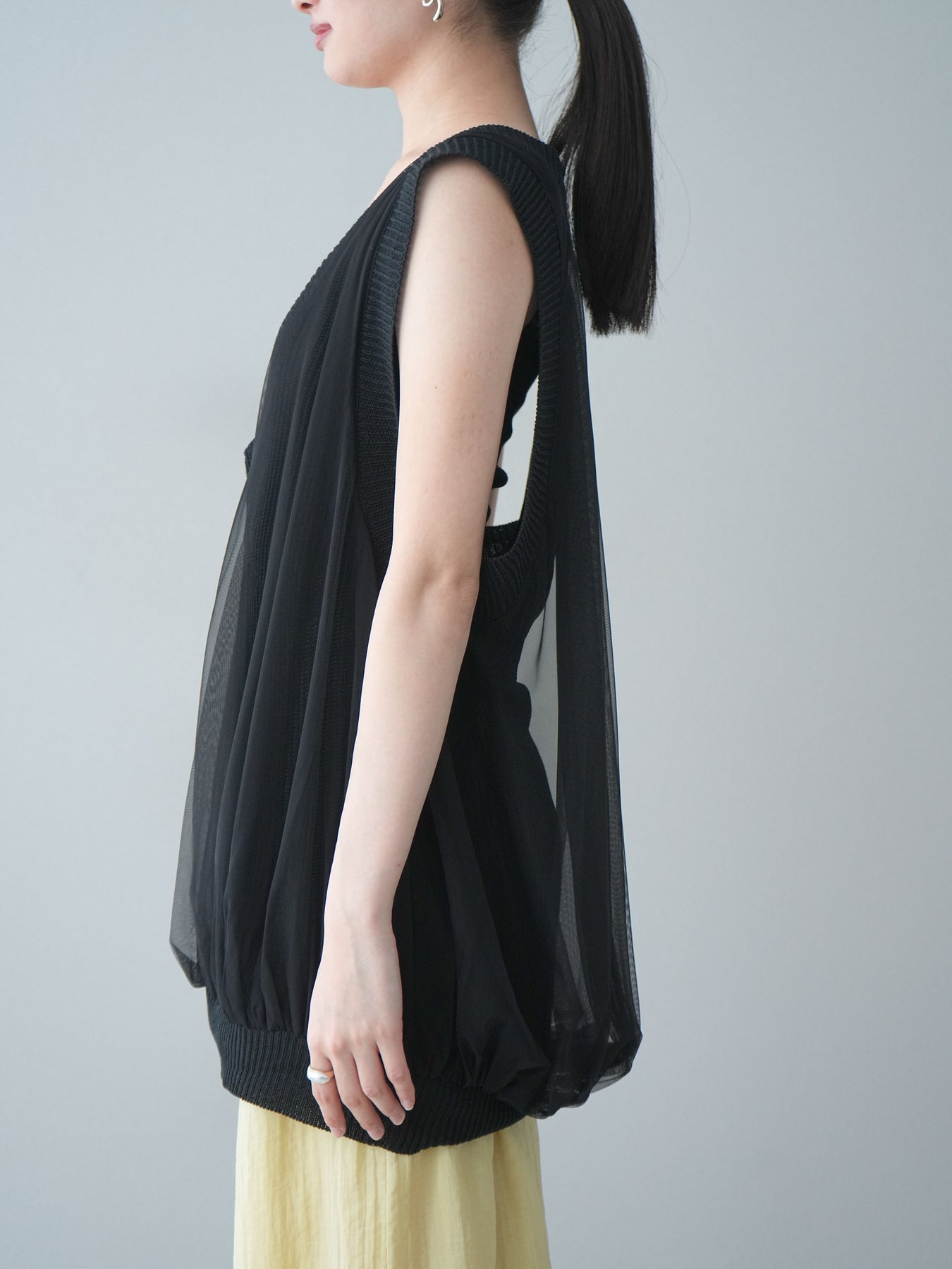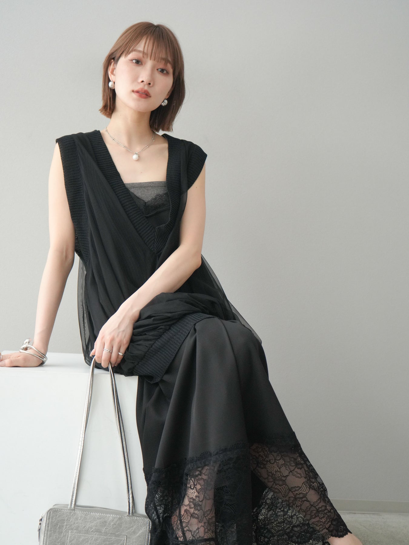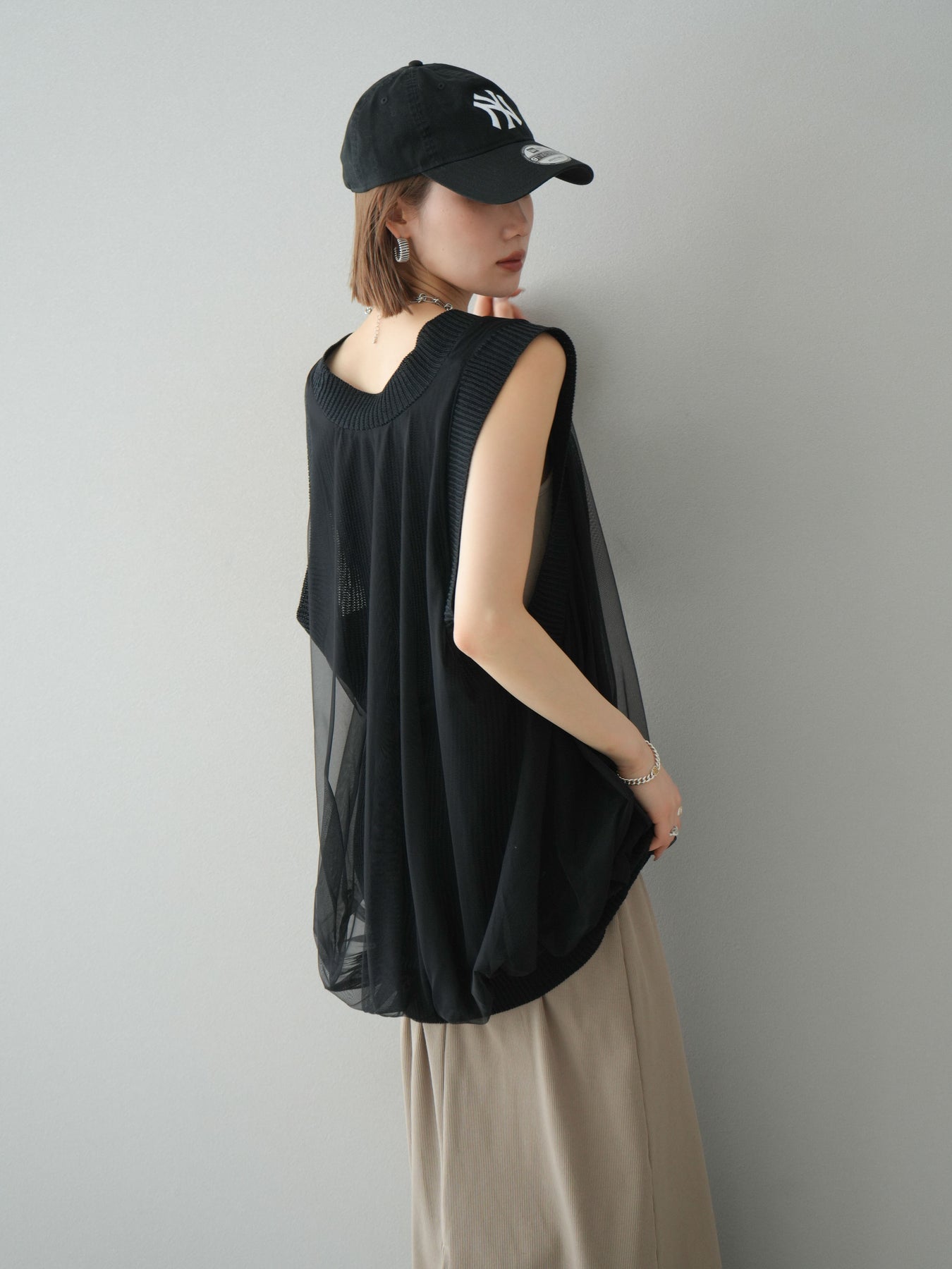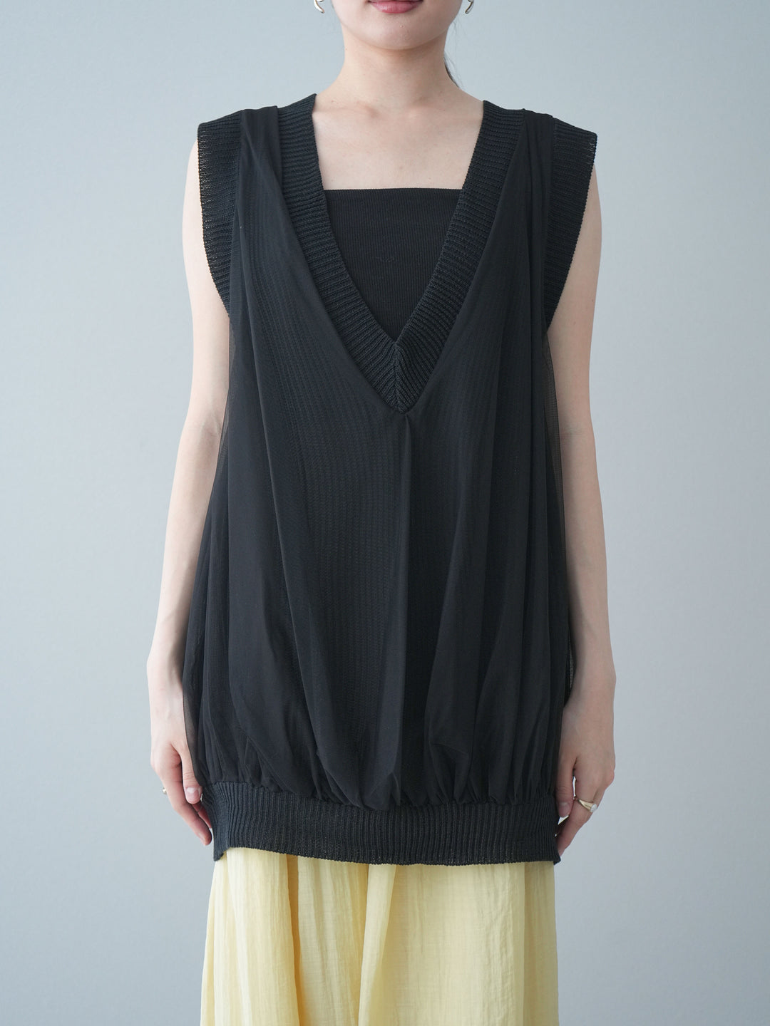 チュールとリブニットをドッキングさせた、表情豊かなVネックベスト。シアー感のあるチュールが軽やかさを演出し、レイヤードスタイルに奥行きを与えます。深めのVネックデザインが抜け感をプラスし、インナーとの組み合わせで様々な表情に。トレンドライクなディテールを取り入れた、着映え力抜群の1枚です。 ※ボトムス、キャミソール(インナー)以外の商品は一律でインナーは付属していません