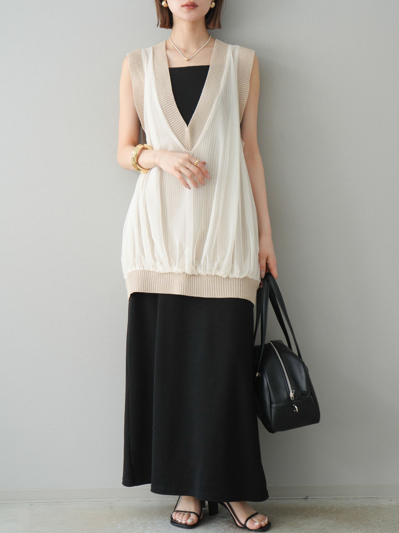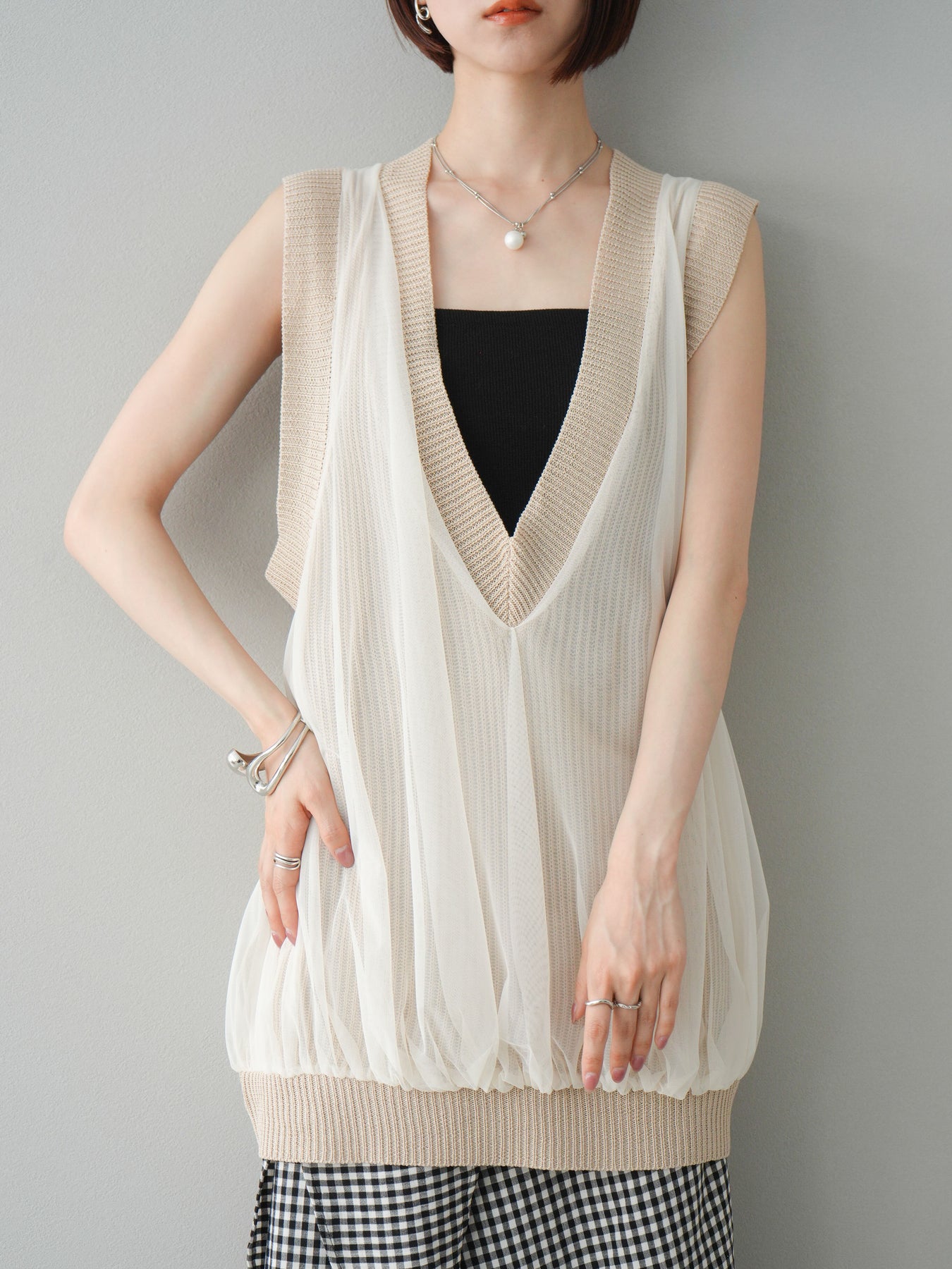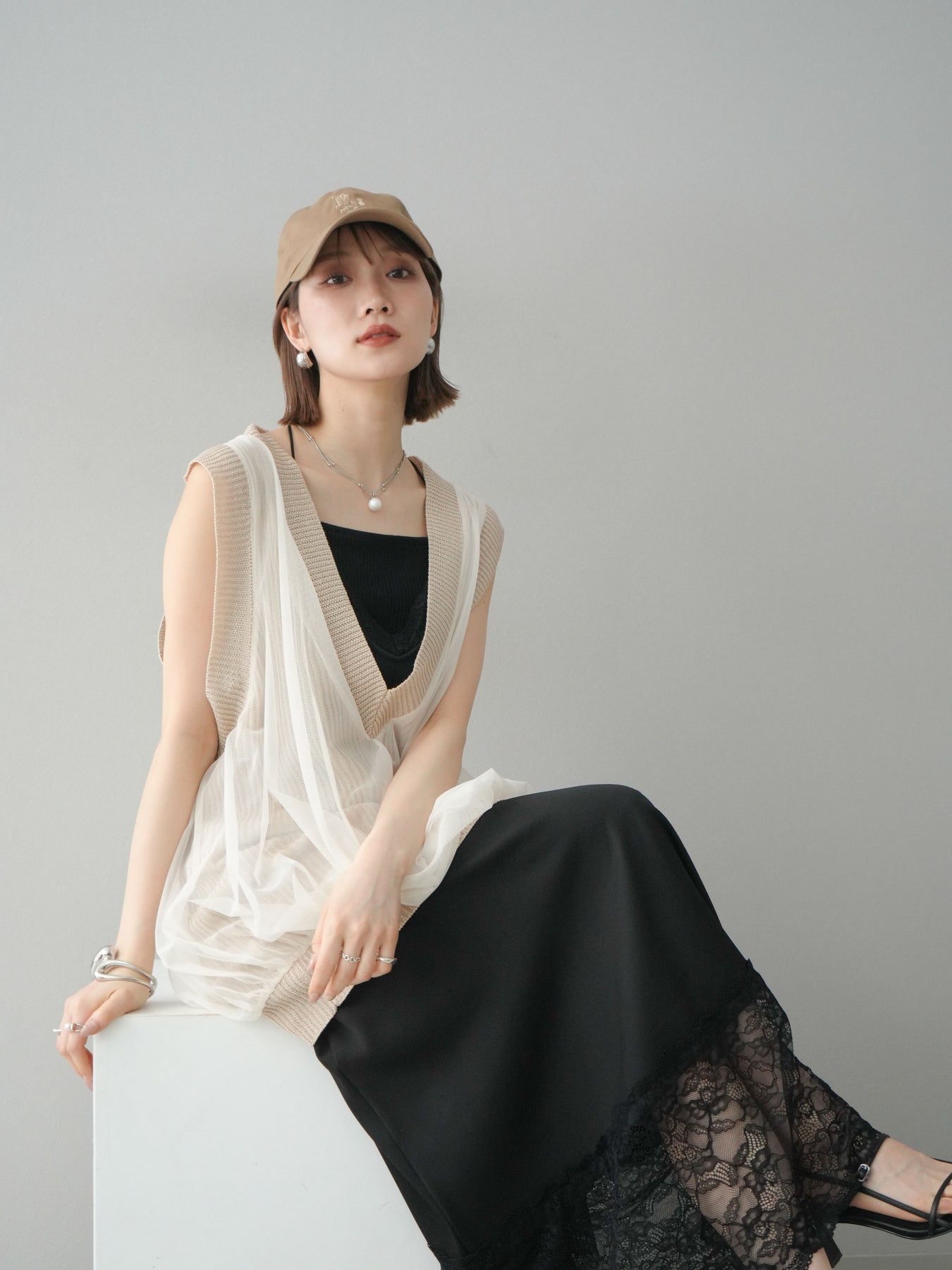 チュールとリブニットをドッキングさせた、表情豊かなVネックベスト。シアー感のあるチュールが軽やかさを演出し、レイヤードスタイルに奥行きを与えます。深めのVネックデザインが抜け感をプラスし、インナーとの組み合わせで様々な表情に。トレンドライクなディテールを取り入れた、着映え力抜群の1枚です。 ※ボトムス、キャミソール(インナー)以外の商品は一律でインナーは付属していません