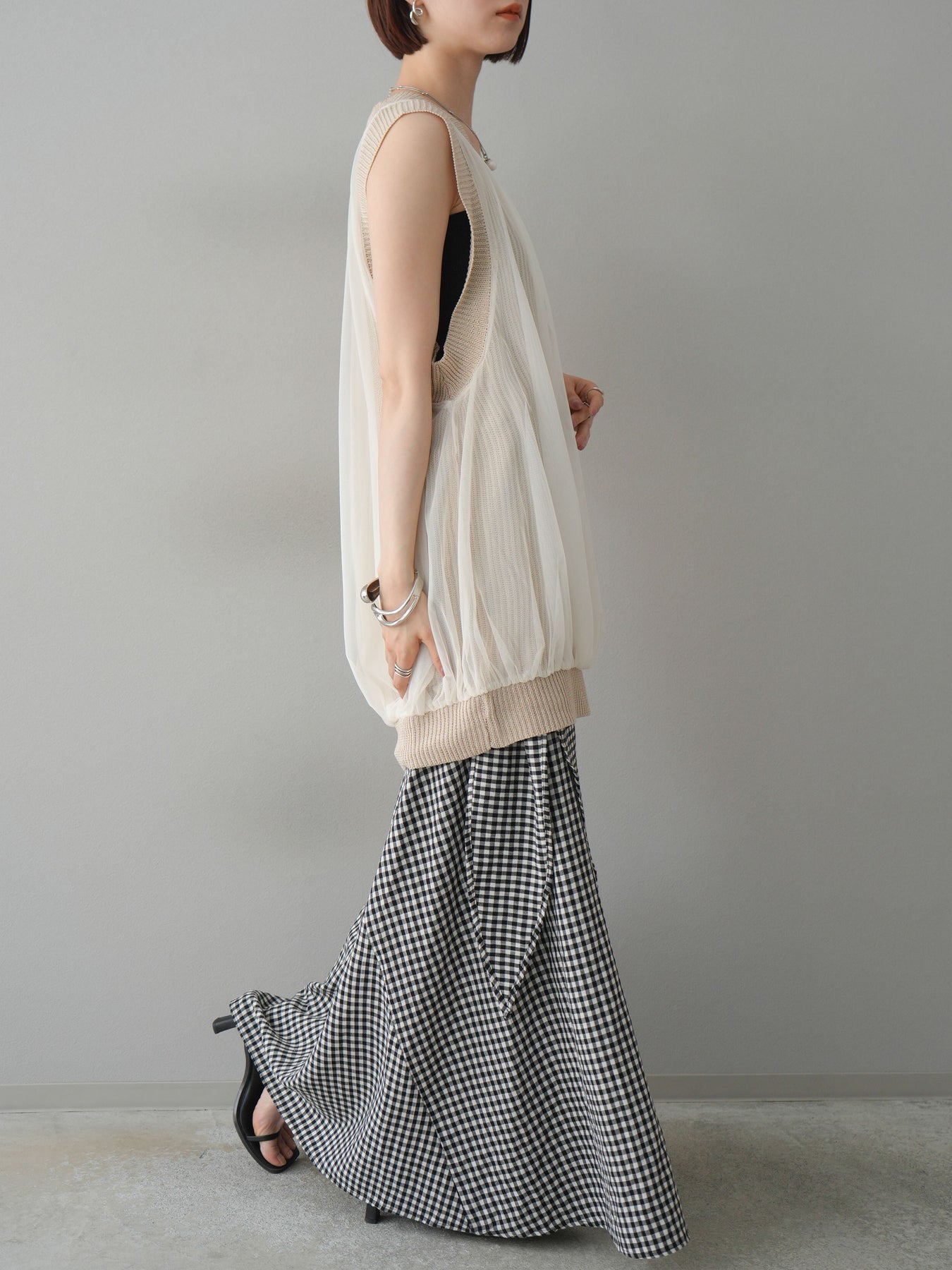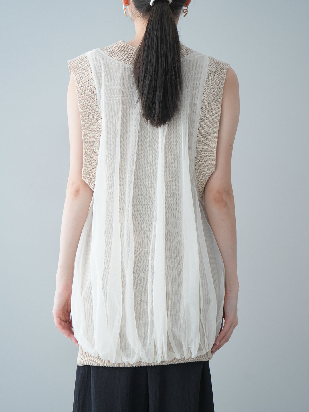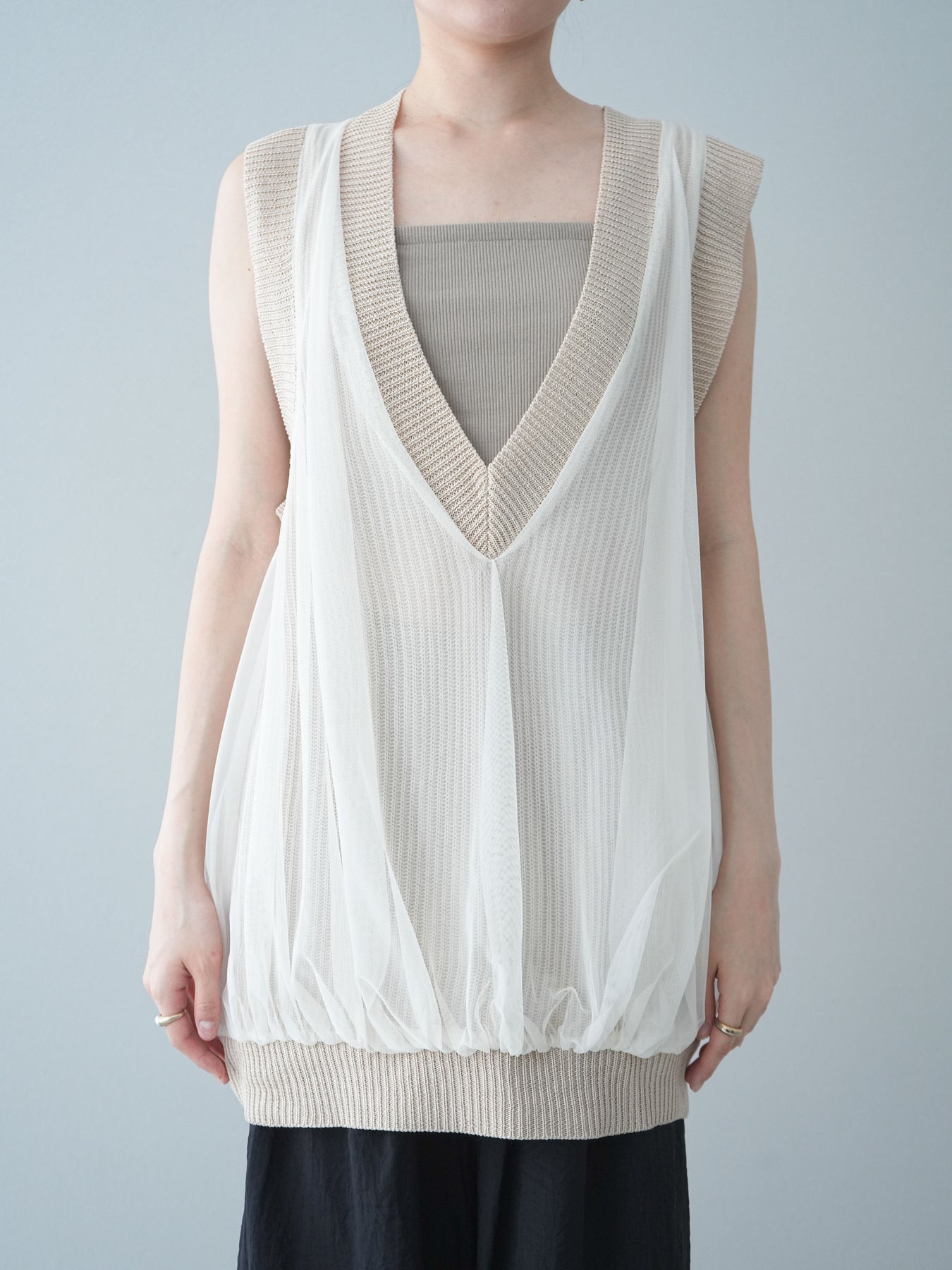 チュールとリブニットをドッキングさせた、表情豊かなVネックベスト。シアー感のあるチュールが軽やかさを演出し、レイヤードスタイルに奥行きを与えます。深めのVネックデザインが抜け感をプラスし、インナーとの組み合わせで様々な表情に。トレンドライクなディテールを取り入れた、着映え力抜群の1枚です。 ※ボトムス、キャミソール(インナー)以外の商品は一律でインナーは付属していません