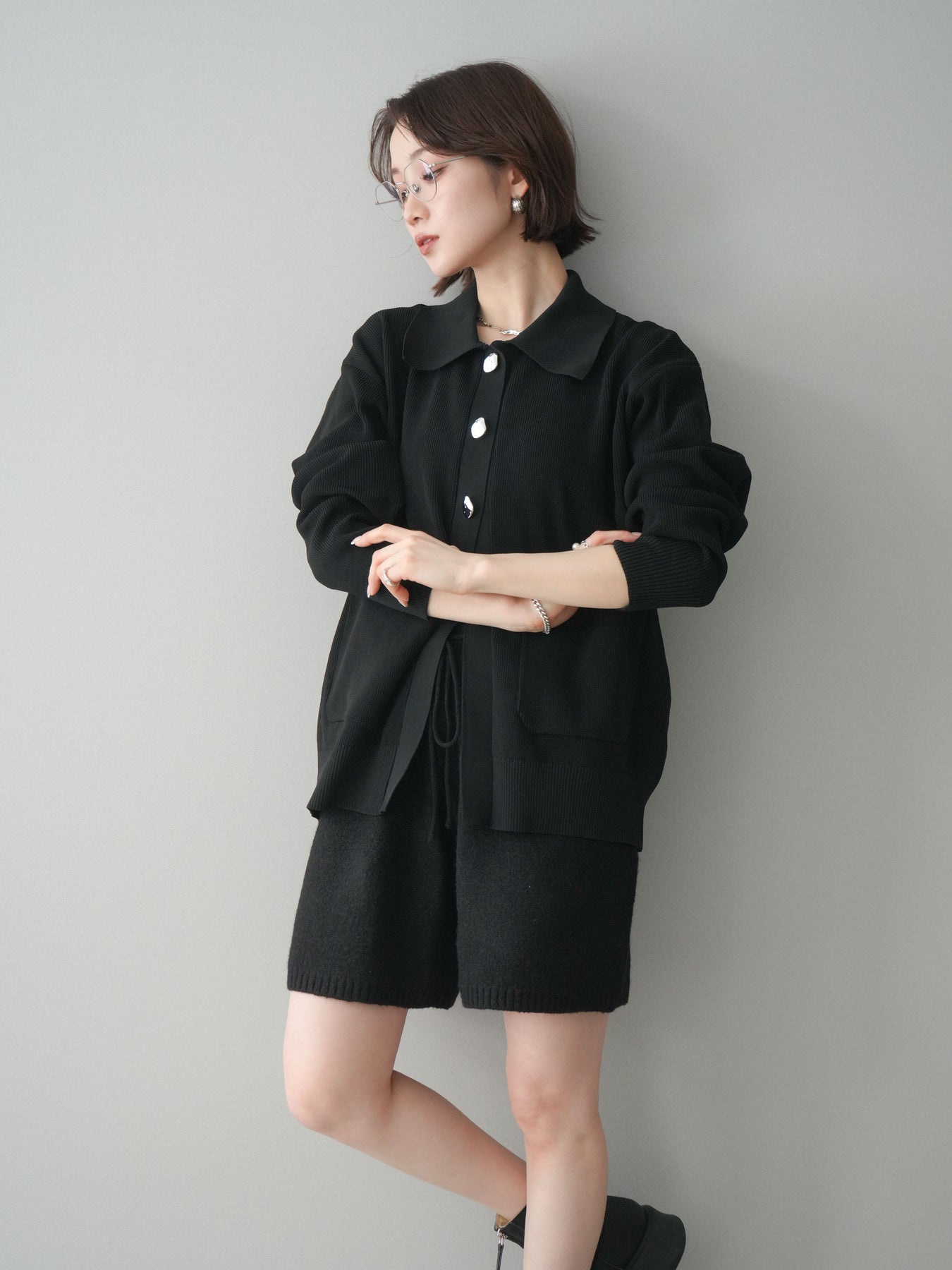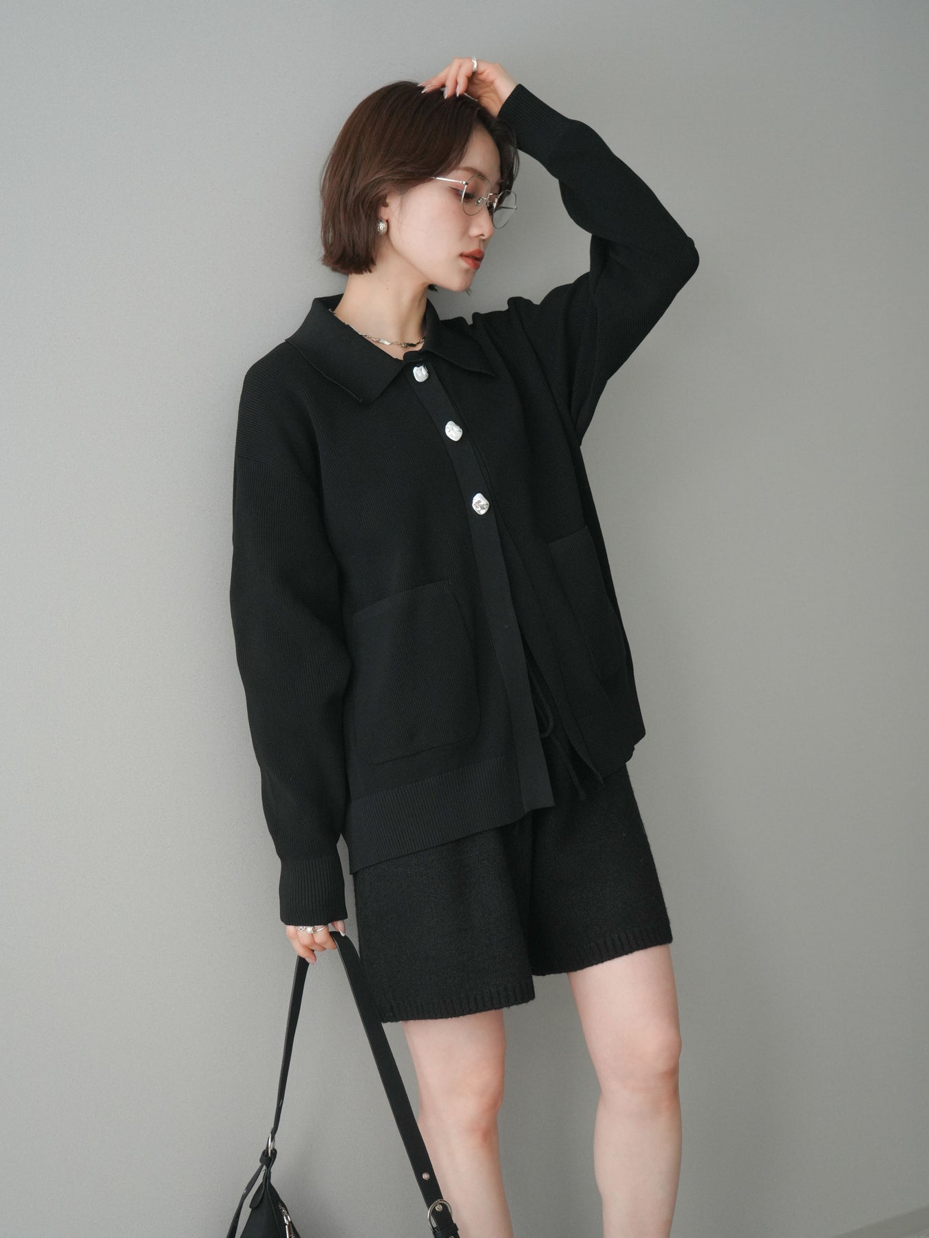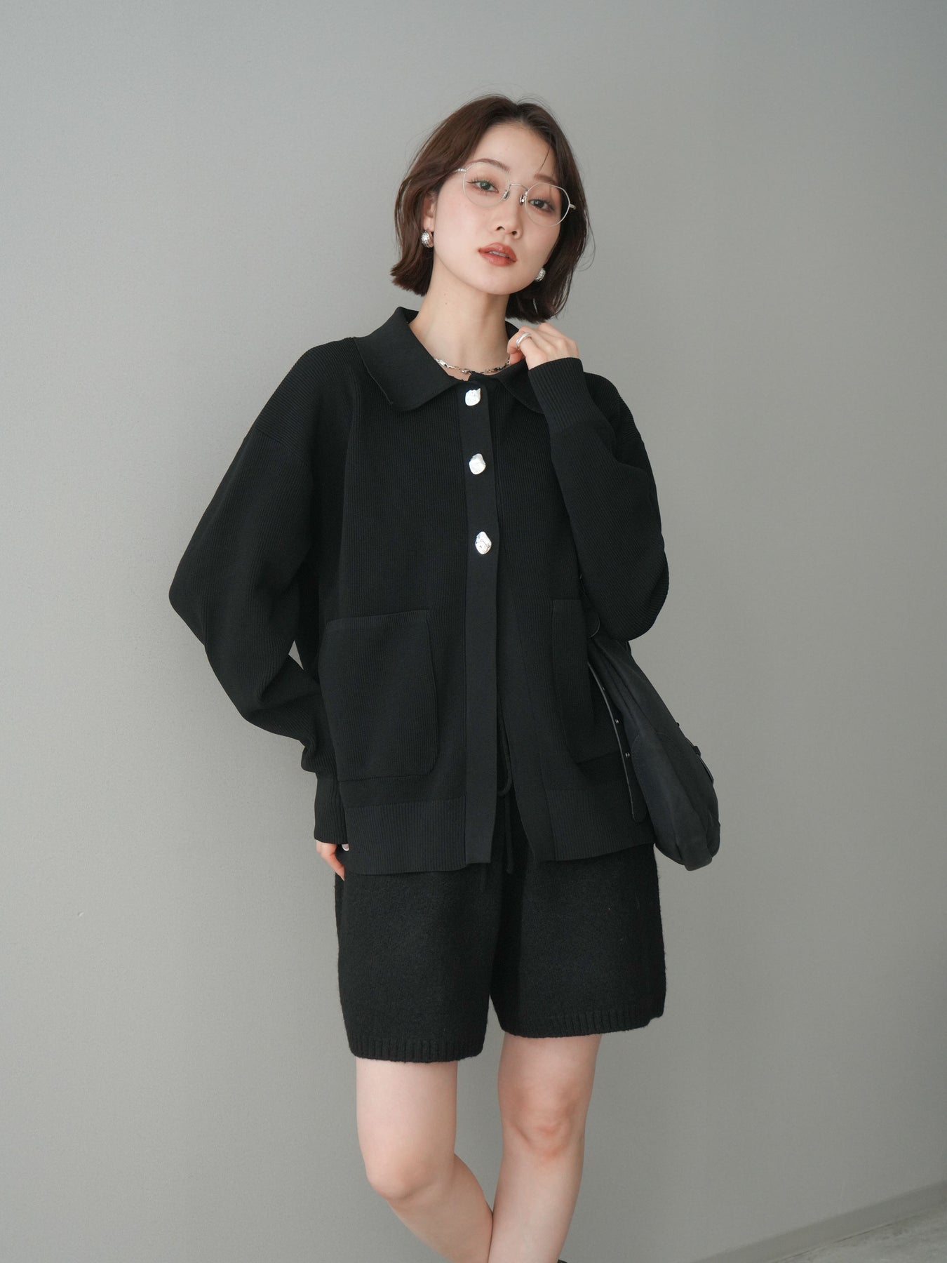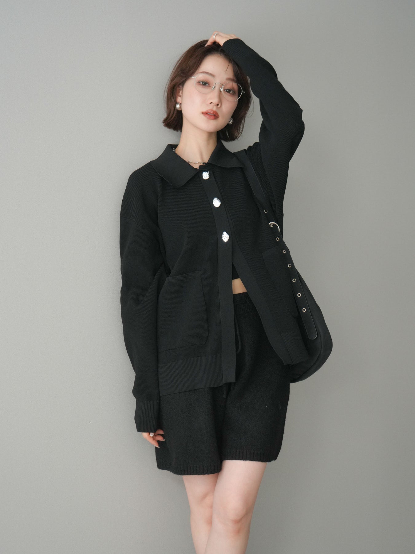 [予約]メタルボタン襟付きポリエステルニットカーディガン/black