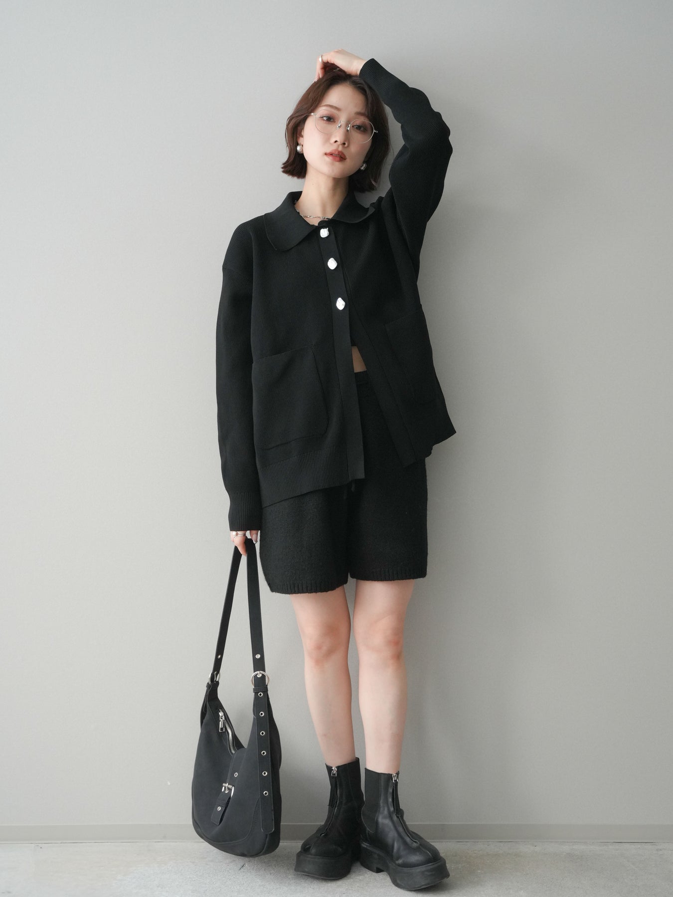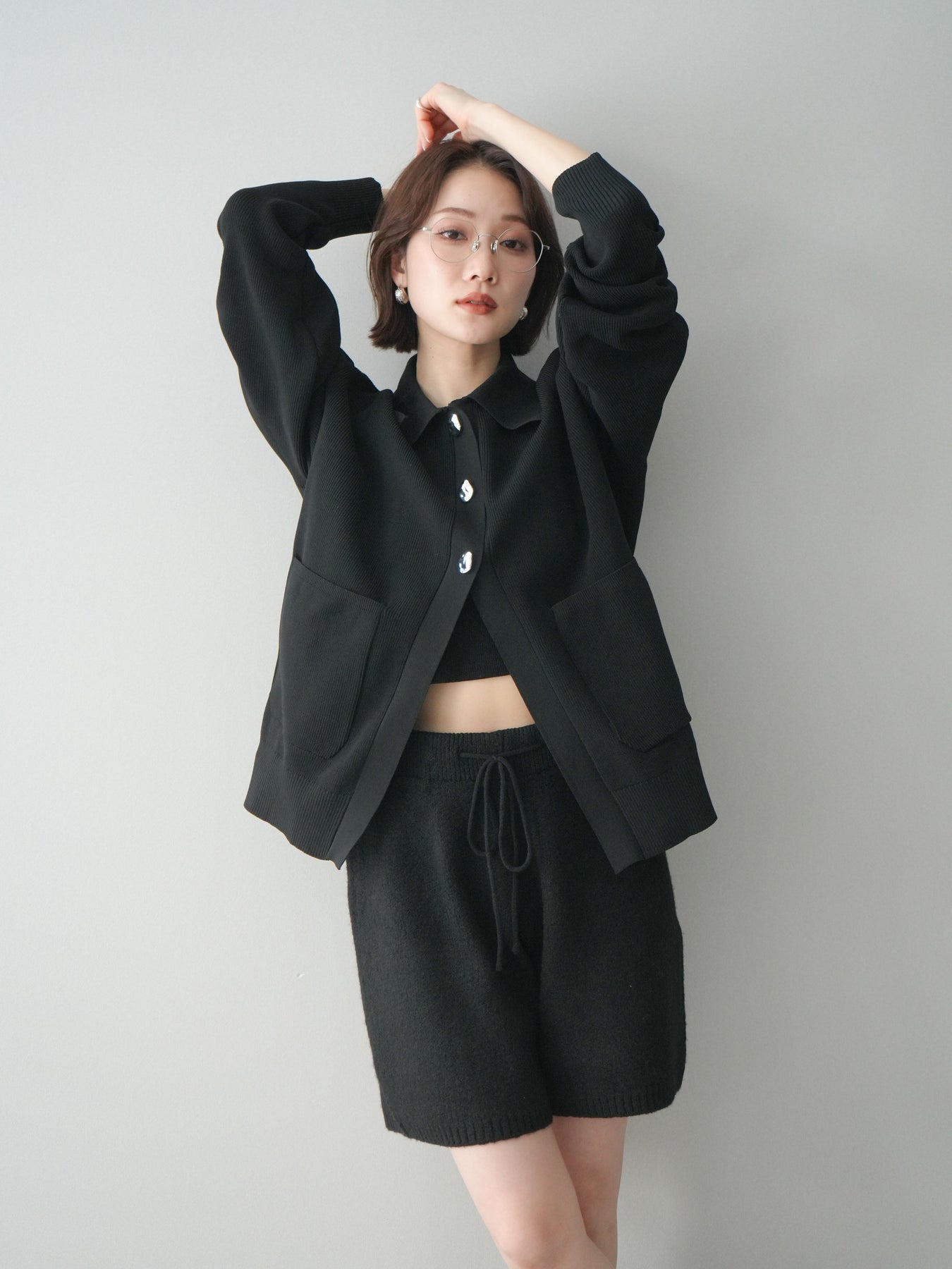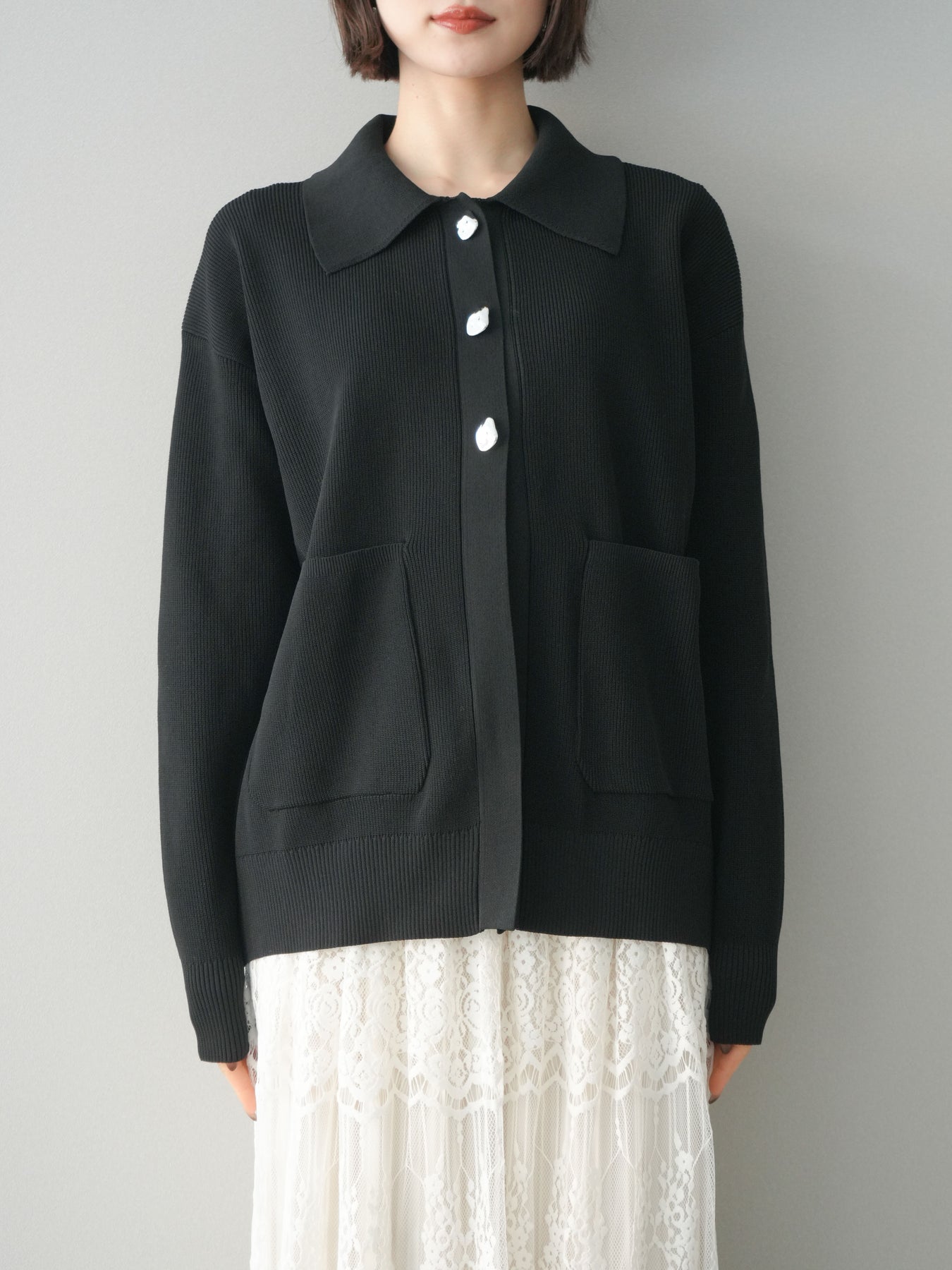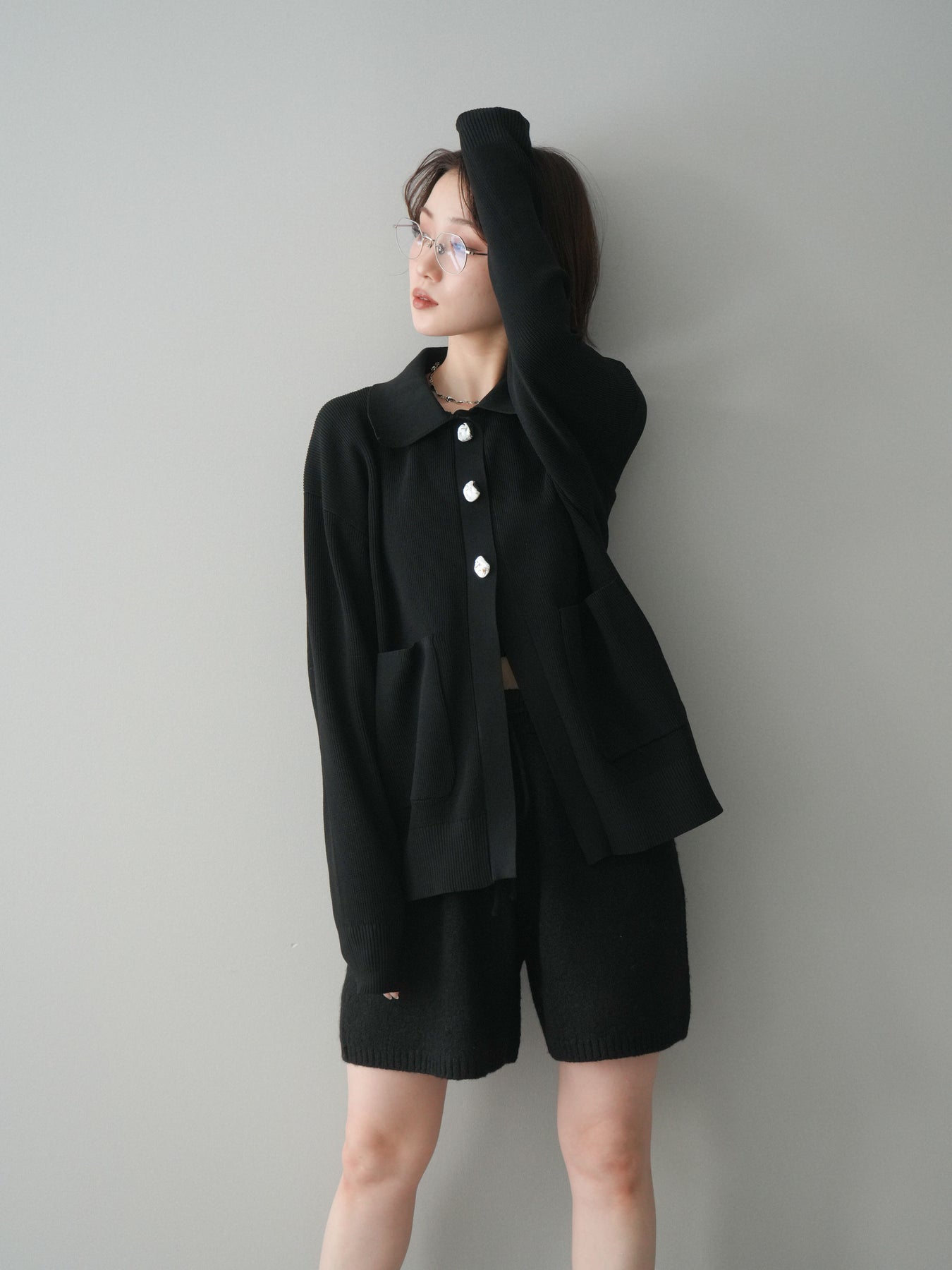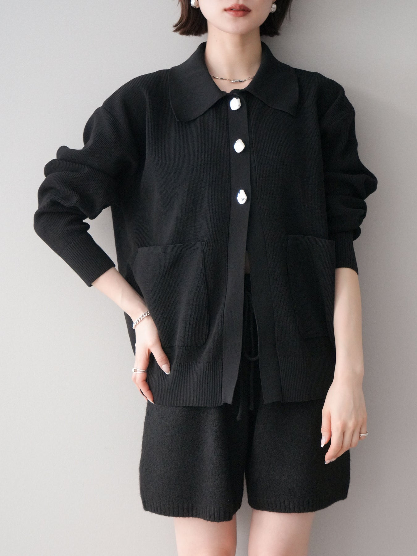 [予約]メタルボタン襟付きポリエステルニットカーディガン/black