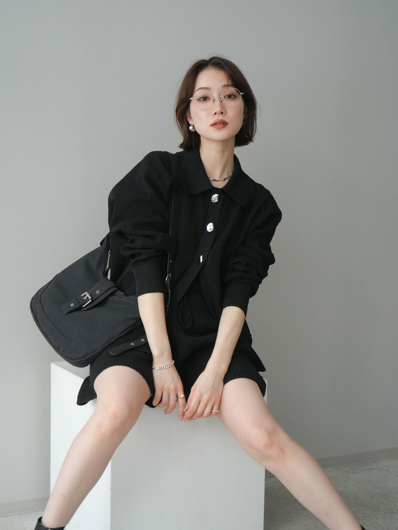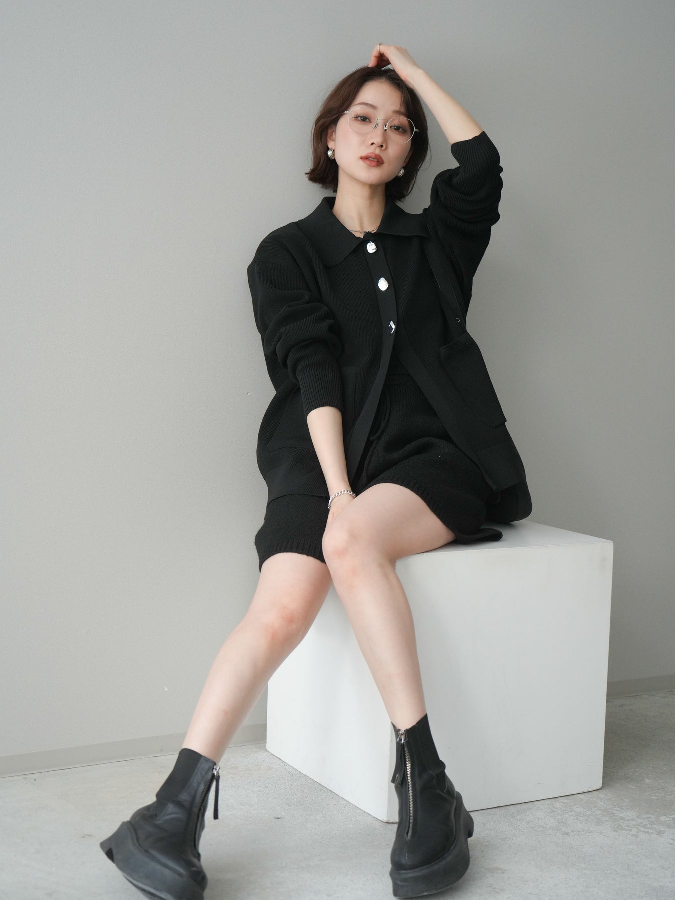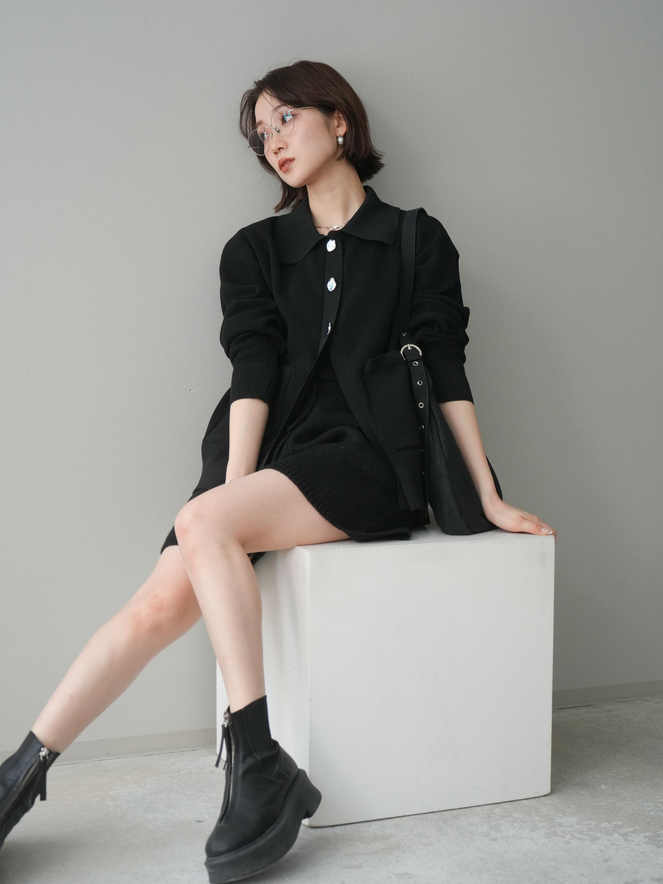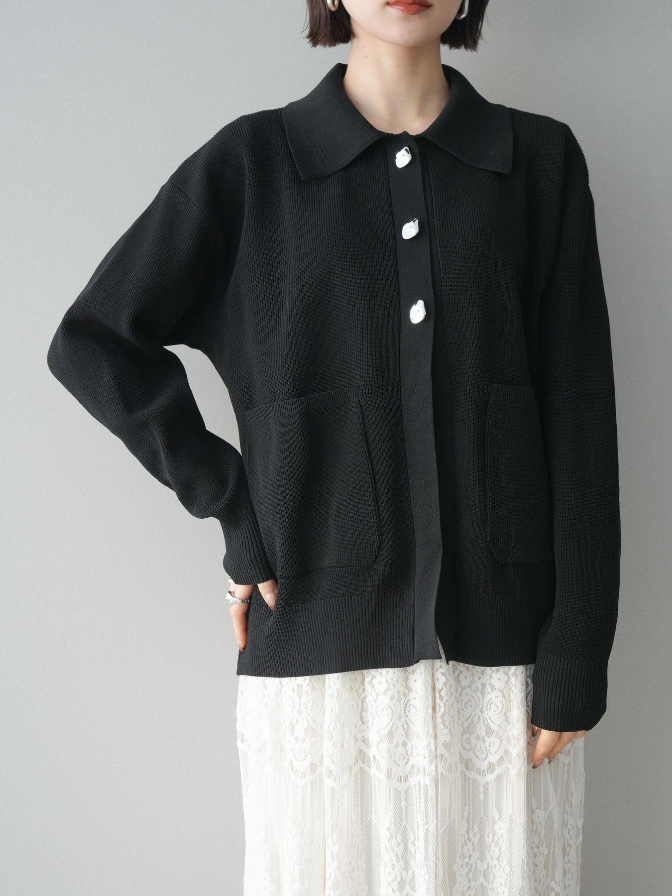 [予約]メタルボタン襟付きポリエステルニットカーディガン/black