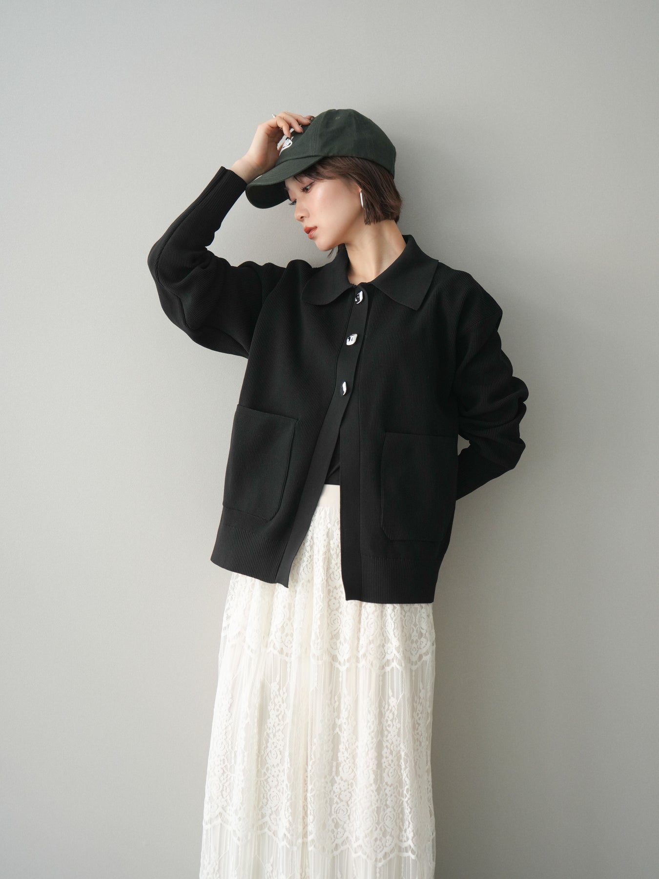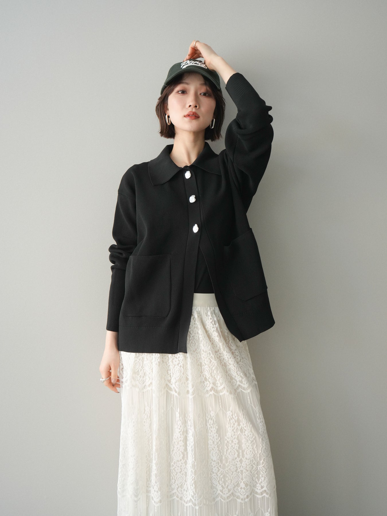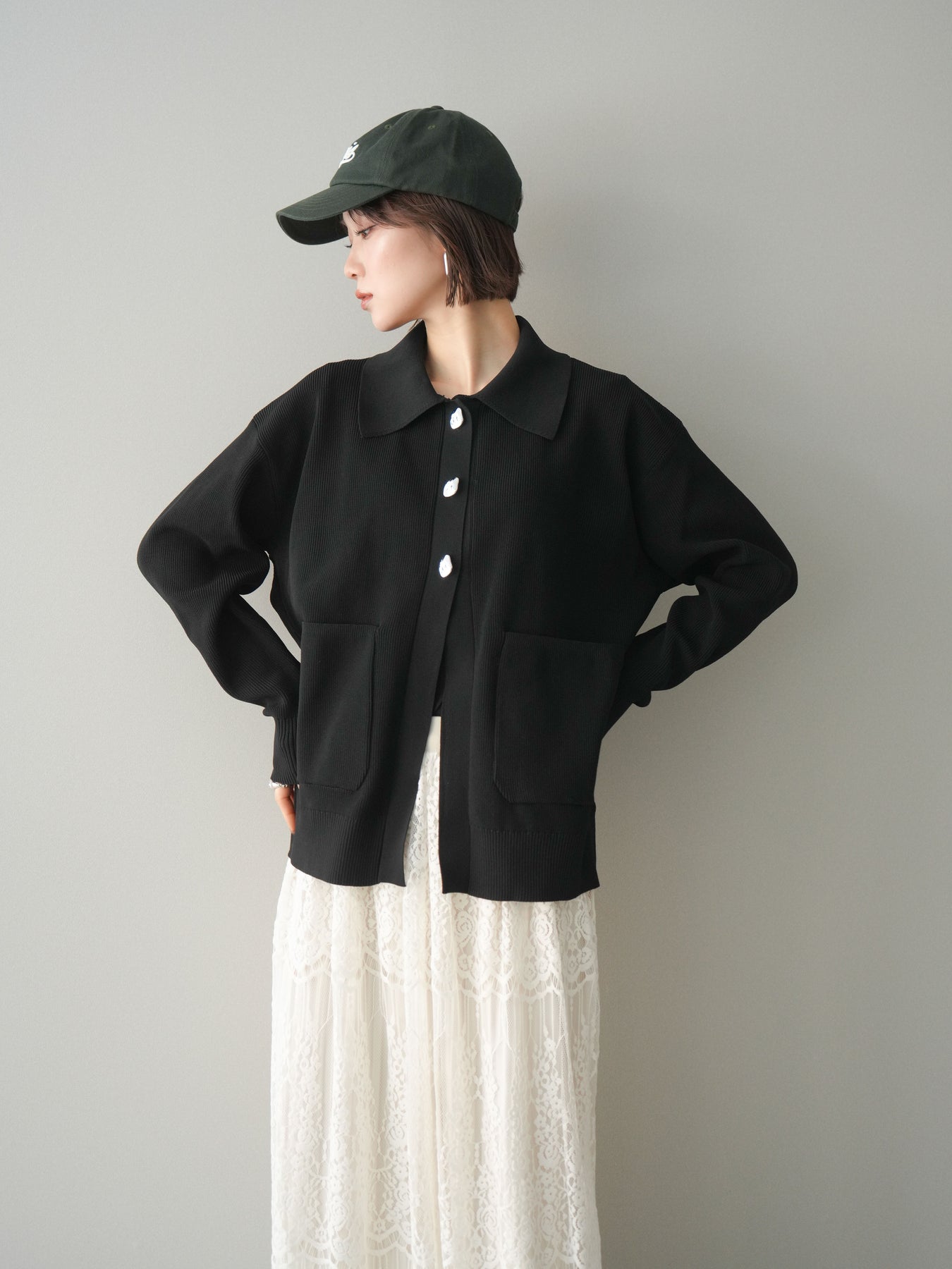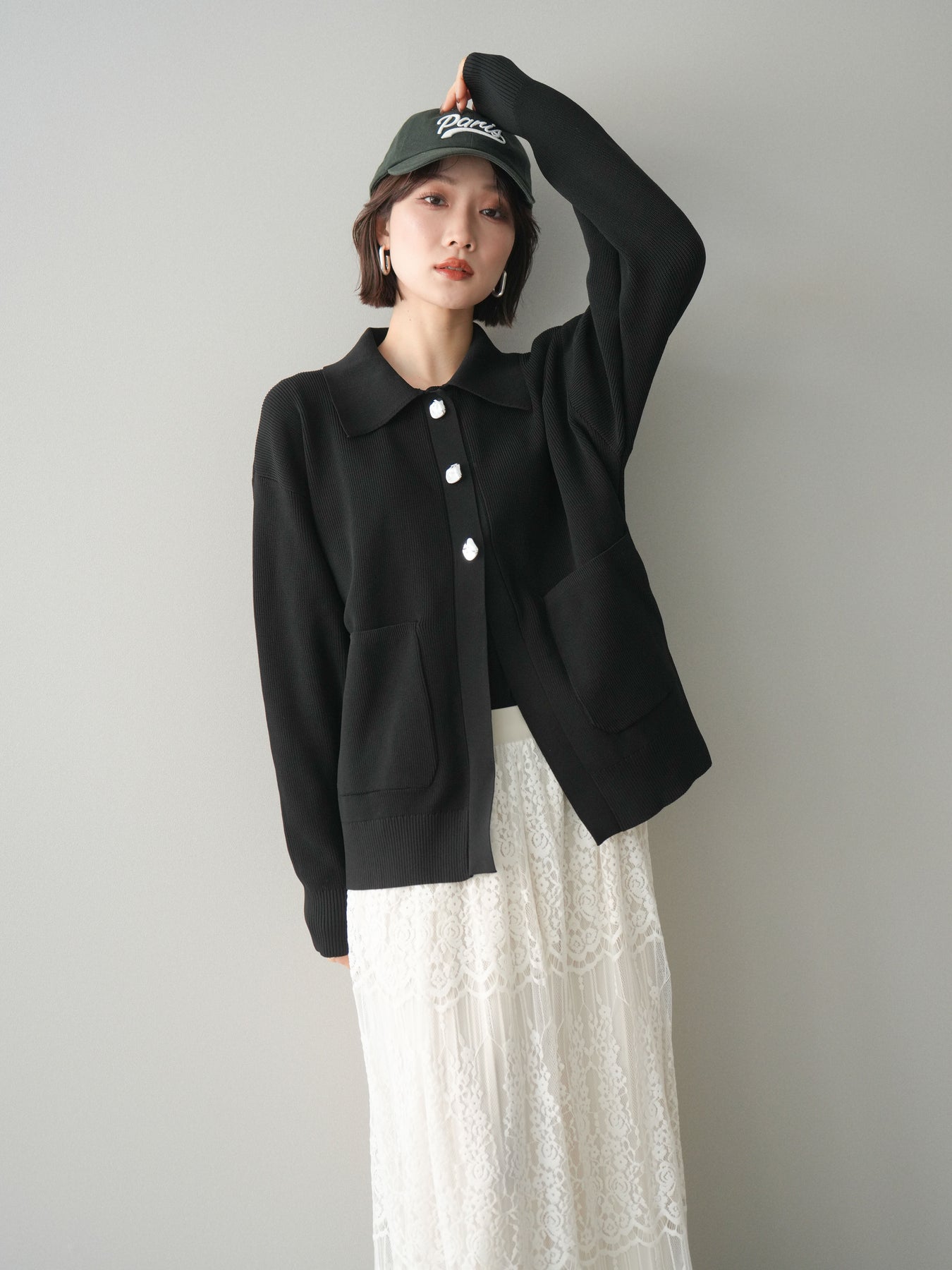 程よい厚みとハリ感のあるポリエステルニット素材を使用した、きちんと感のある襟付きカーディガン。フロントのメタルボタンがさりげないアクセントになり、シンプルながらも存在感のある一枚です。ゆとりのあるシルエットで羽織りやすく、トップスとしてもカーディガンとしても着回しが可能。オンオフ問わずスタイリングに取り入れやすいアイテムです。 ※ボトムス、キャミソール(インナー)以外の商品は一律でインナーは付属していません