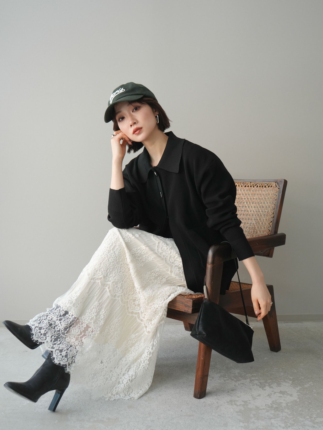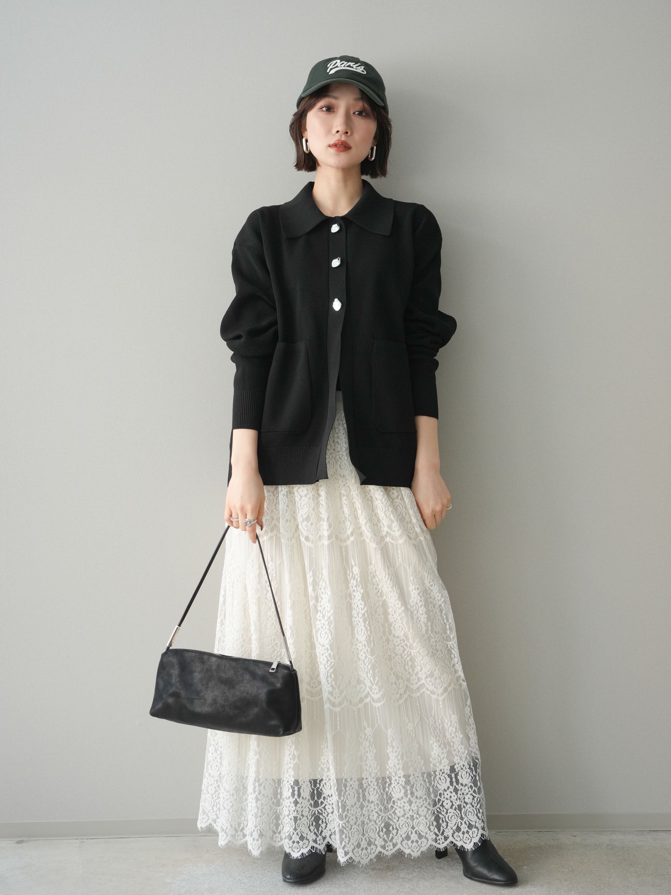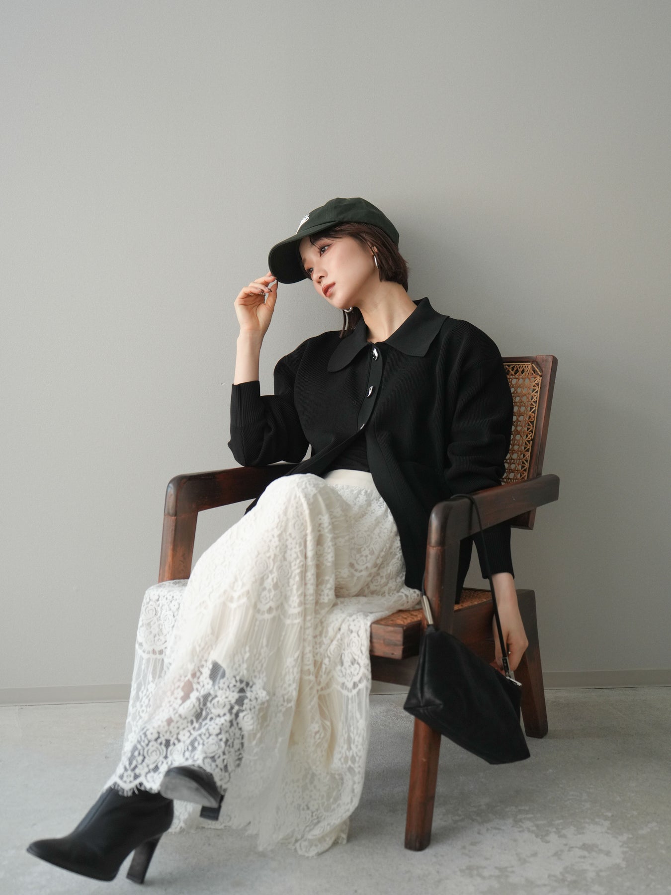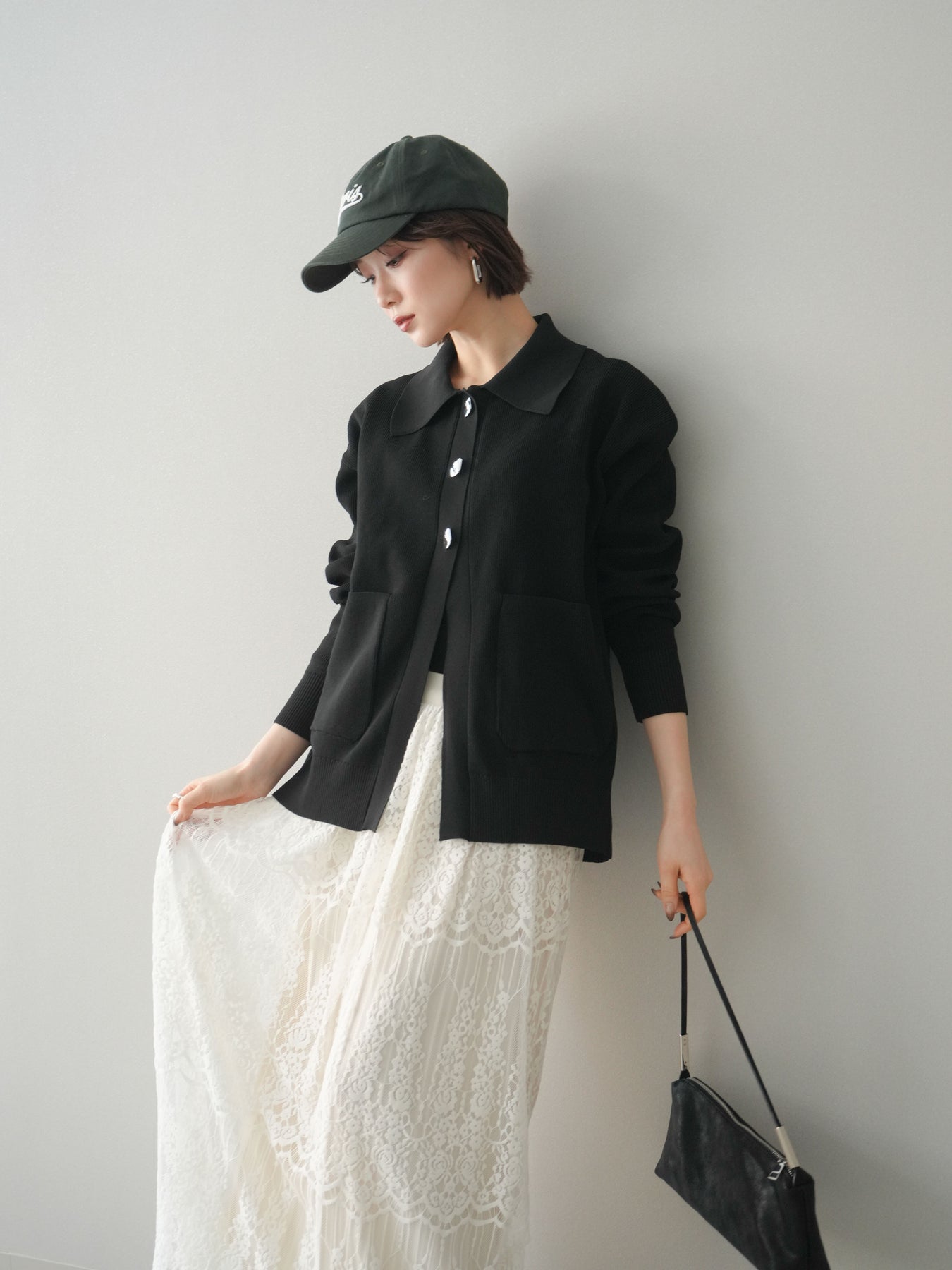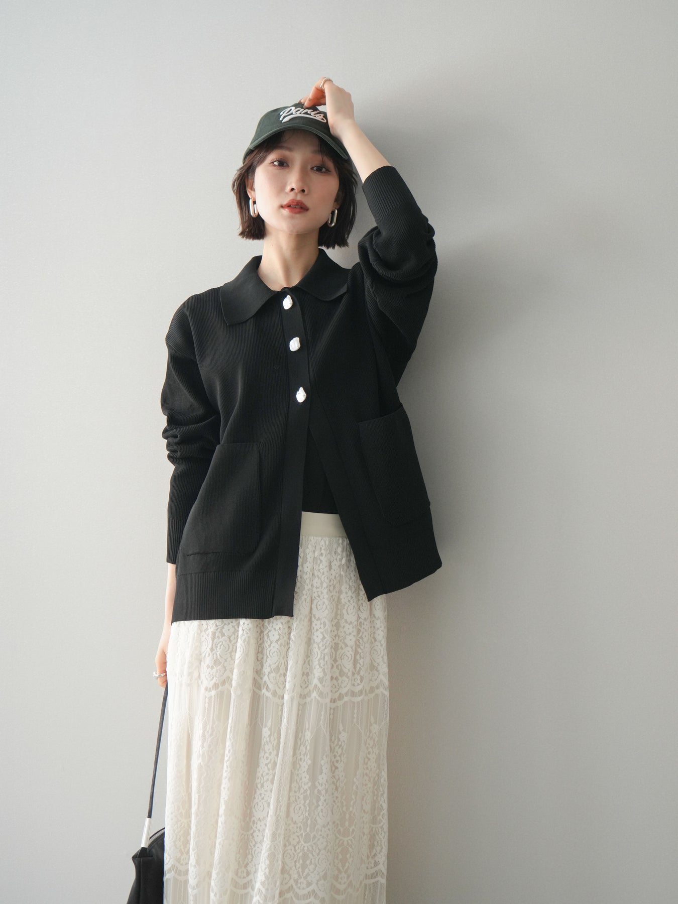 程よい厚みとハリ感のあるポリエステルニット素材を使用した、きちんと感のある襟付きカーディガン。フロントのメタルボタンがさりげないアクセントになり、シンプルながらも存在感のある一枚です。ゆとりのあるシルエットで羽織りやすく、トップスとしてもカーディガンとしても着回しが可能。オンオフ問わずスタイリングに取り入れやすいアイテムです。 ※ボトムス、キャミソール(インナー)以外の商品は一律でインナーは付属していません