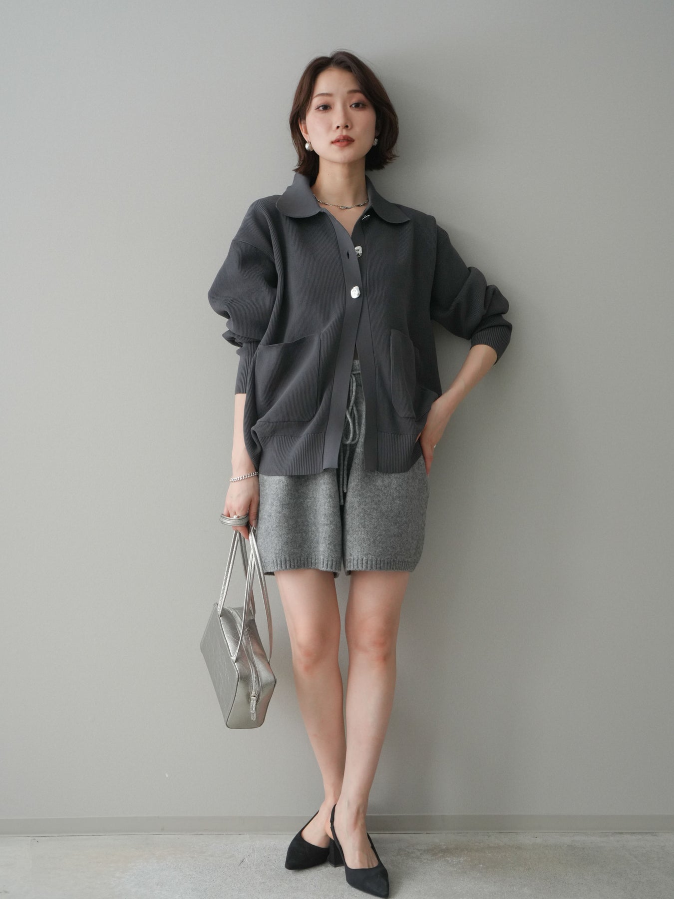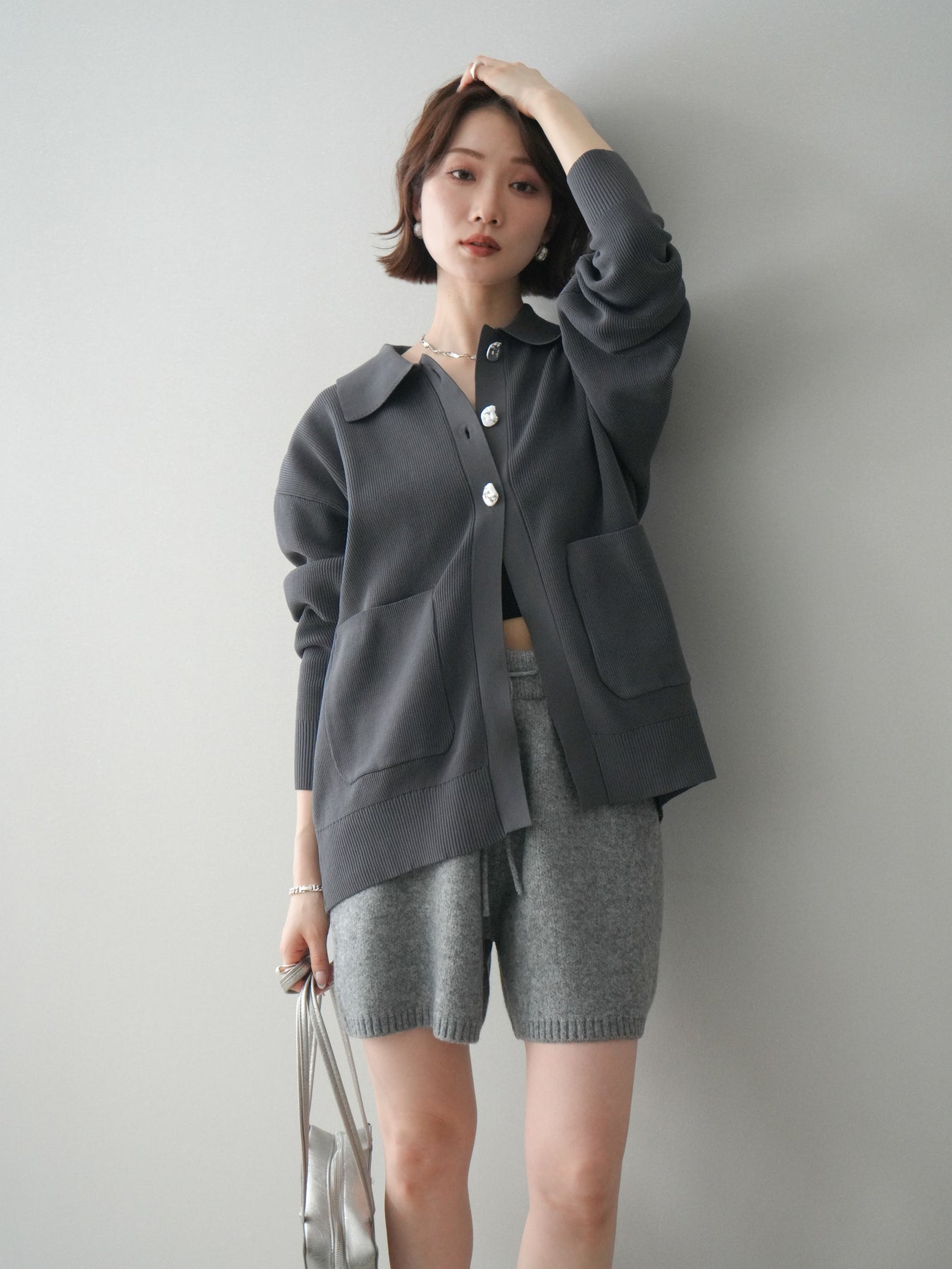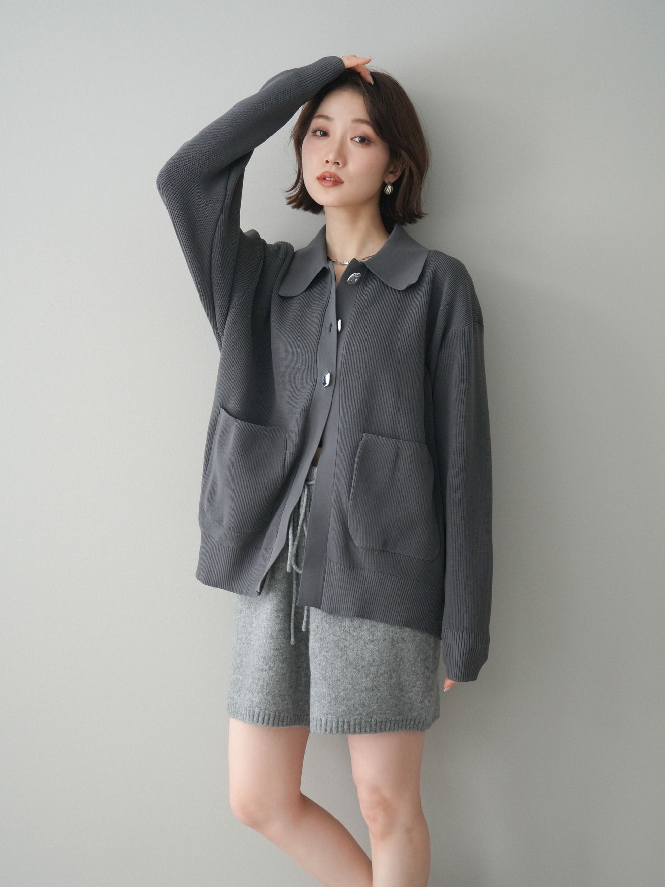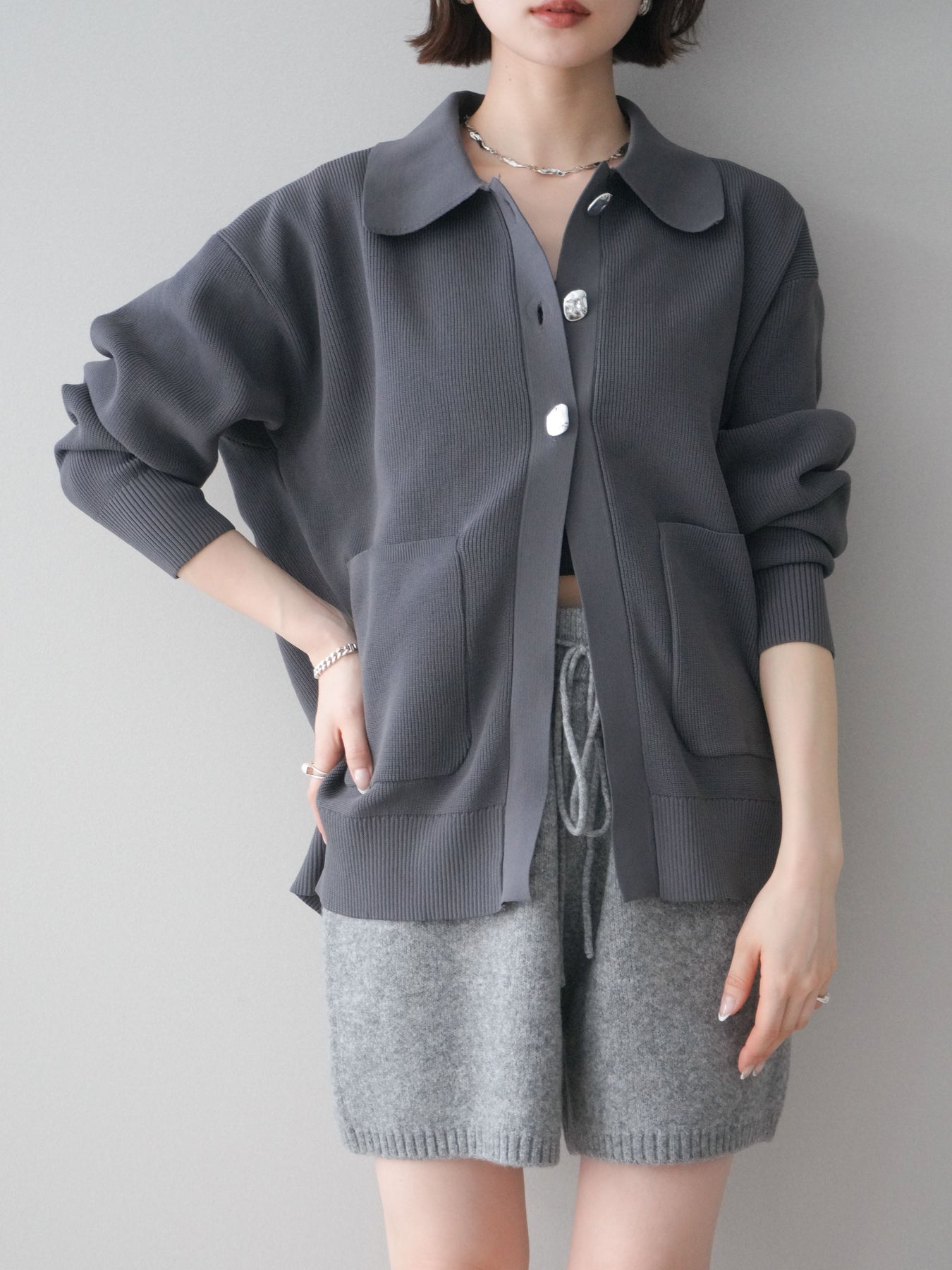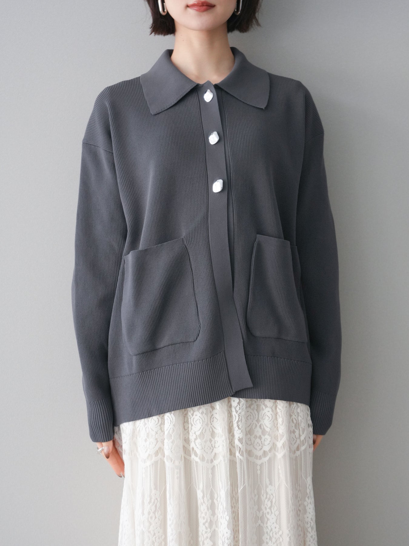 [予約]メタルボタン襟付きポリエステルニットカーディガン/charcoal