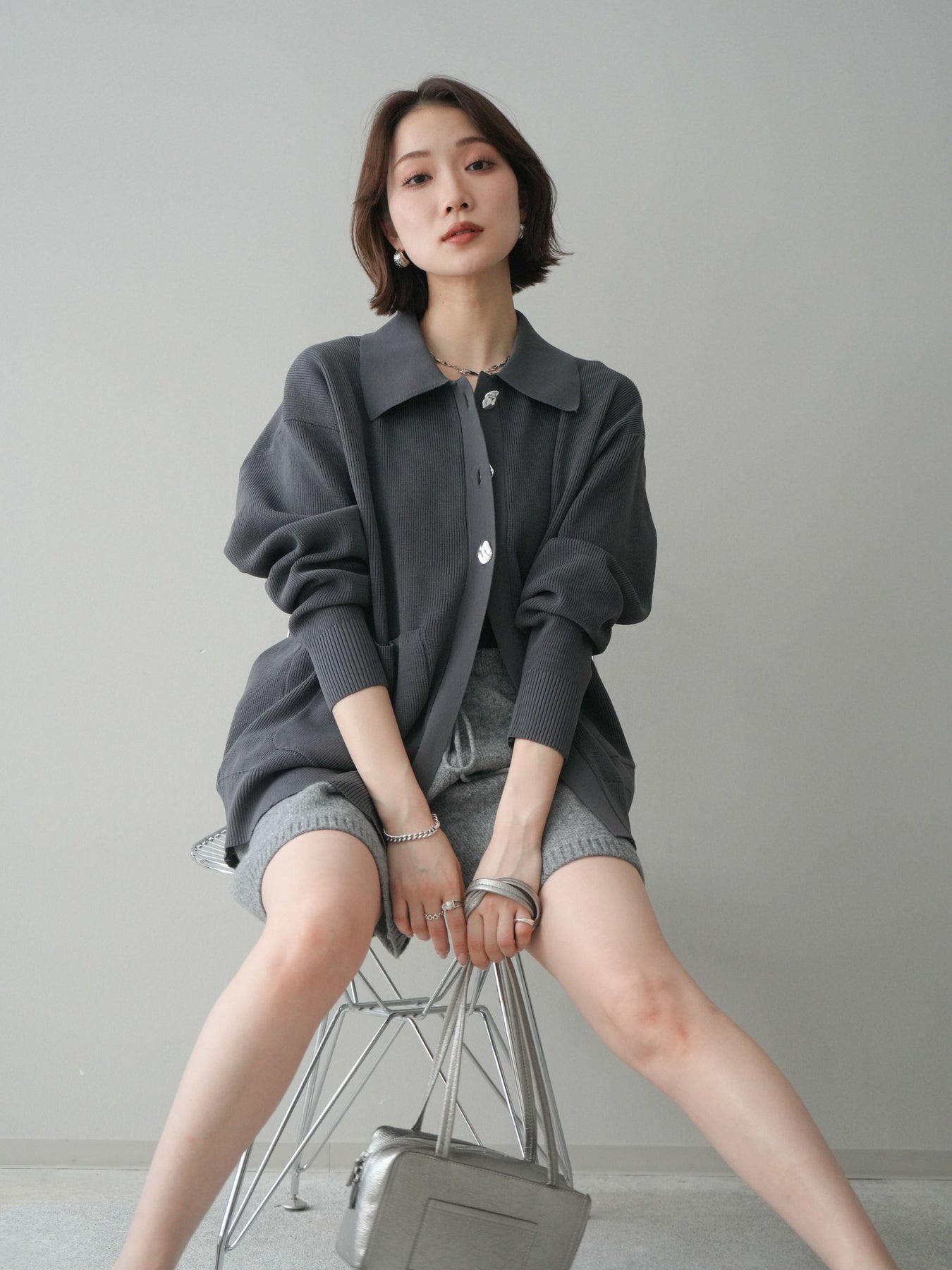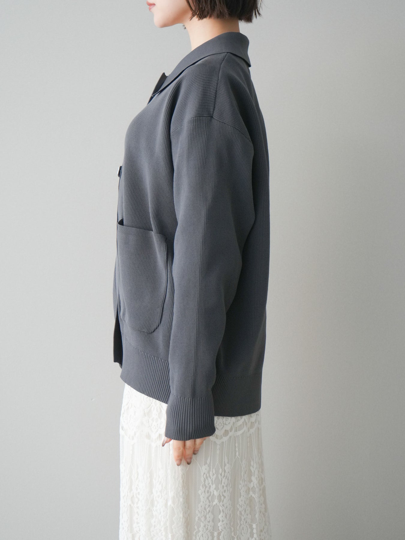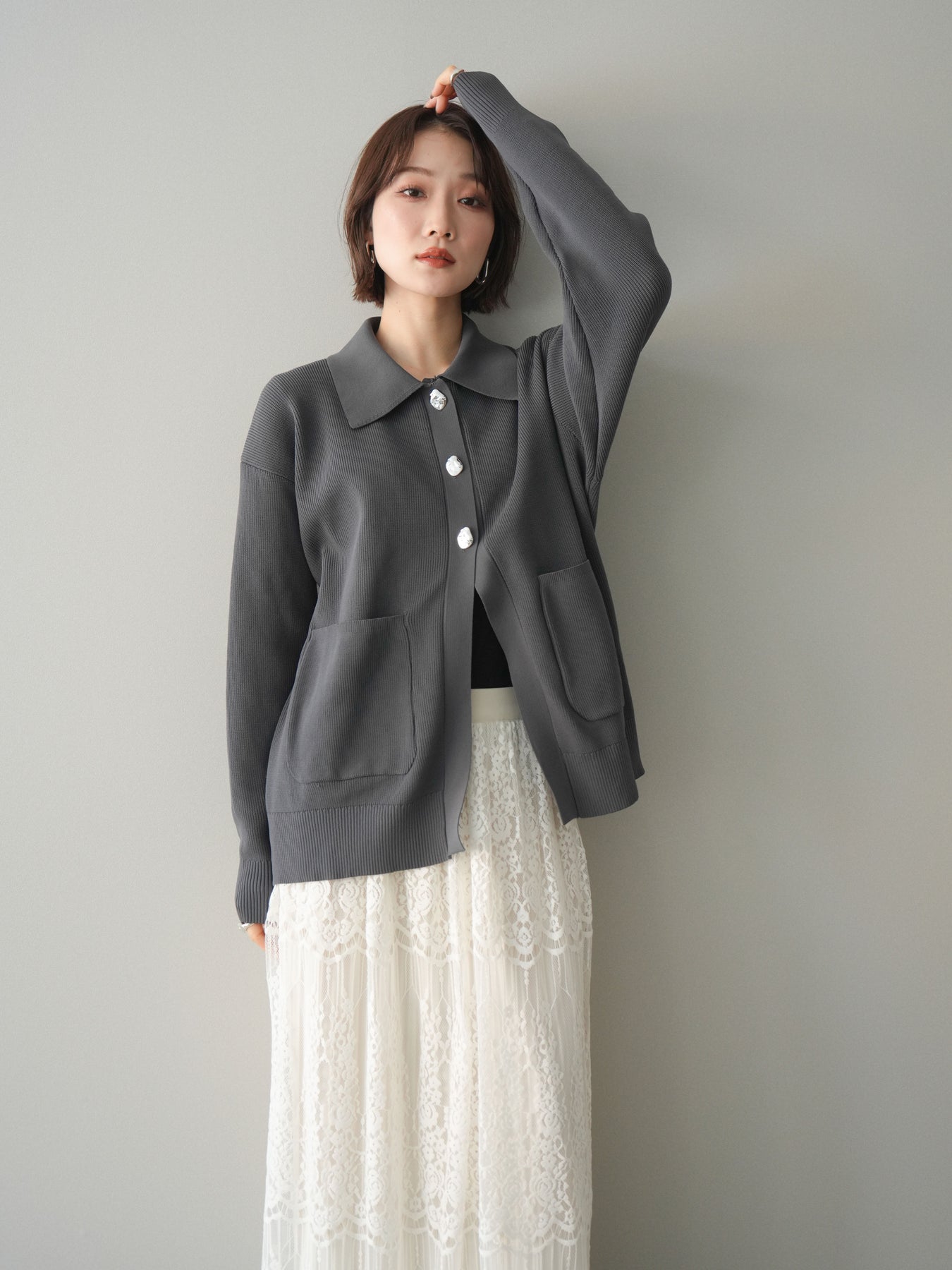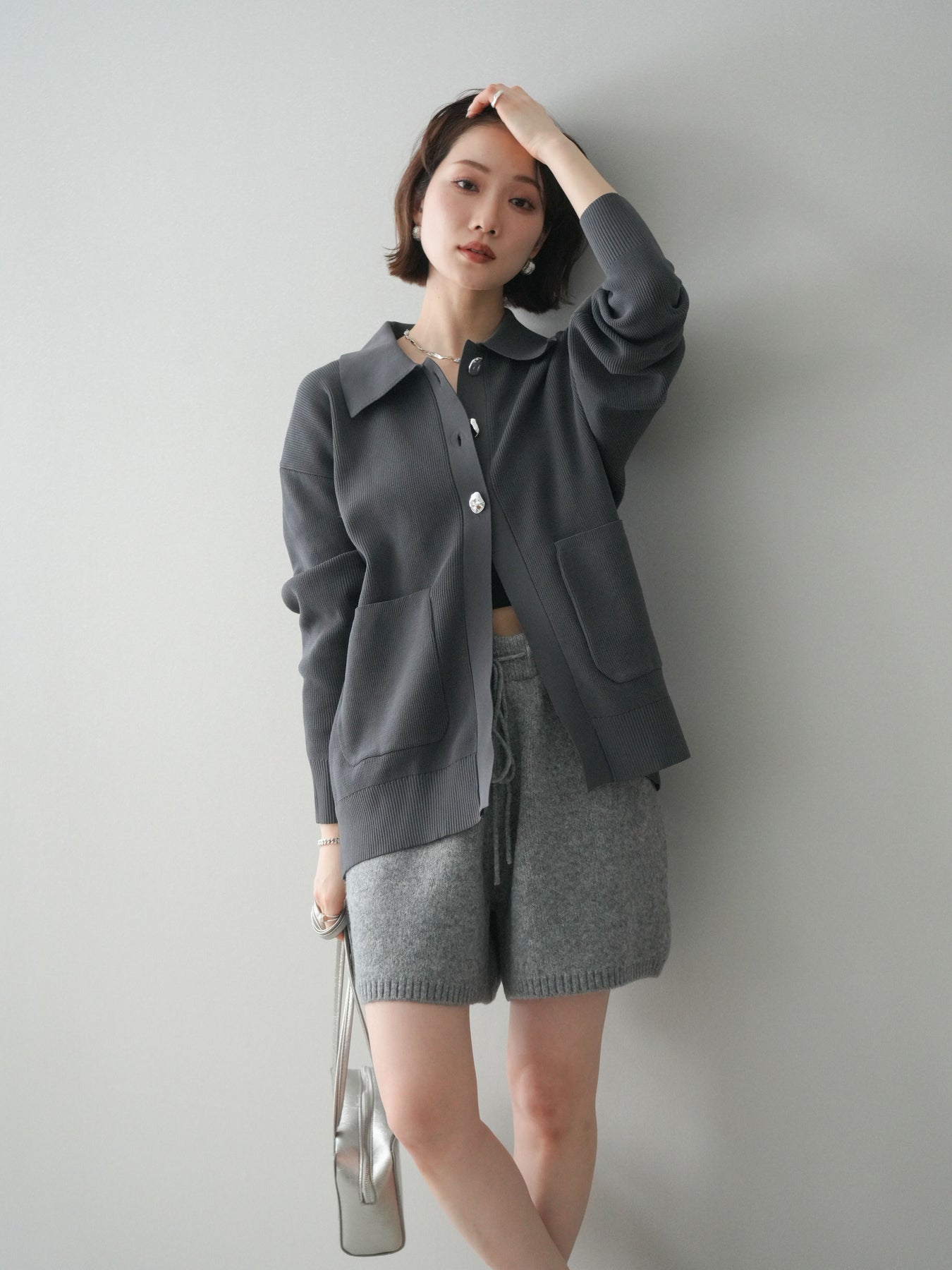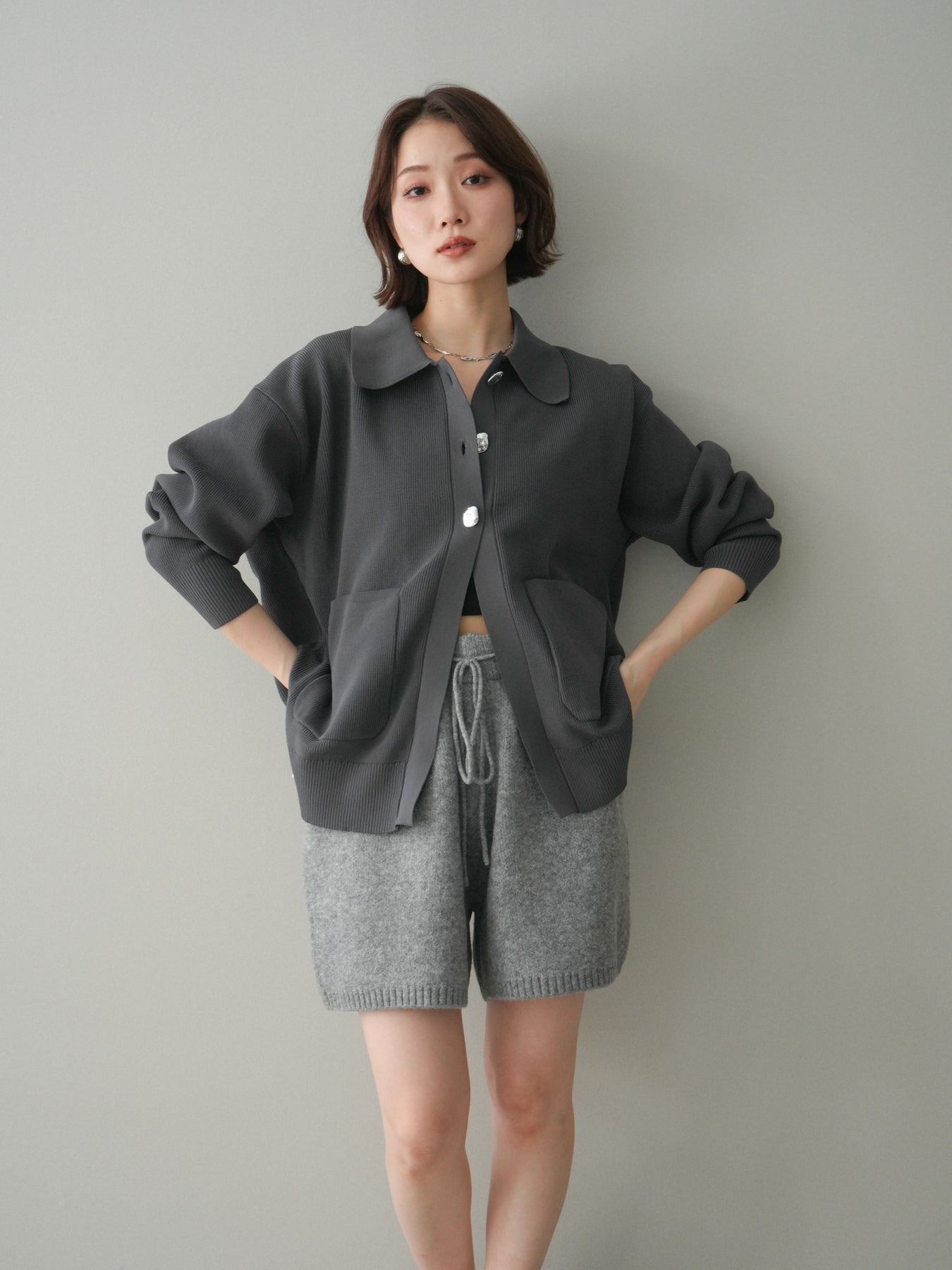 [予約]メタルボタン襟付きポリエステルニットカーディガン/charcoal