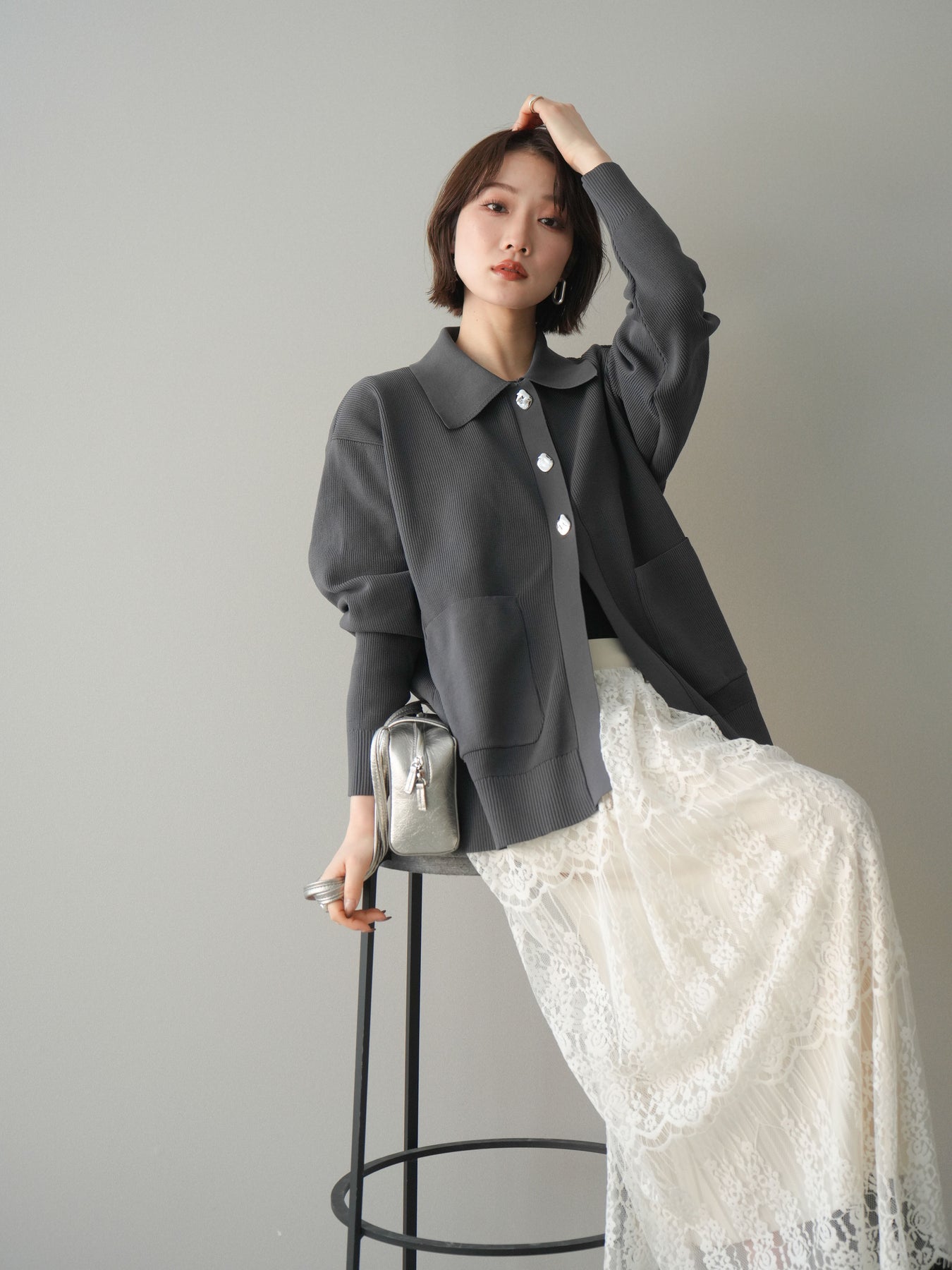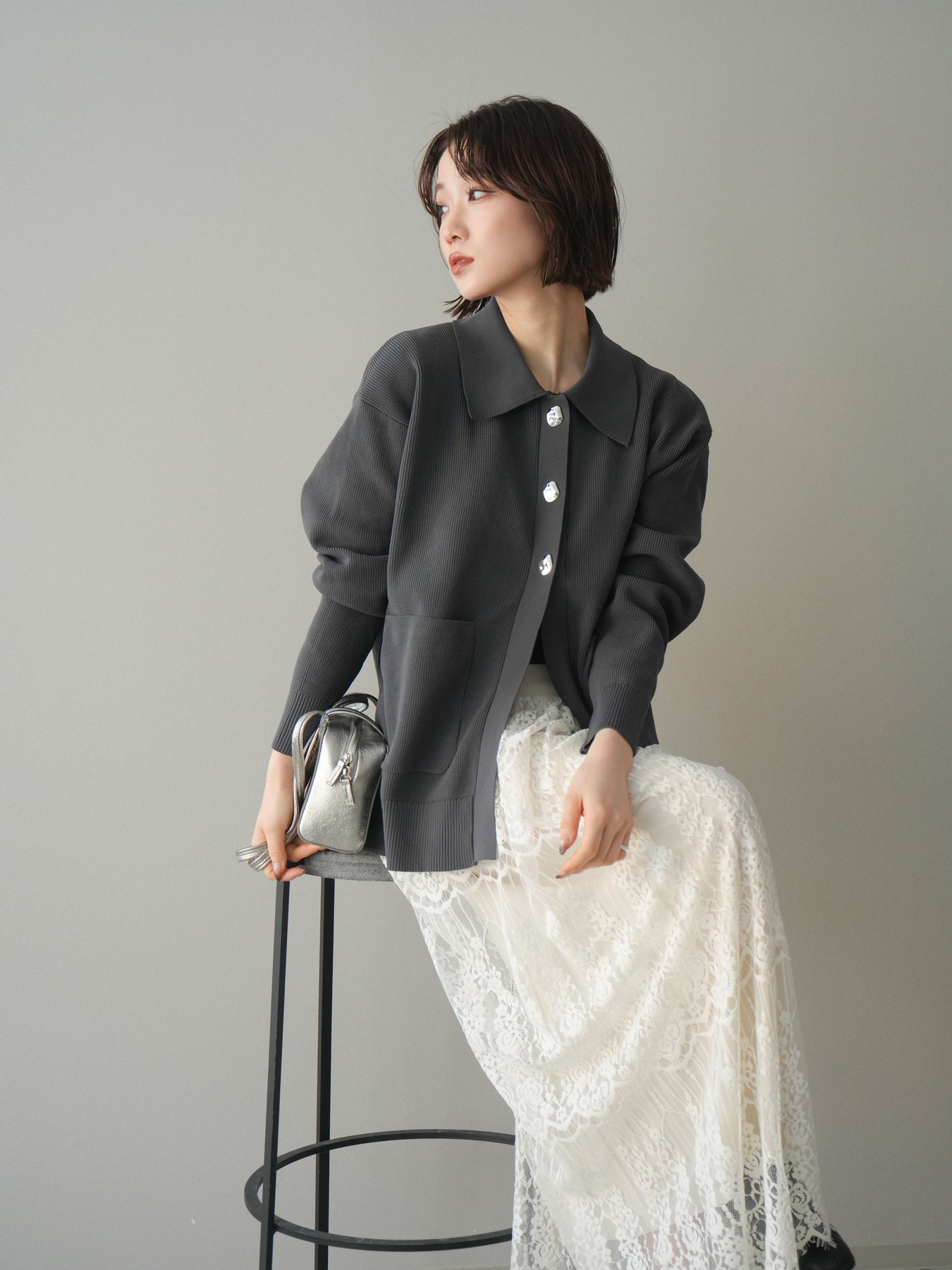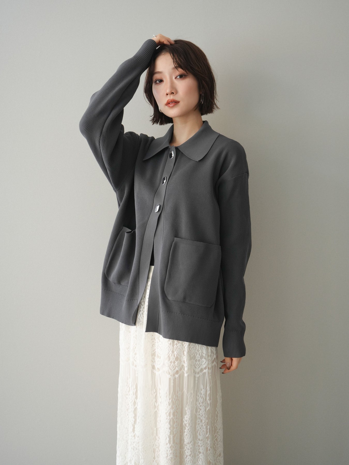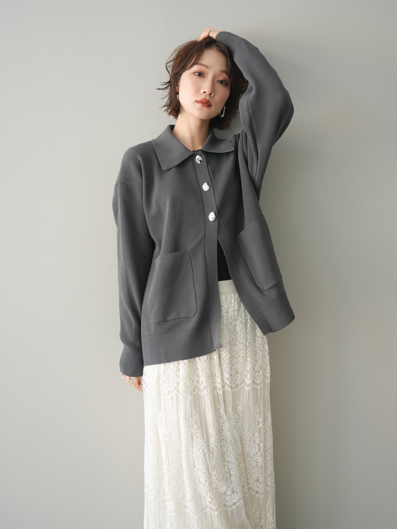 [予約]メタルボタン襟付きポリエステルニットカーディガン/charcoal