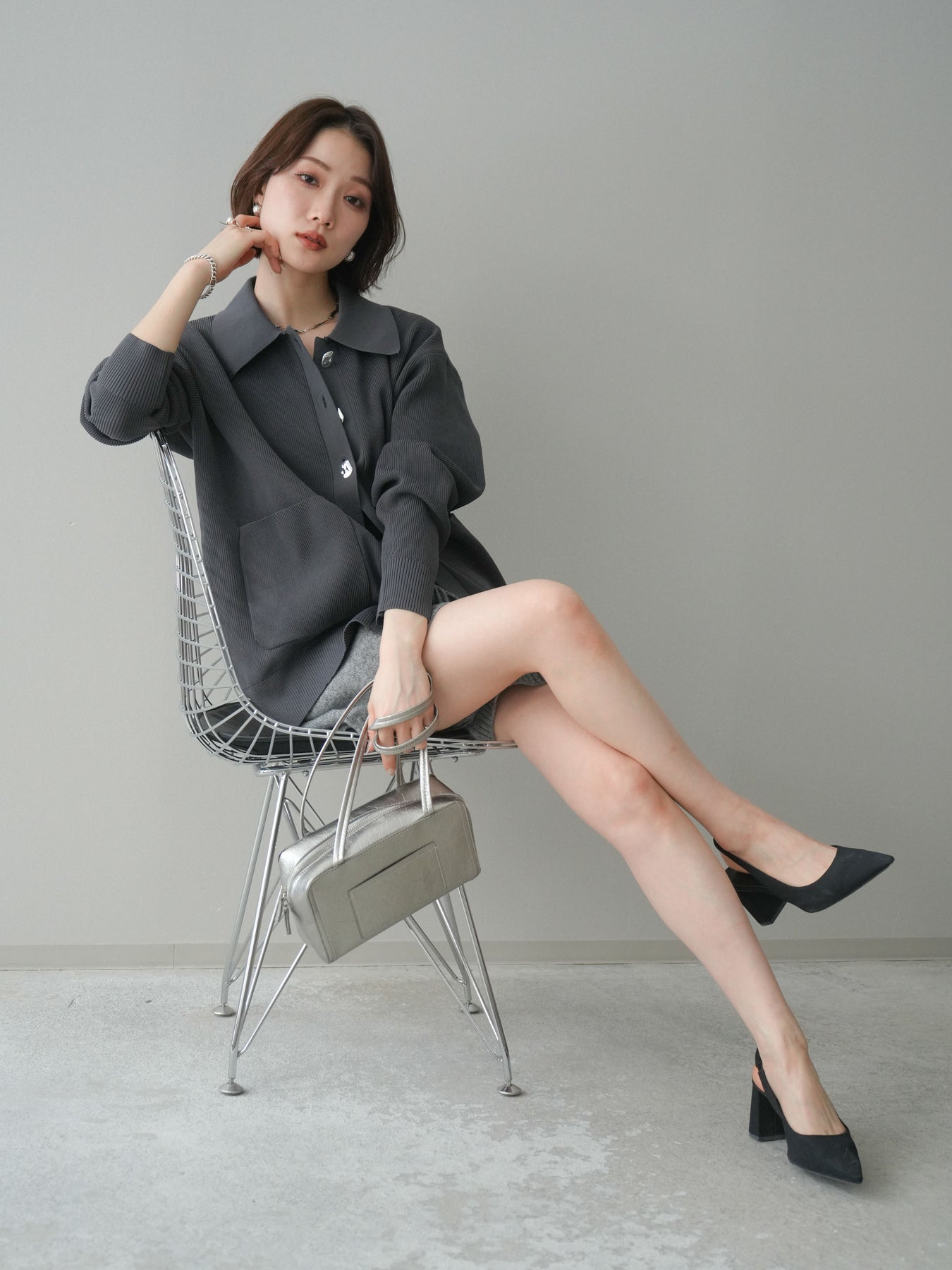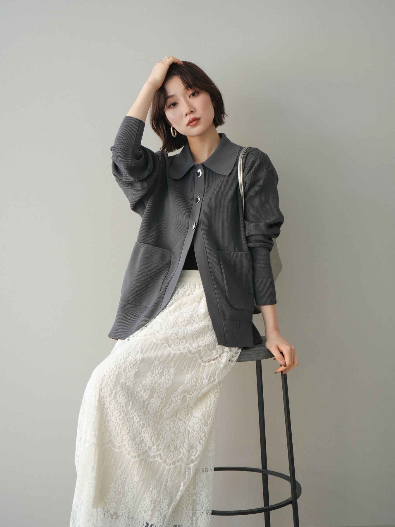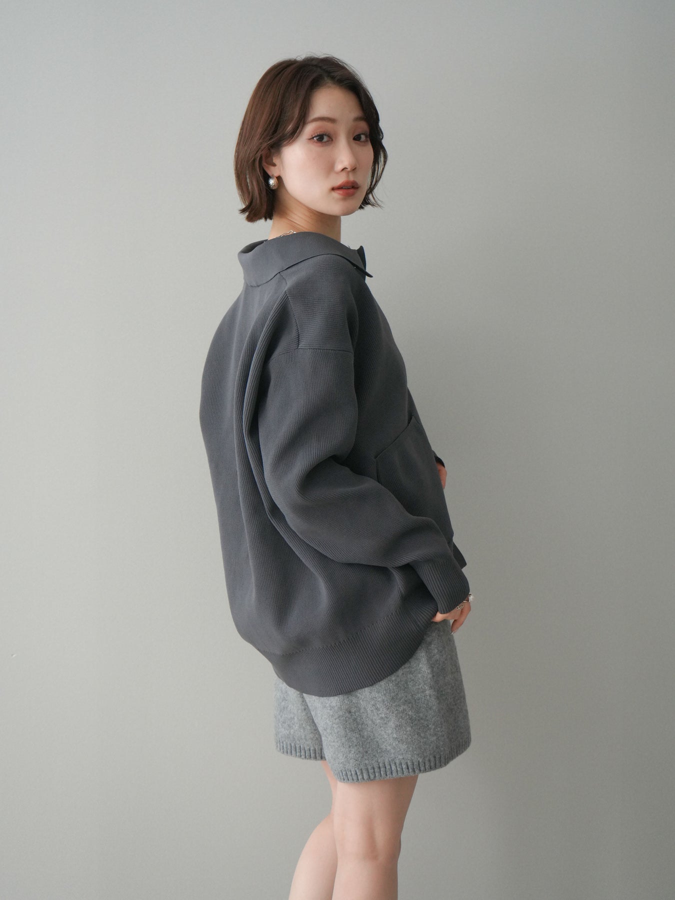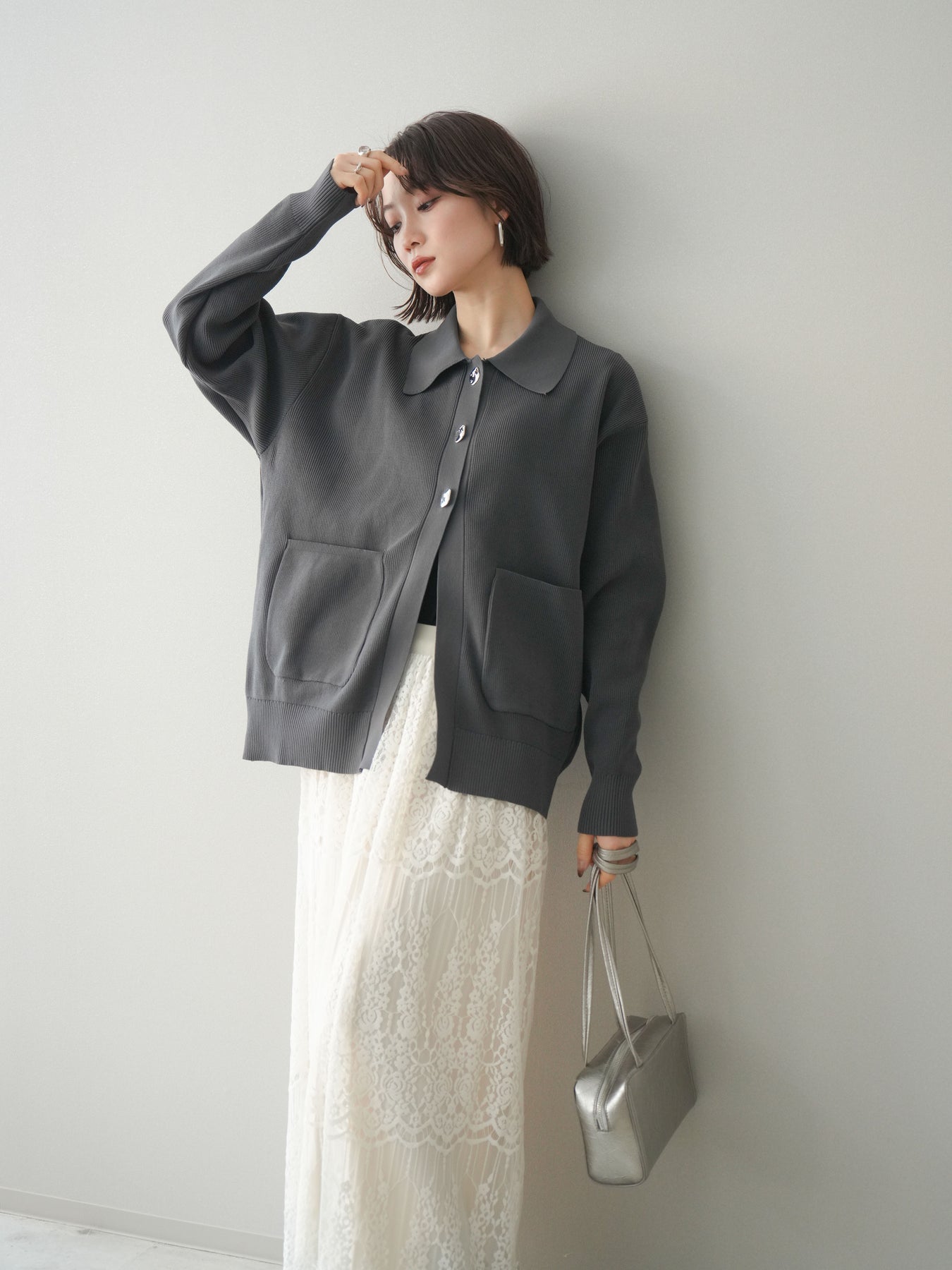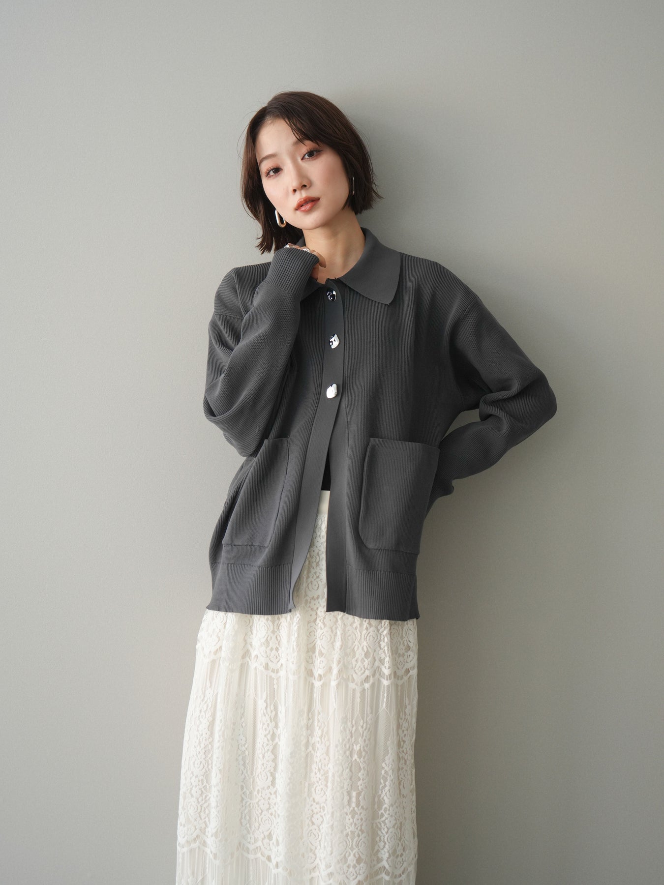 [予約]メタルボタン襟付きポリエステルニットカーディガン/charcoal