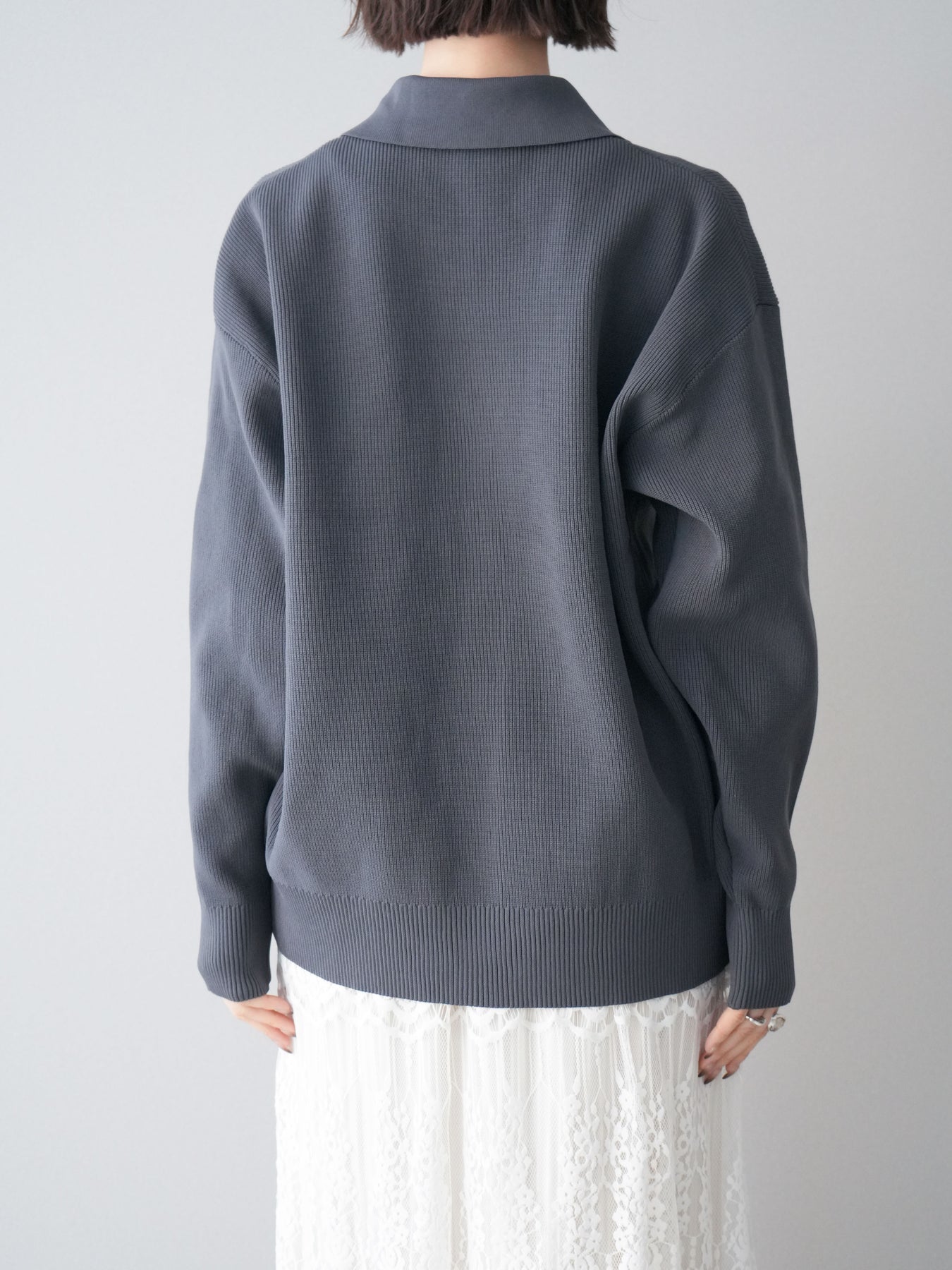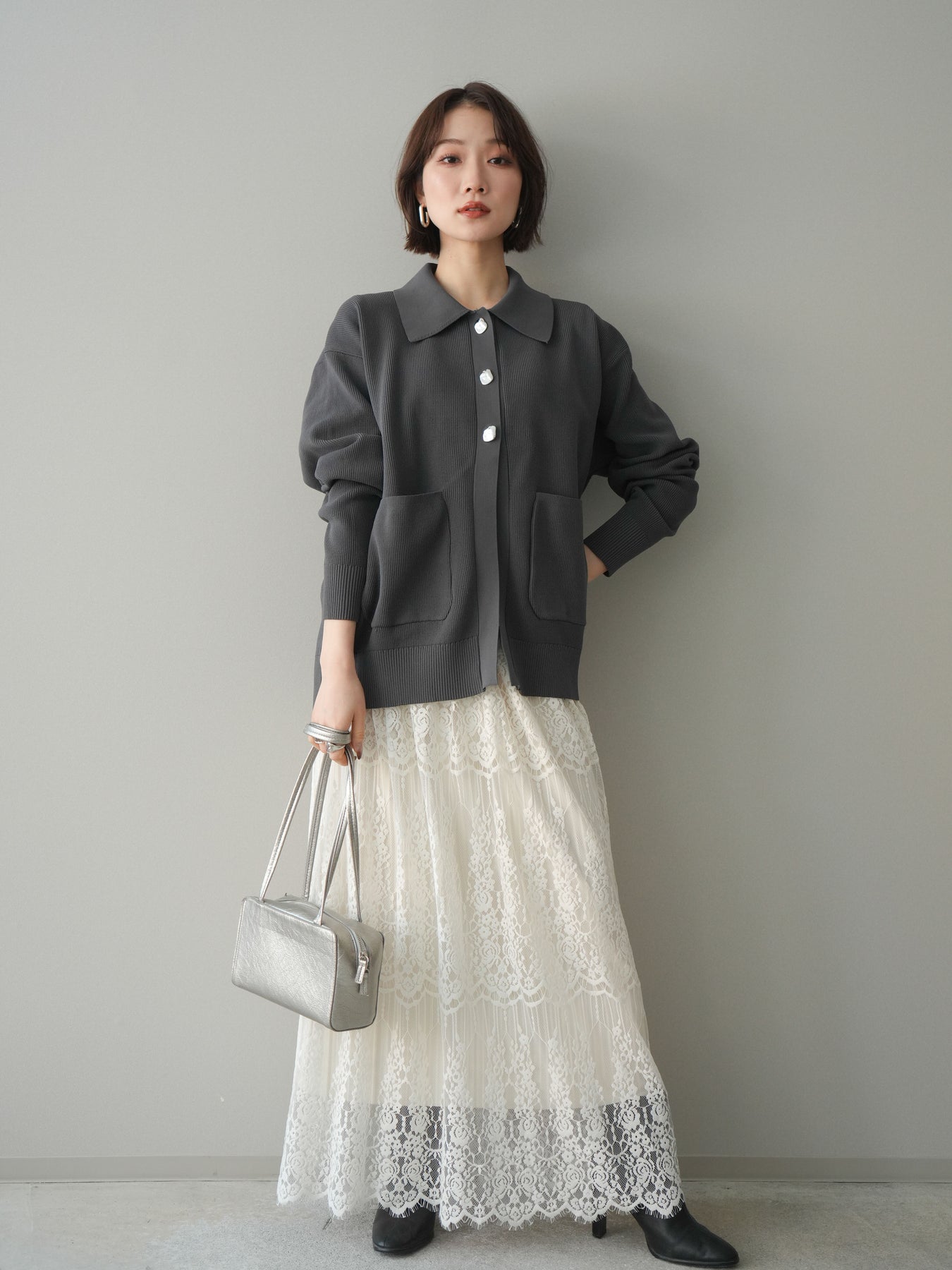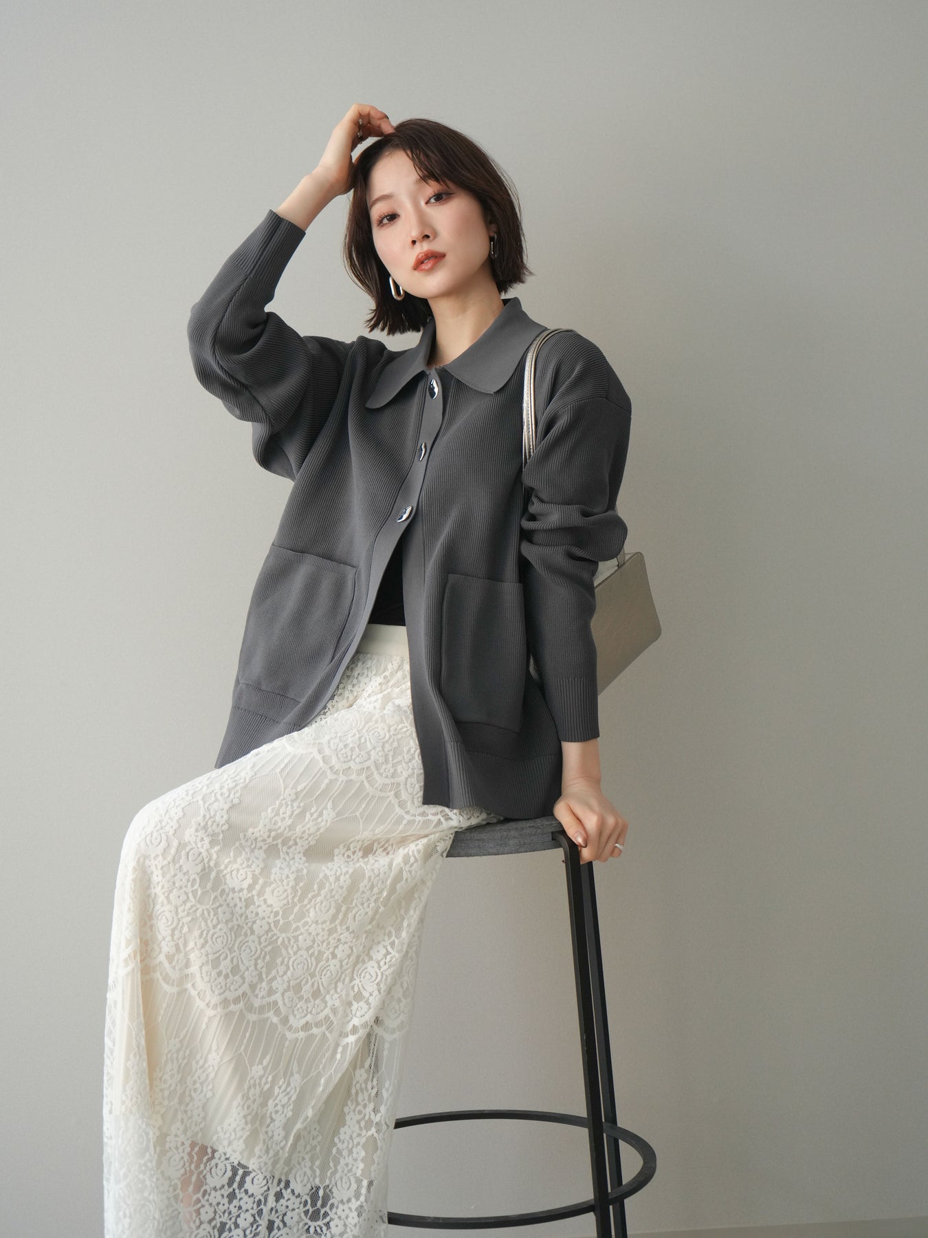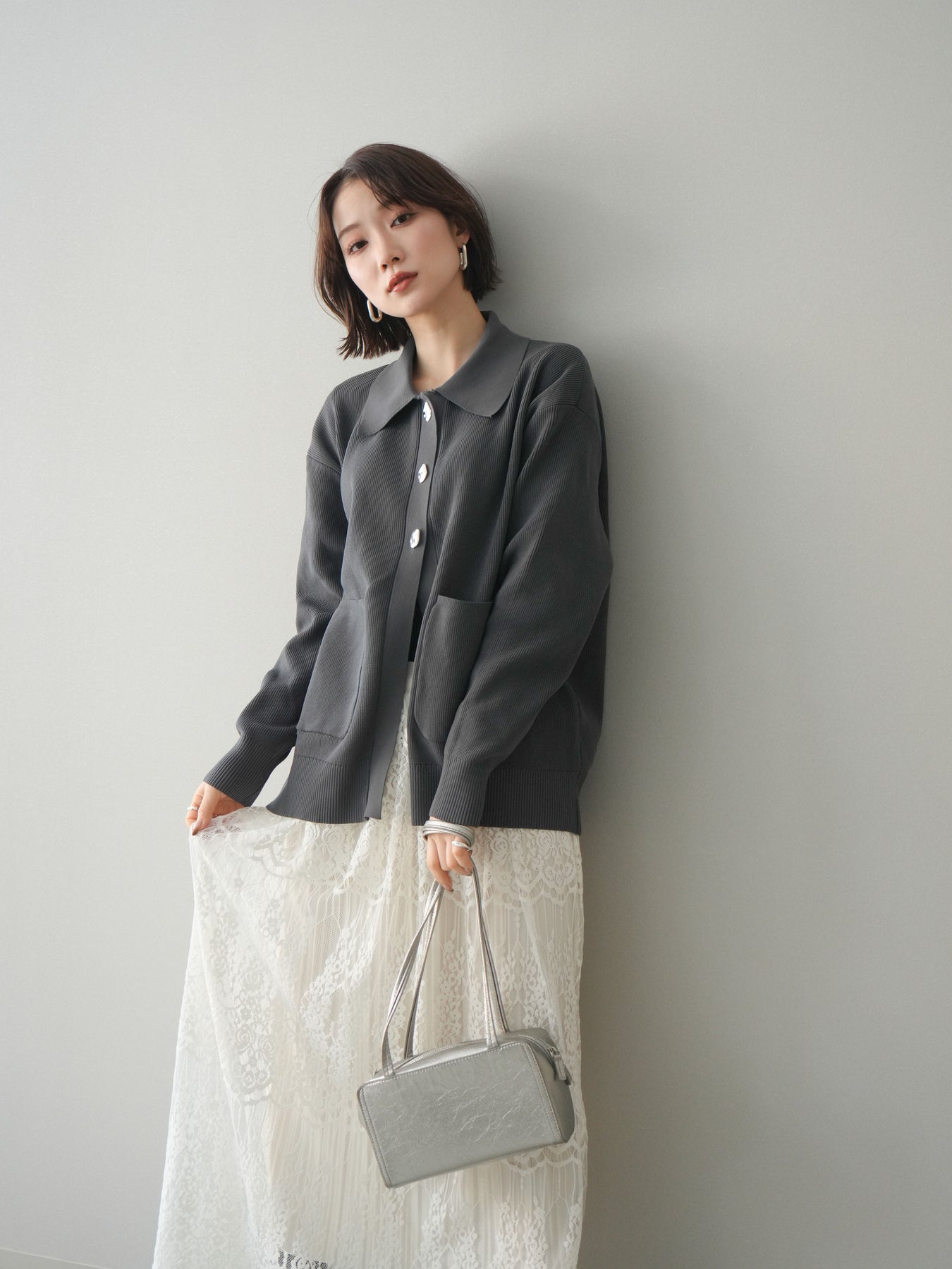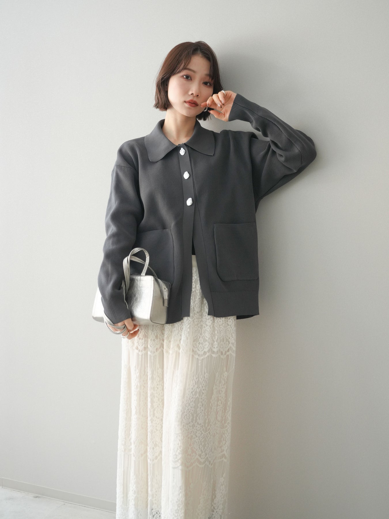 [予約]メタルボタン襟付きポリエステルニットカーディガン/charcoal