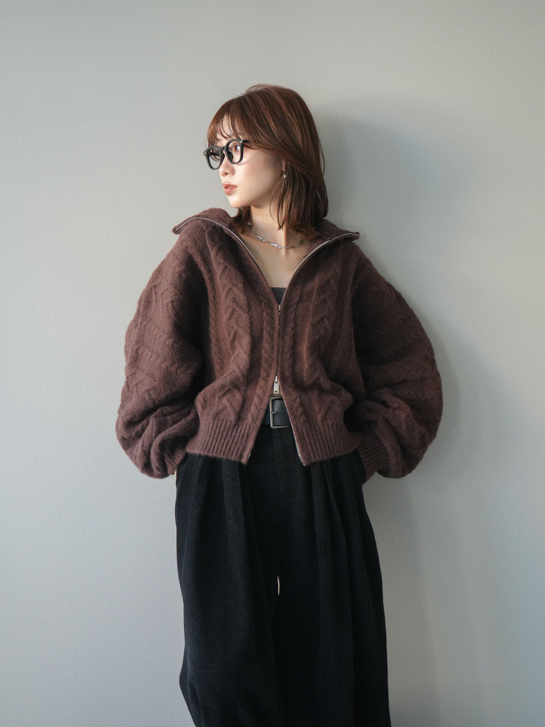 [予約]ケーブル編みハイネックZIPニットカーディガン/brown