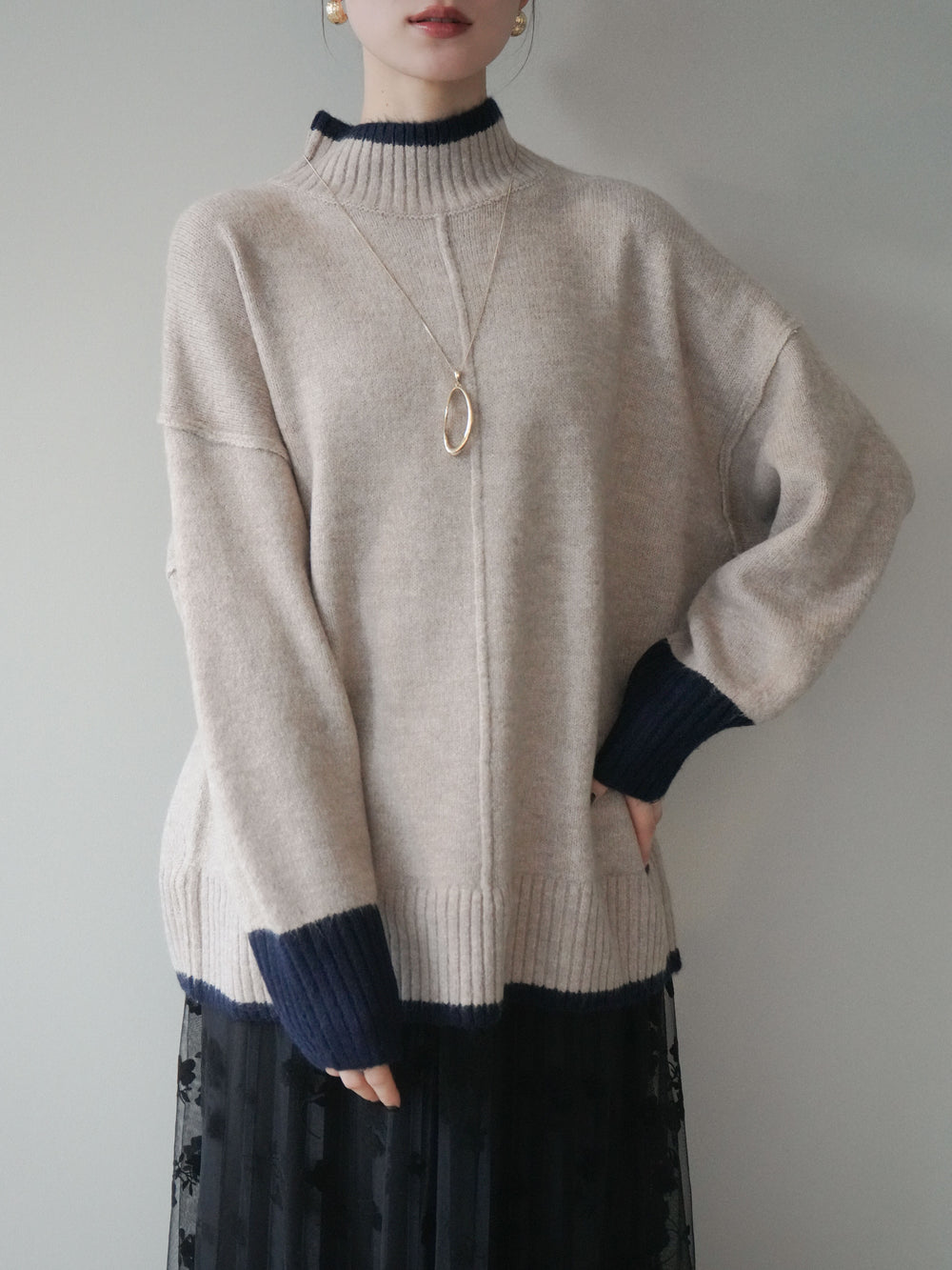 [予約]配色ハイネックニットプルオーバー/beigenavy