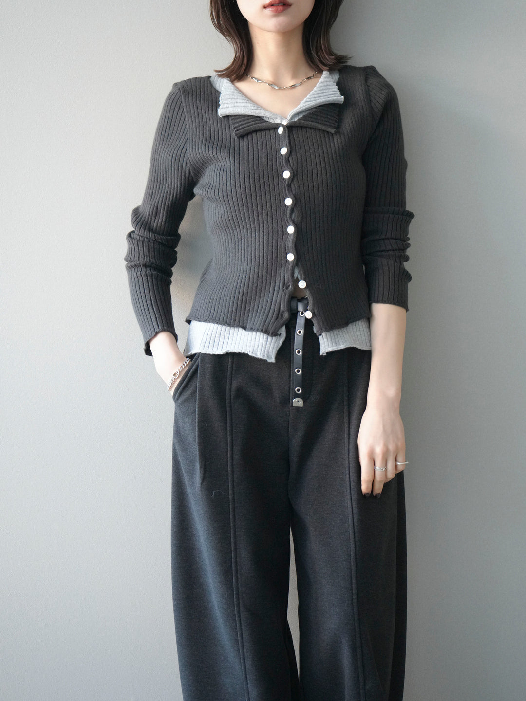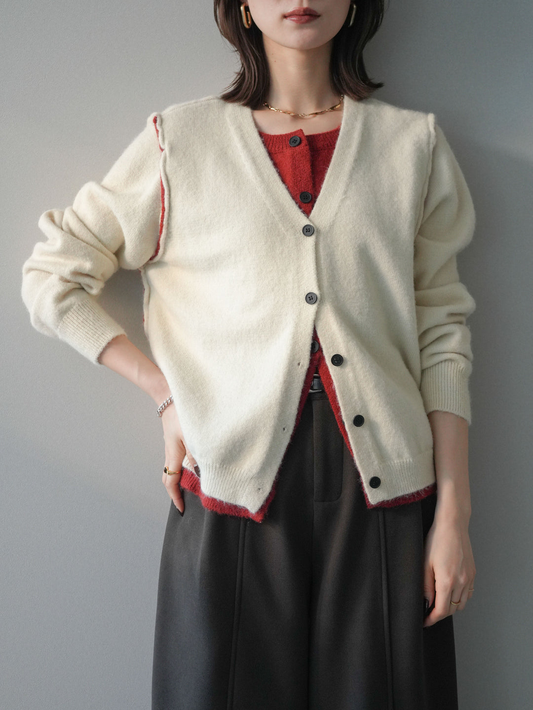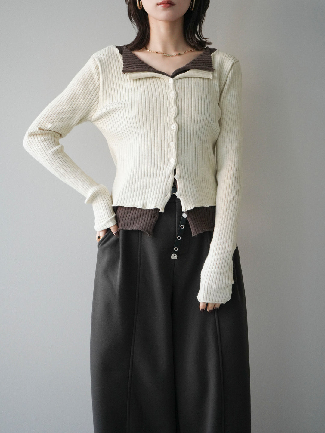 [予約]配色レイヤードリブニットカーディガン/charcoal