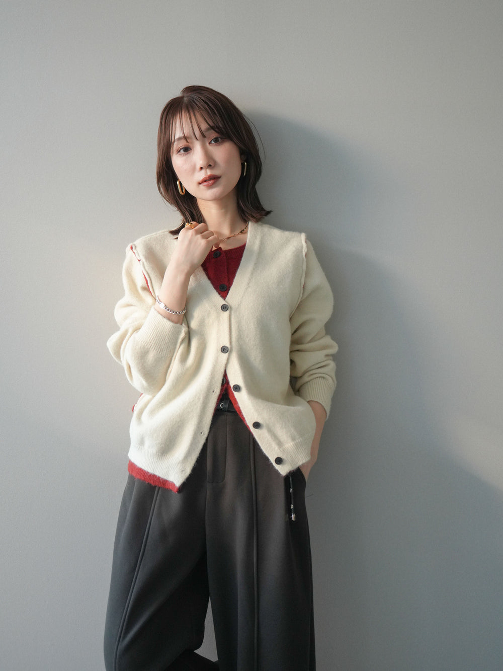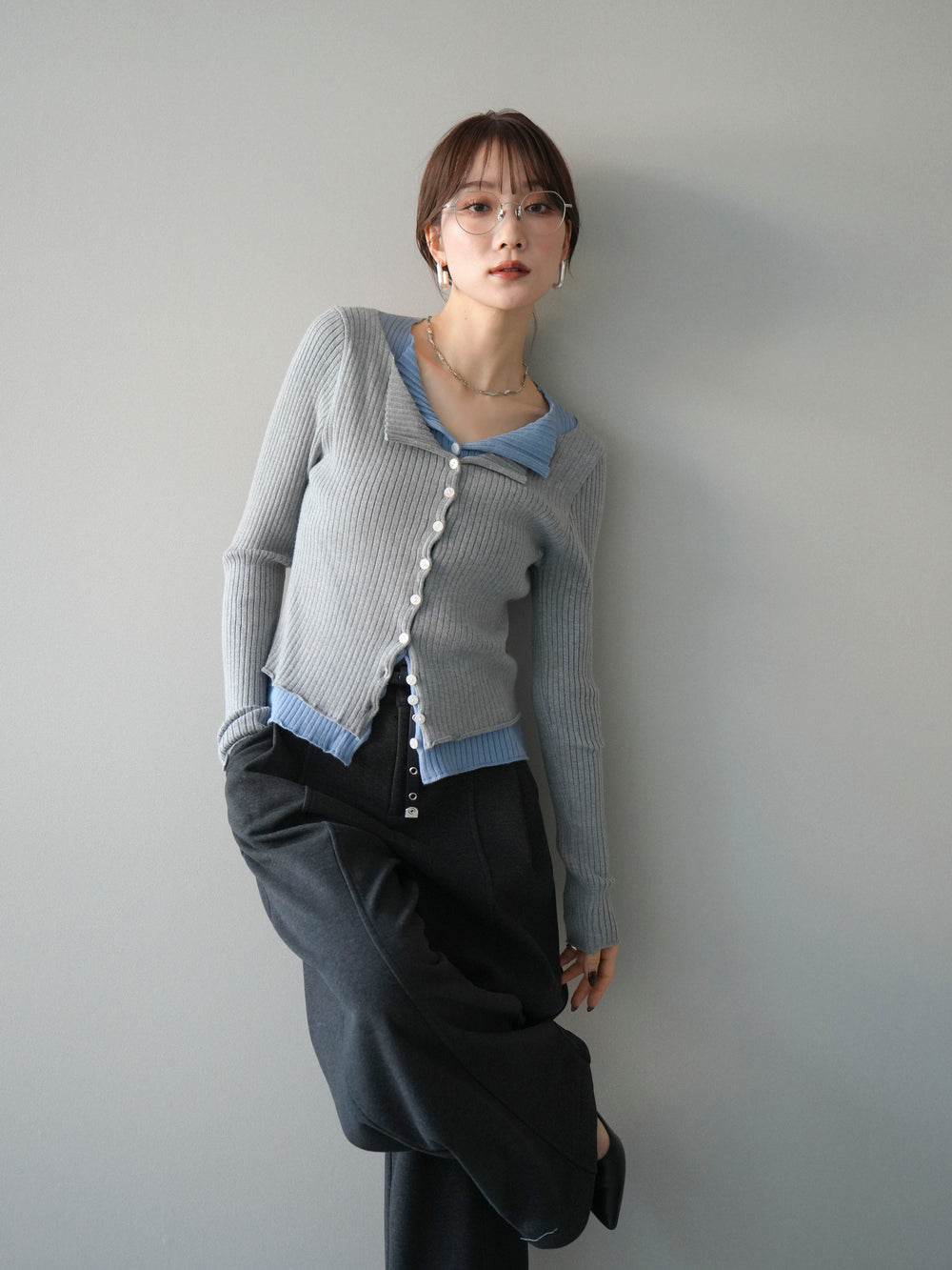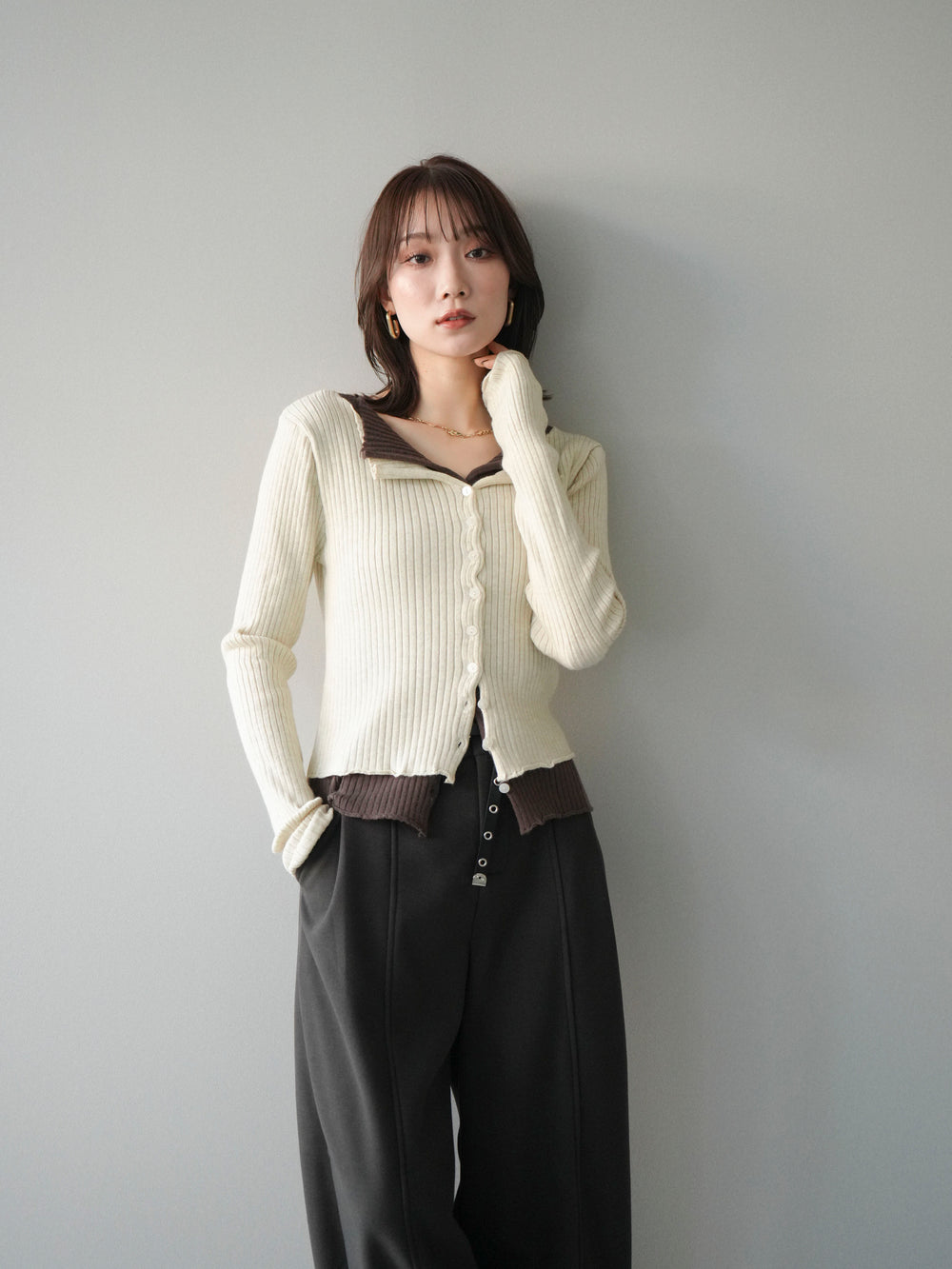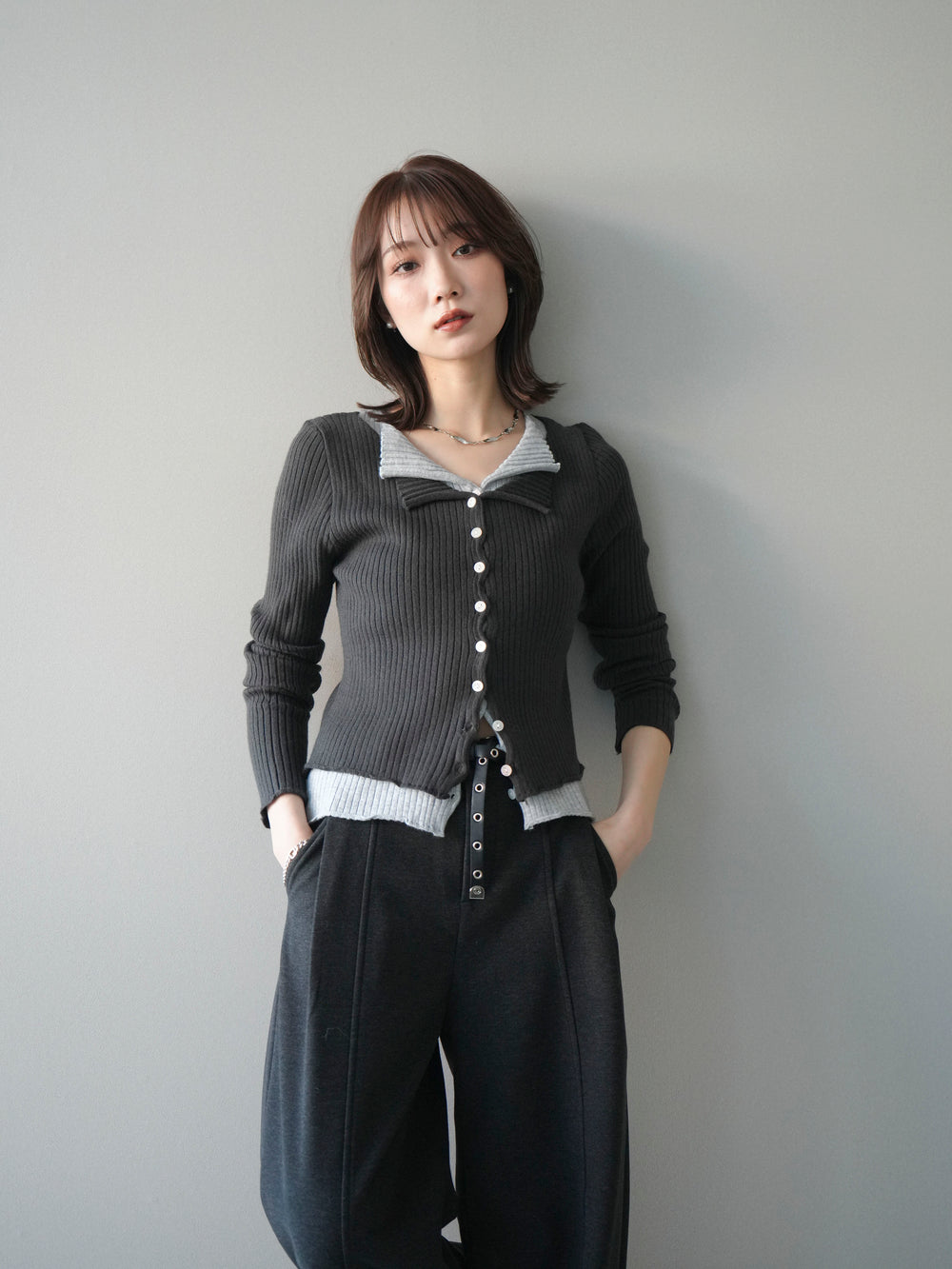 [予約]配色レイヤードリブニットカーディガン/charcoal