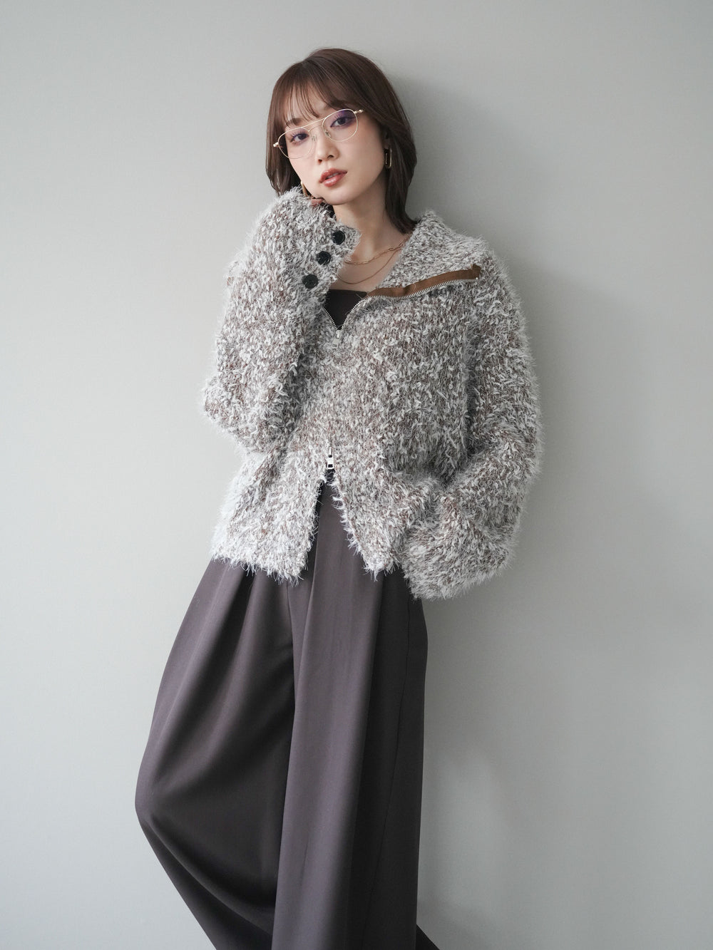 [予約]ミックスシャギージップニットカーディガン/brown