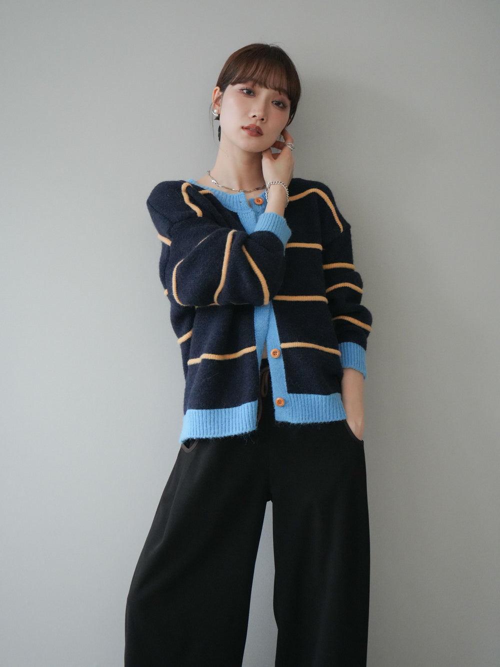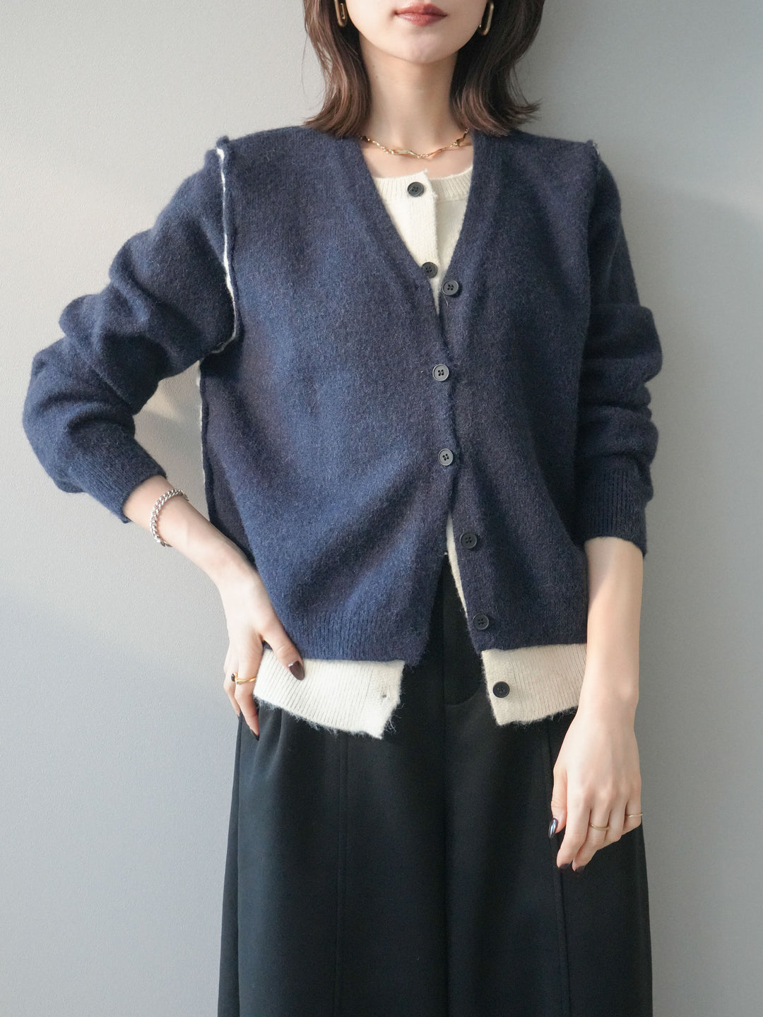 [予約]配色レイヤードニットカーディガン/navy