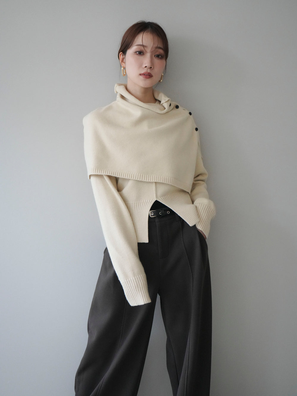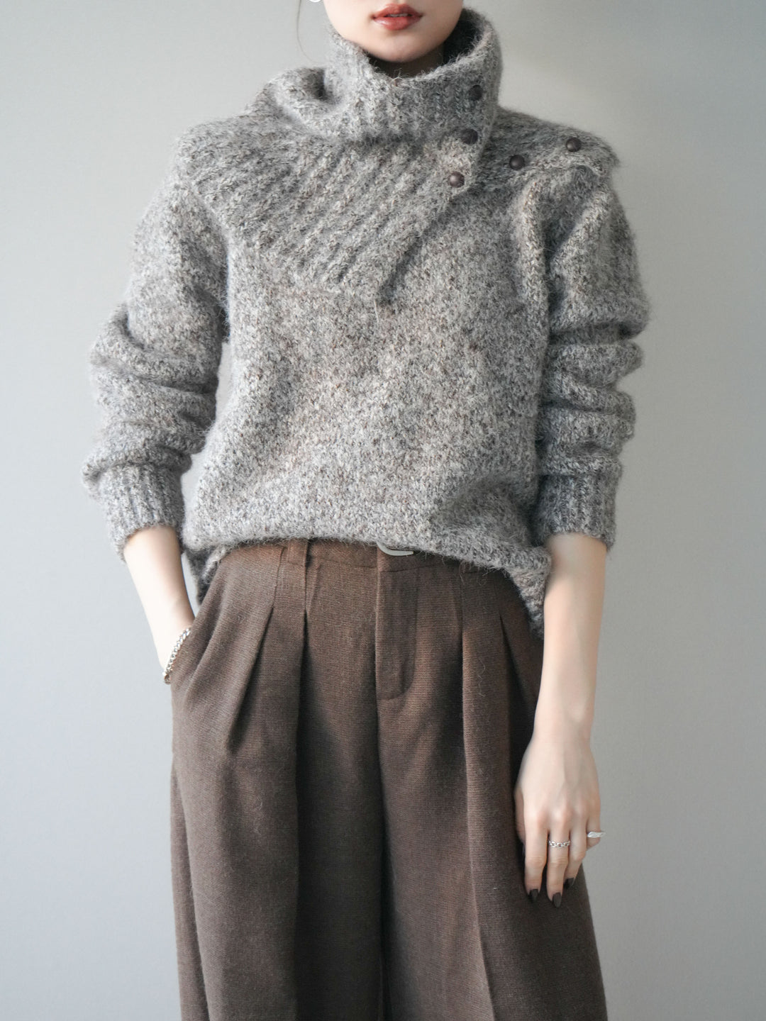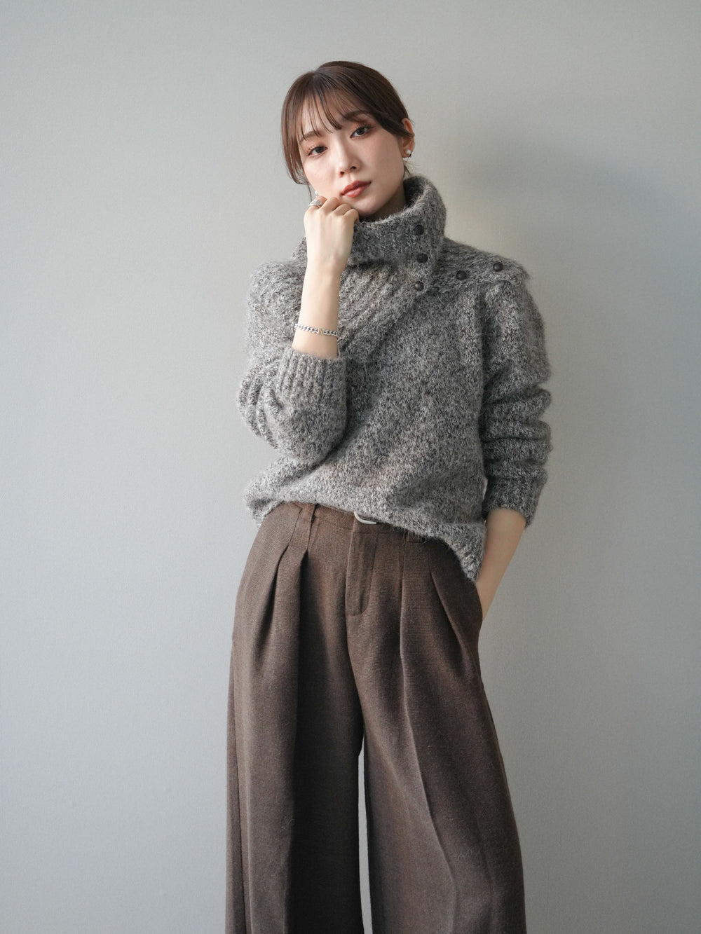 [予約]フロントスリットネックアンサンブルニット/charcoal